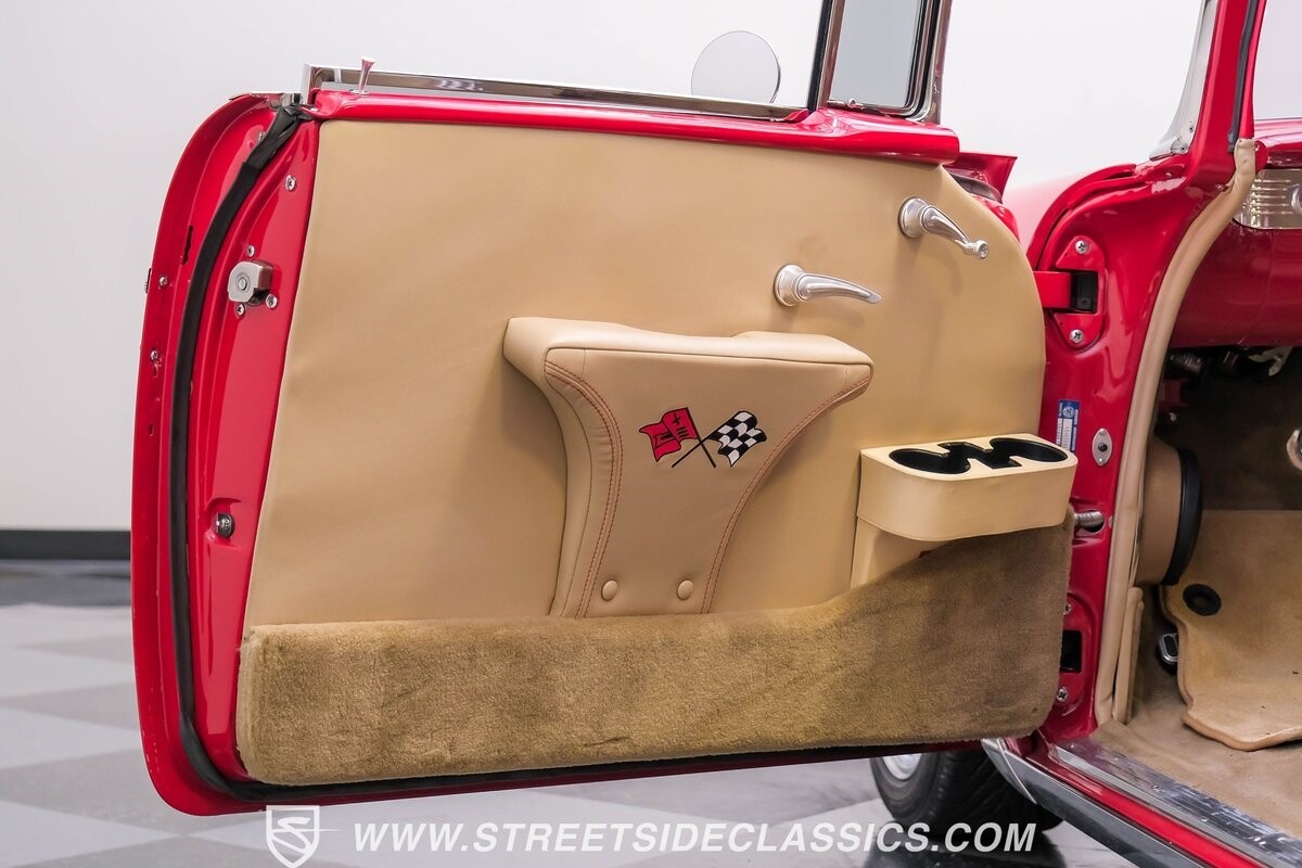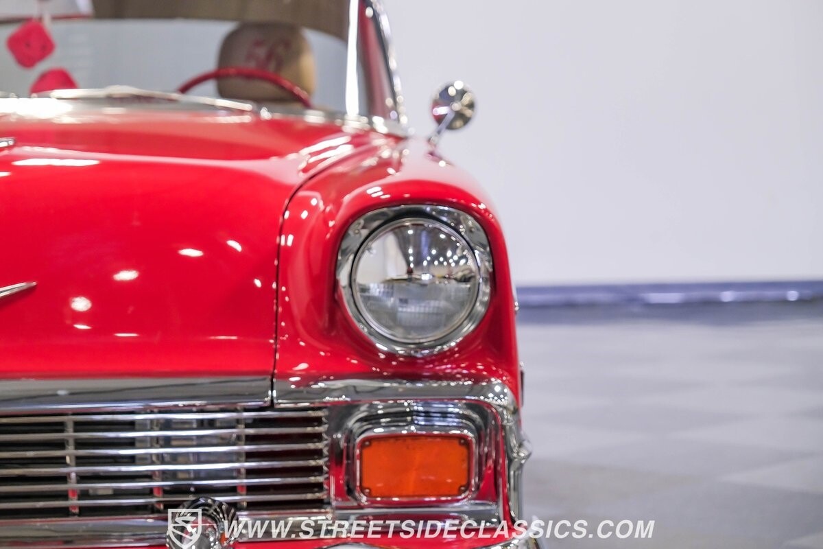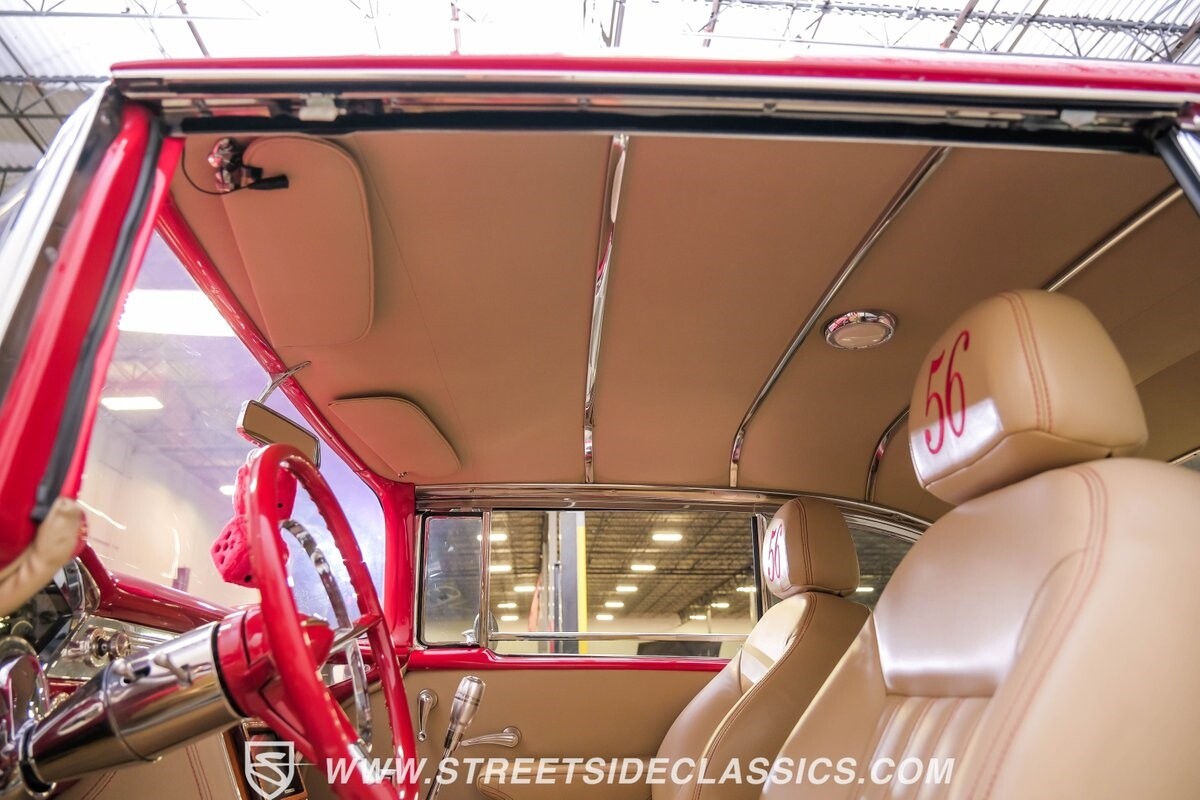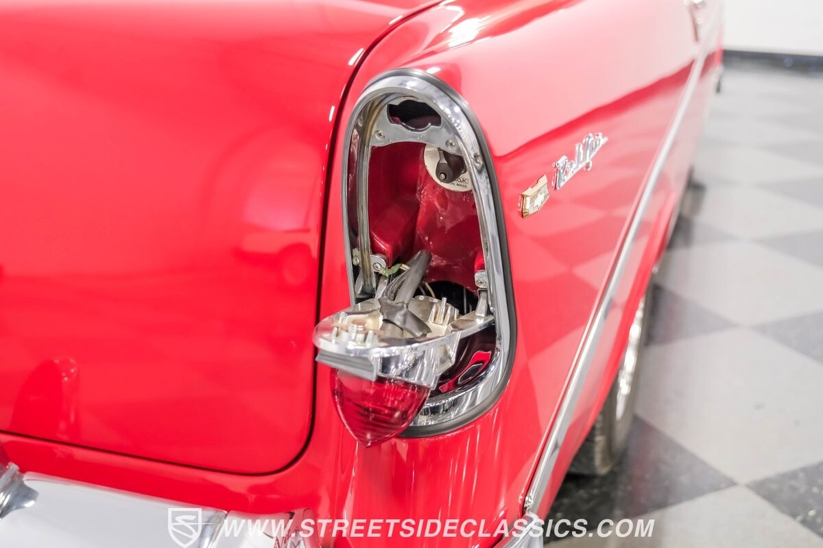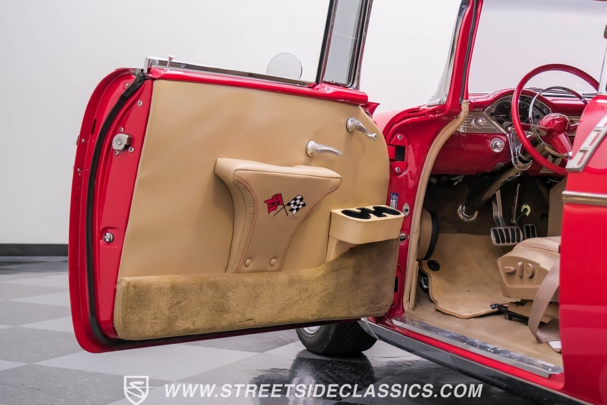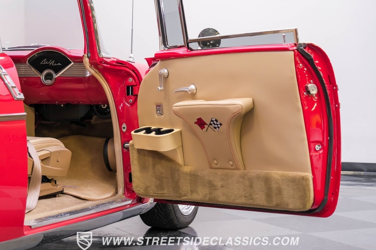 This car strikes a balance between an iconic classic and an all-out modern hot rod. The Fire Engine Red is close to the other colors available from Chevy in '56, and so it doesn't look out of place on this one. But there's a deep gloss and shine that instantly announces this is a modern and professional application. In fact, the full build only has about 1880 miles on it. And since brightwork is a big part of this icon, you can see that the full restoration made it a priority. The bumpers are mirror-like, the light bezels are intricate, and 1956's exclusive grille is proudly displayed. The '56 Bel Air had the unique style shared with no other Tri-Five where it rocketed up the side to make the car look sleeker and faster. So not only do we love that this trim looks excellent, but also that they took the time to get the body looking so good that it's like one unbroken piece through the door line. This inherent sleekness goes well with the upgraded performance appearance. Those large dual exhaust tips, fuel injection callouts, and 17-inch Billet Specialties wheels help add to the shine while also announcing it's something extra special.