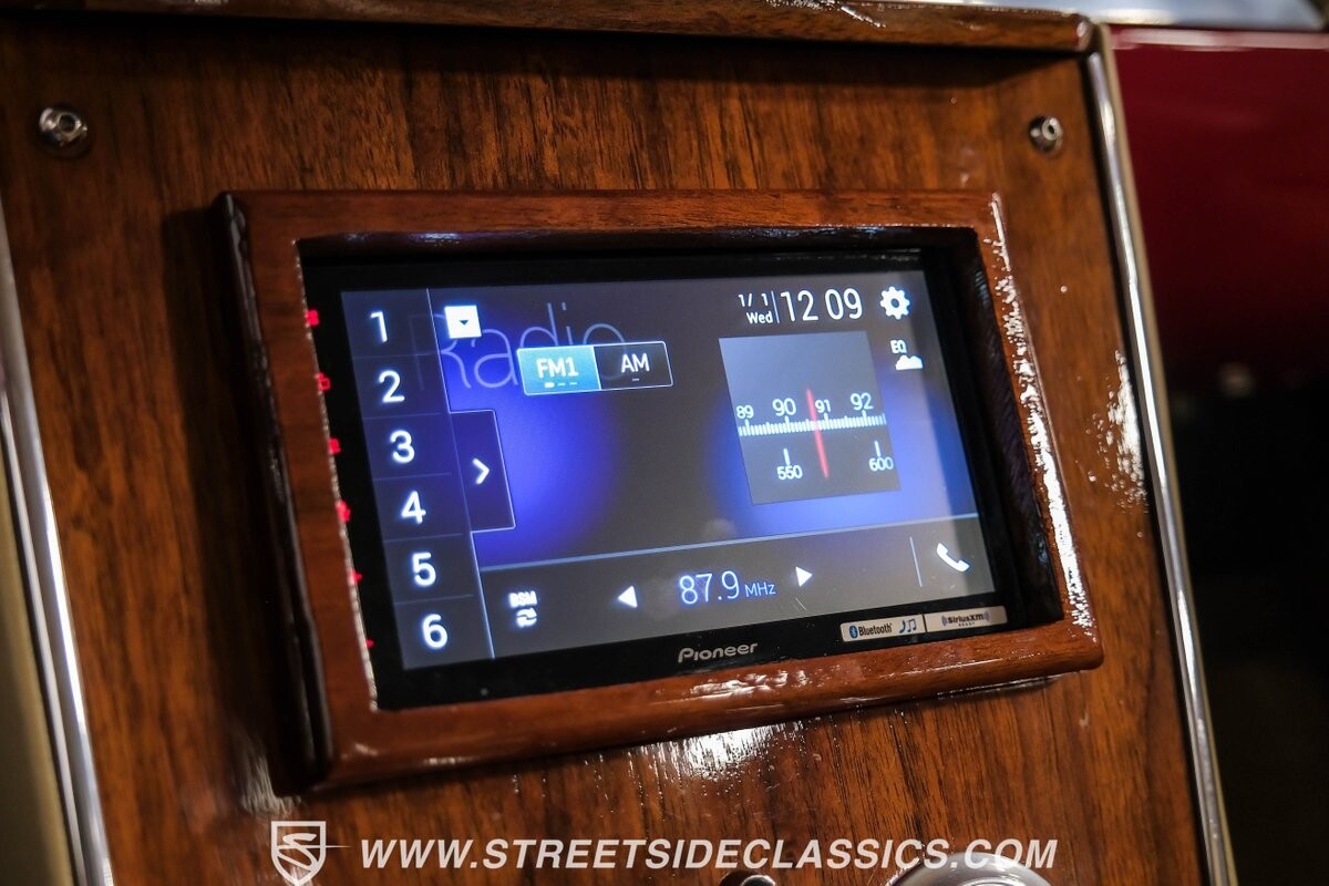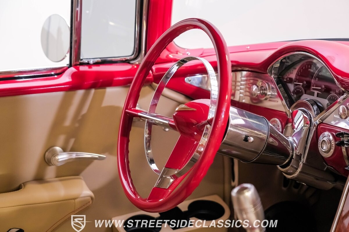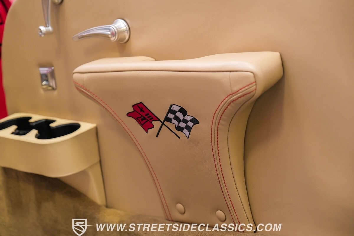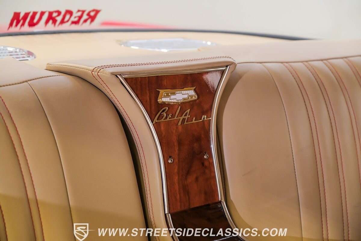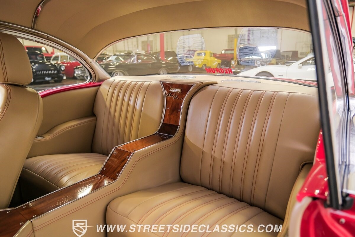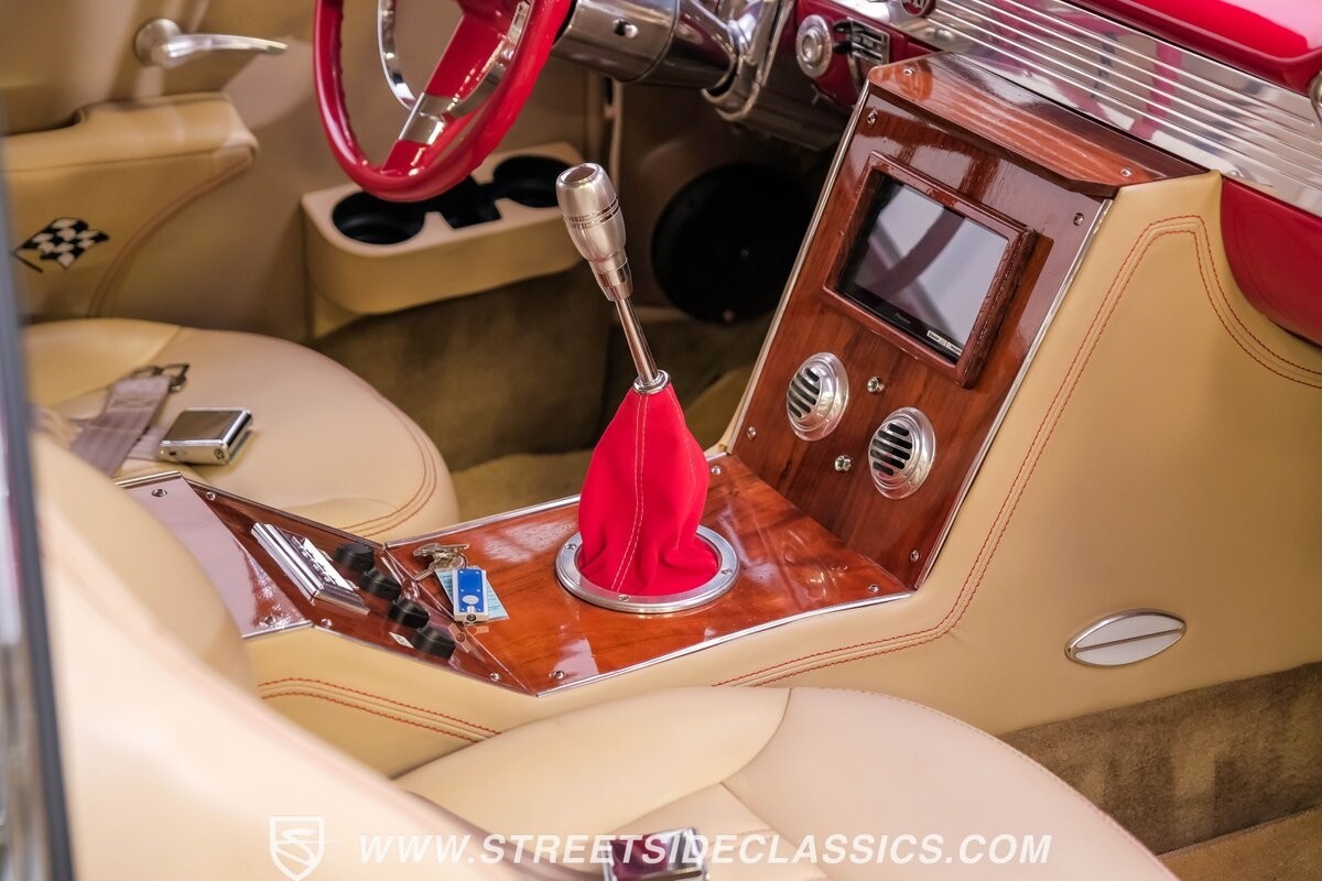 The interior is a full custom setup. In fact, the only thing that's likely going to remind you inside that this is a vintage Chevy is the twin cowl dash. Everyone gets their own-individual Ultraleather bucket seat with a custom center console running the full length of the interior. These seats are beautifully finished with nice details like red contrast stitching and the door panels were done to match. It's quite clean and complete where even the fully finished trunk looks like the perfect place to display some awards. There are plenty of luxury upgrades like cold-blowing air conditioning, power windows, and a touchscreen AM/FM/XM stereo with Bluetooth. The driver's seat is a true command position with a power-adjustable high-back bucket, an updated classic-style steering wheel on a tilt column, and full gauges with speedo and tach.