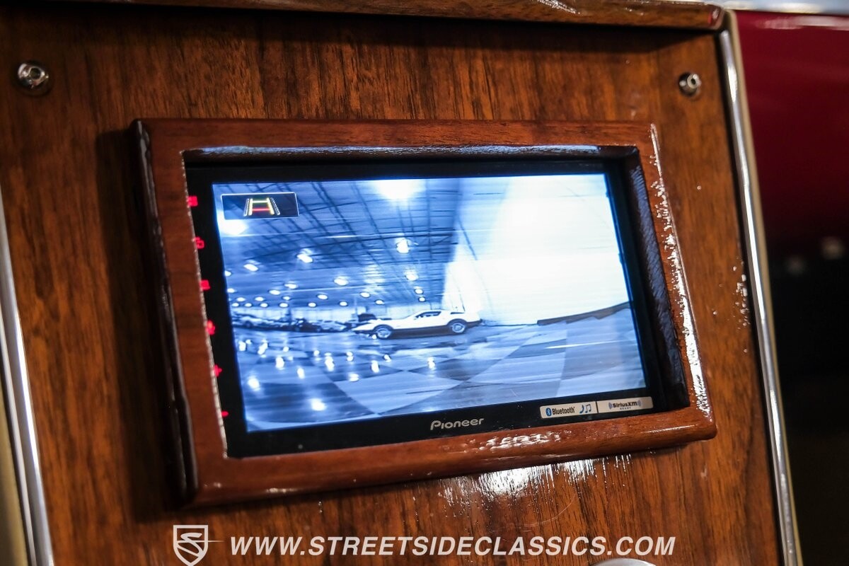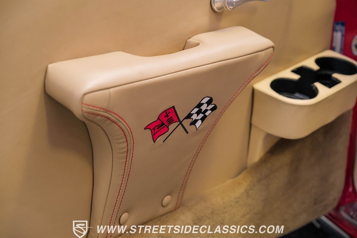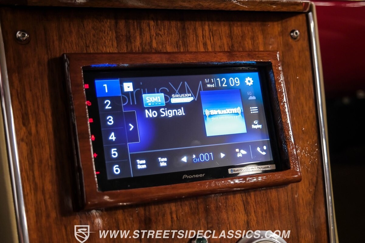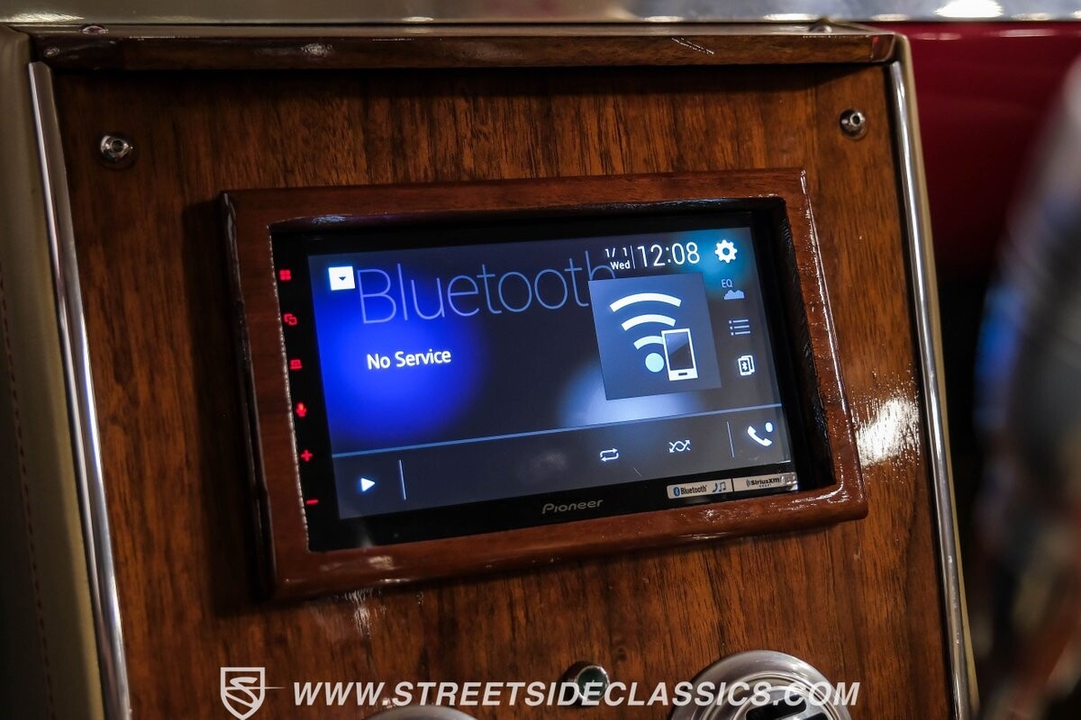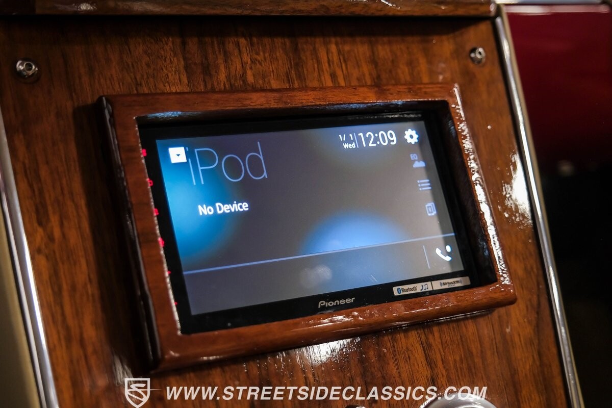 The interior is a full custom setup. In fact, the only thing that's likely going to remind you inside that this is a vintage Chevy is the twin cowl dash. Everyone gets their own-individual Ultraleather bucket seat with a custom center console running the full length of the interior. These seats are beautifully finished with nice details like red contrast stitching and the door panels were done to match. It's quite clean and complete where even the fully finished trunk looks like the perfect place to display some awards. There are plenty of luxury upgrades like cold-blowing air conditioning, power windows, and a touchscreen AM/FM/XM stereo with Bluetooth. The driver's seat is a true command position with a power-adjustable high-back bucket, an updated classic-style steering wheel on a tilt column, and full gauges with speedo and tach.