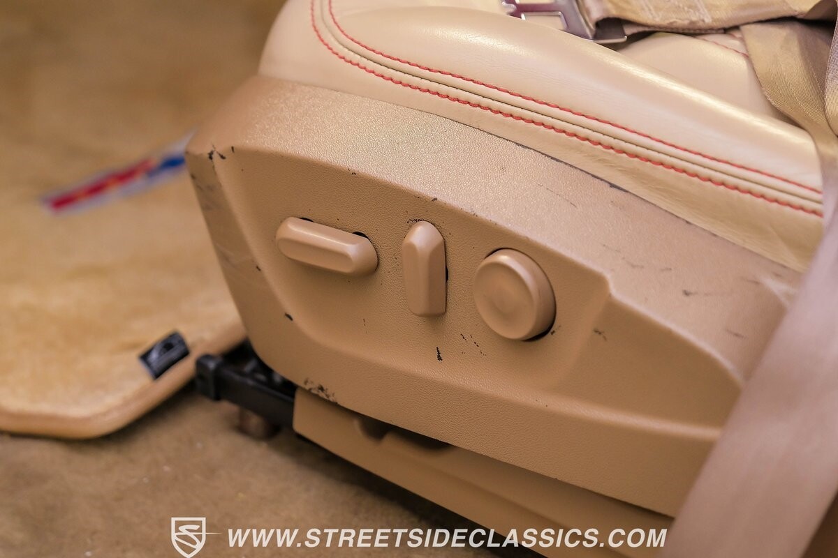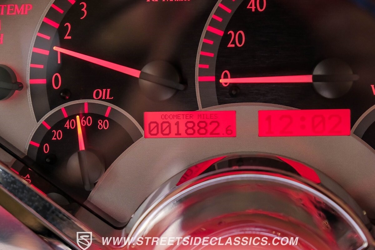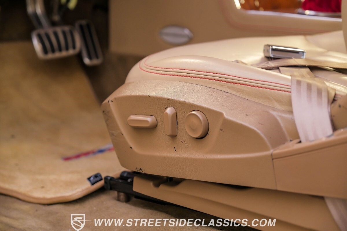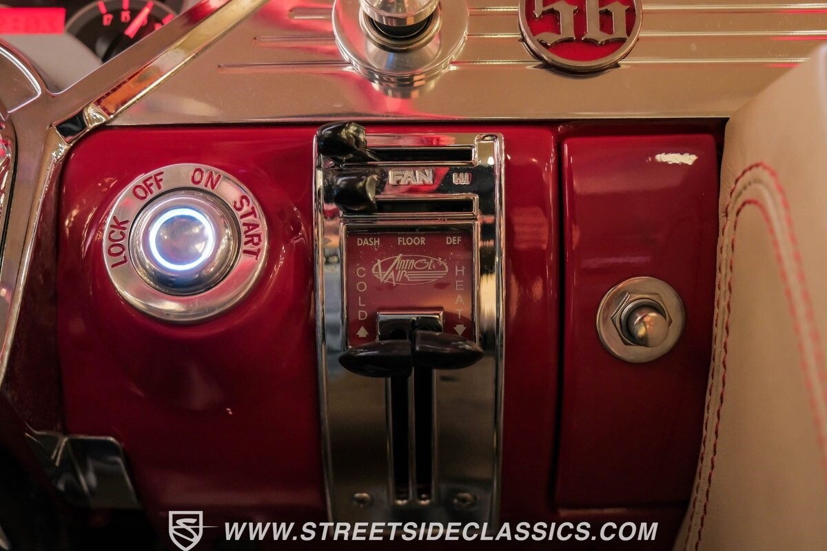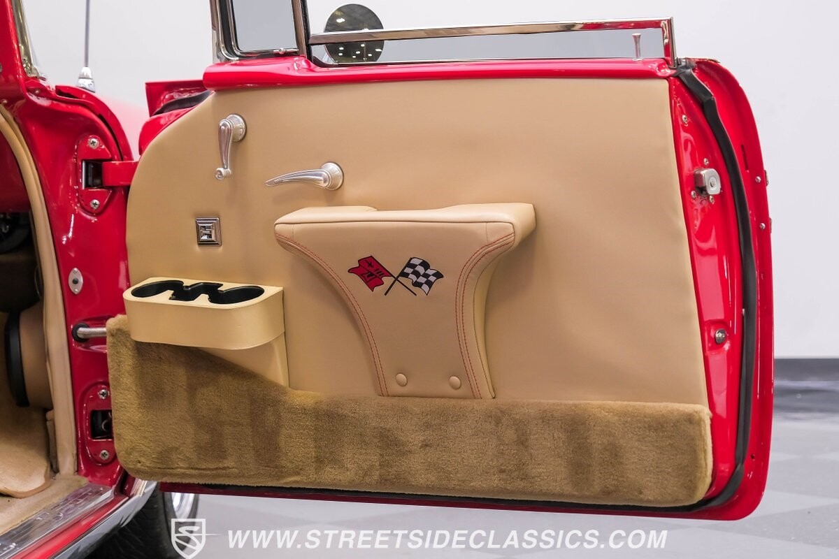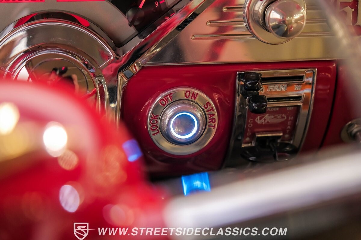The interior is a full custom setup. In fact, the only thing that's likely going to remind you inside that this is a vintage Chevy is the twin cowl dash. Everyone gets their own-individual Ultraleather bucket seat with a custom center console running the full length of the interior. These seats are beautifully finished with nice details like red contrast stitching and the door panels were done to match. It's quite clean and complete where even the fully finished trunk looks like the perfect place to display some awards. There are plenty of luxury upgrades like cold-blowing air conditioning, power windows, and a touchscreen AM/FM/XM stereo with Bluetooth. The driver's seat is a true command position with a power-adjustable high-back bucket, an updated classic-style steering wheel on a tilt column, and full gauges with speedo and tach.