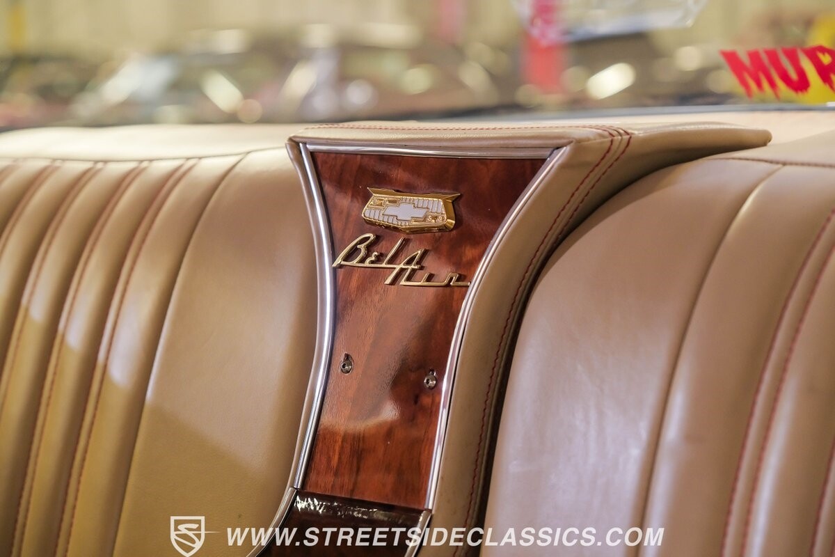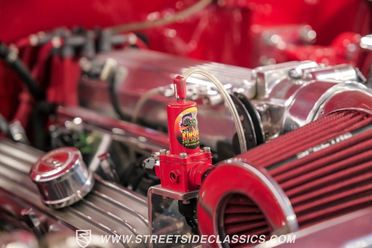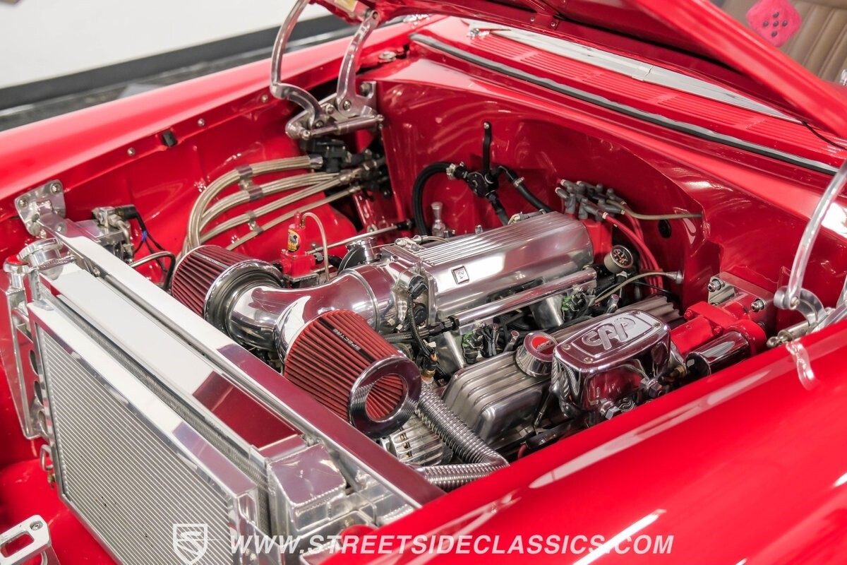 This engine bay has an award-worthy presentation all on its own. You see a huge investment in polished components that are presented beautifully against the smooth color-matched inner walls. The trim tag is not present to confirm that this was born a V8 Bel Air, but as you look at that shining heart, you realize that point is moot. Because while this carries the tradition of the best Tri Fives with a small block, this is now a Dart Little M 427 cubic-inch V8. More than just the small block weight with a big block displacement, this is built with power upgrades like aluminum heads, an aluminum intake, and headers feeding the dual exhaust. And there's a fuel injection system on top to deliver the best in power and consistency. Plus, the monster motor has all the right supporting components, like a serpentine belt system, an MSD ignition, the battery mounted in the trunk for better weight distribution, and Be Cool aluminum radiator w/dual electric fans. The big power V8 feeds the stout 4L80E four-speed automatic transmission. It's a strong setup with a tubular A-arm front end, a triangulated four-link rear, adjustable coilovers all around, and a reinforced frame. It's all great for performance upgrades, but don't forget that the transmission has overdrive for the highway. So no matter if it's blacktop domination or weekend cruising, you'll appreciate features like power steering, modern performance tires, and Wilwood four-wheel disc brakes with drilled & slotted rotors.