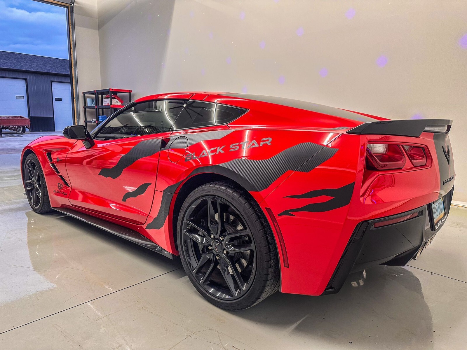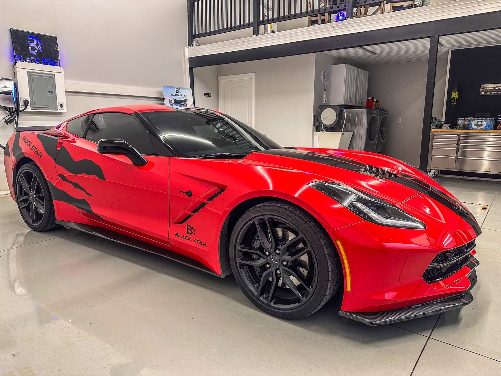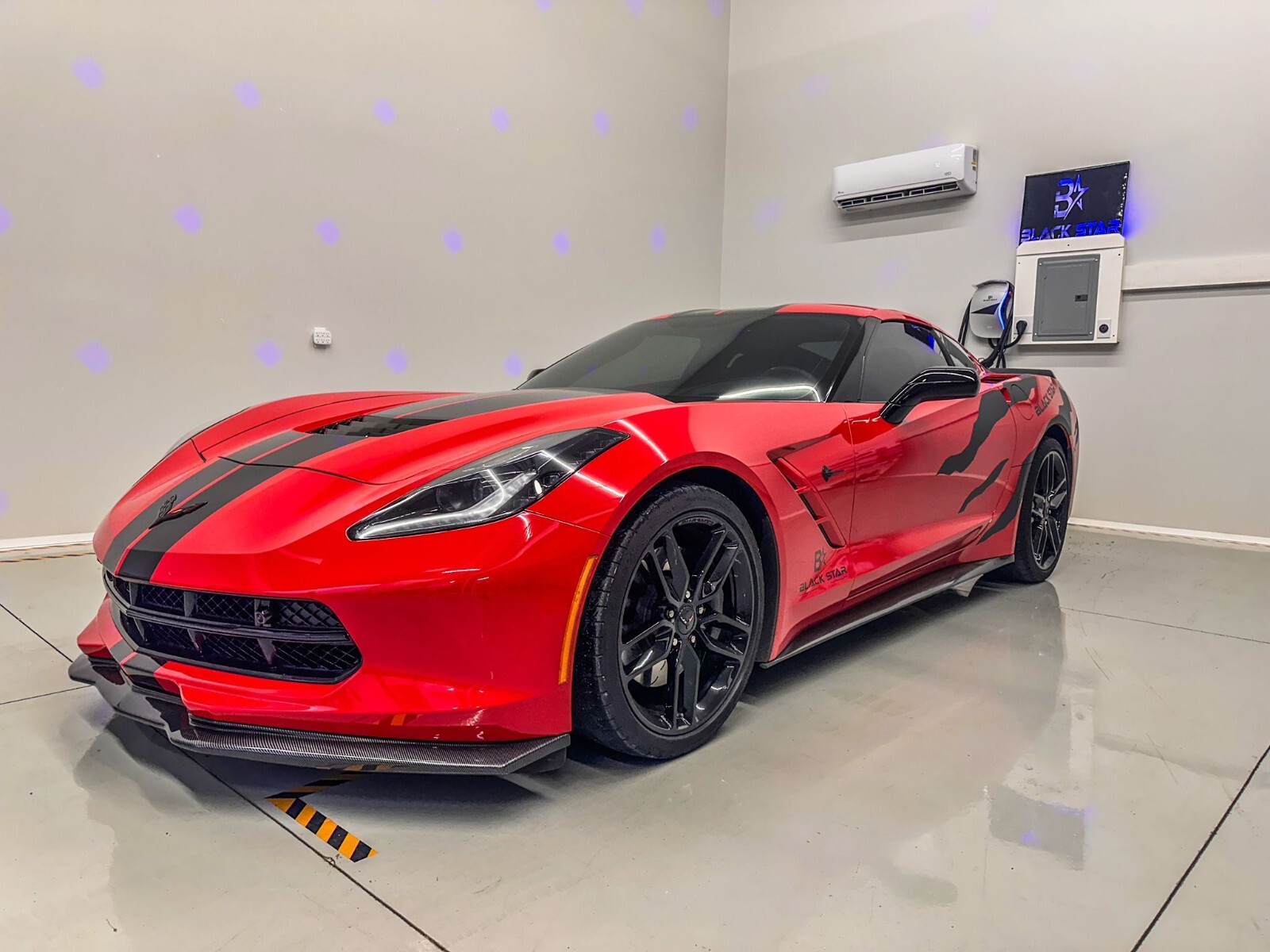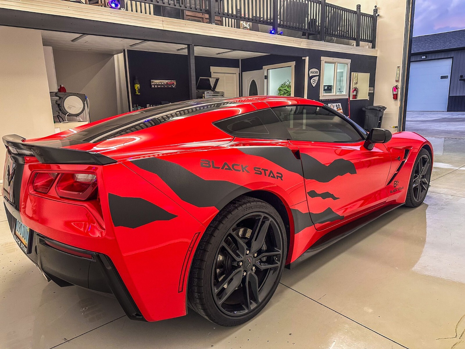 Black Star Corvette. No Reserve . Custom, tastefully modified professionally upgraded with stage 2 spoiler kit. Racing stripes, and raised weive carbon fiber graphics. Tinted, 25 on sides 50 on front. Carbon fiber hood insert. 7 speed manual with rev match! 25k miles. Car is gorgeous and a head turner. Exhaust tone is selectable, roof is removable. Heated/cooled seats, heads-up display, g-force meter, bose sound system. Everything works as it should, regularly serviced by dealership, nothing to hide or complain about, car is clean, runs beautifully and ready to go! Shipping available anywhere.