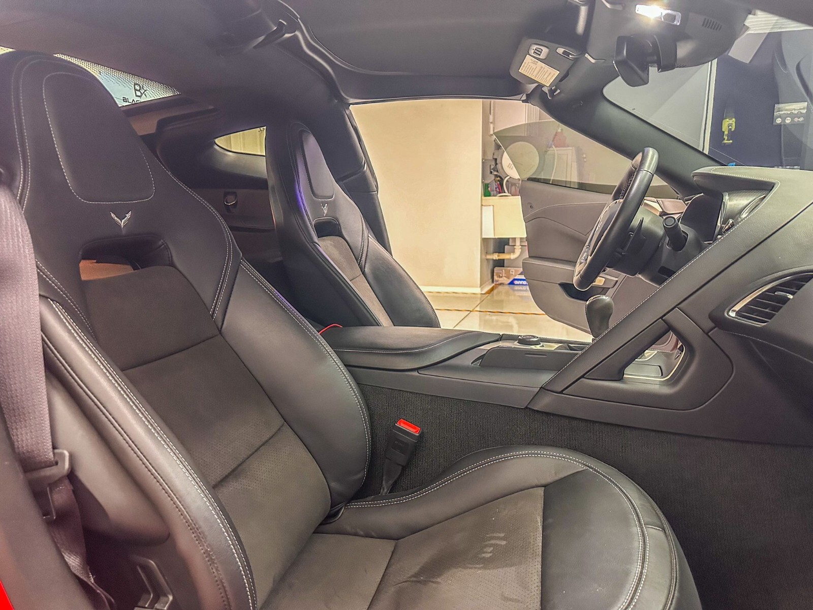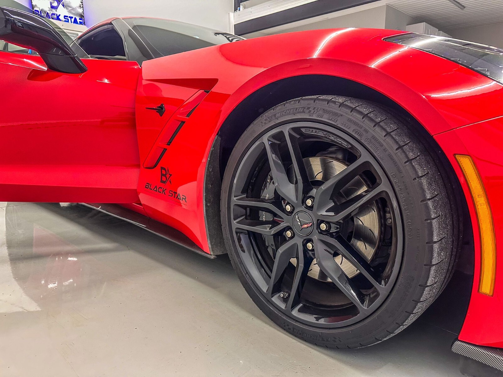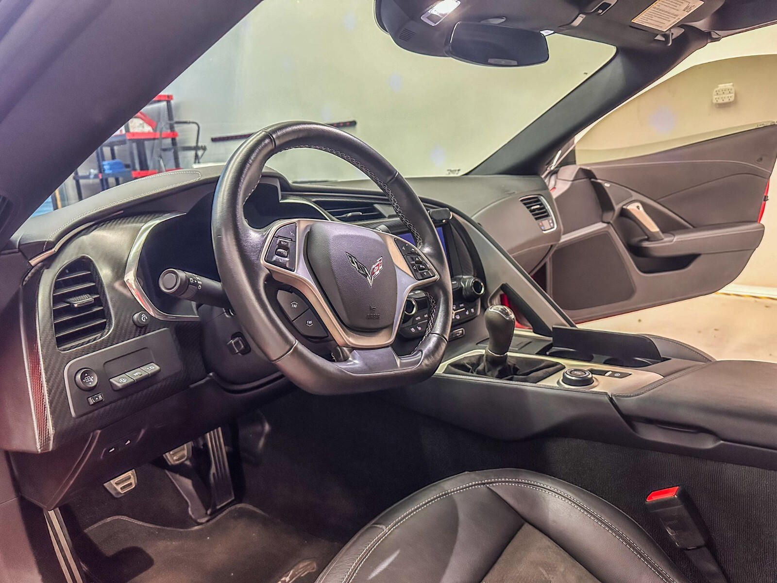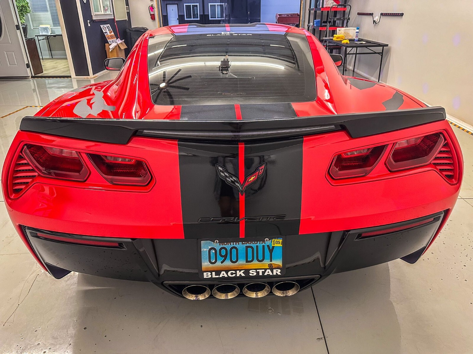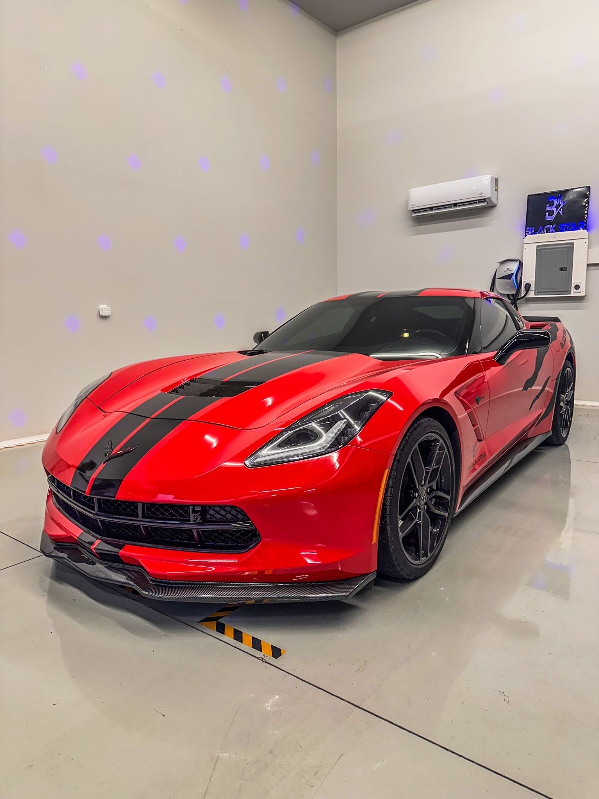 Black Star Corvette. No Reserve . Custom, tastefully modified professionally upgraded with stage 2 spoiler kit. Racing stripes, and raised weive carbon fiber graphics. Tinted, 25 on sides 50 on front. Carbon fiber hood insert. 7 speed manual with rev match! 25k miles. Car is gorgeous and a head turner. Exhaust tone is selectable, roof is removable. Heated/cooled seats, heads-up display, g-force meter, bose sound system. Everything works as it should, regularly serviced by dealership, nothing to hide or complain about, car is clean, runs beautifully and ready to go! Shipping available anywhere.
