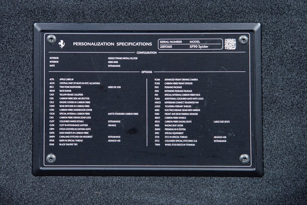 This SF90 Spider was sold new by Ferrari of Houston. It comes with Ferrari warranty until 3/23/2026 and no-cost annual maintenance until 3/23/2030. It has completed a comprehensive 101 Point Ferrari Approved inspection, has had all recalls/technical updates performed, and is complete with all keys, books, tools, car cover, and battery charger.