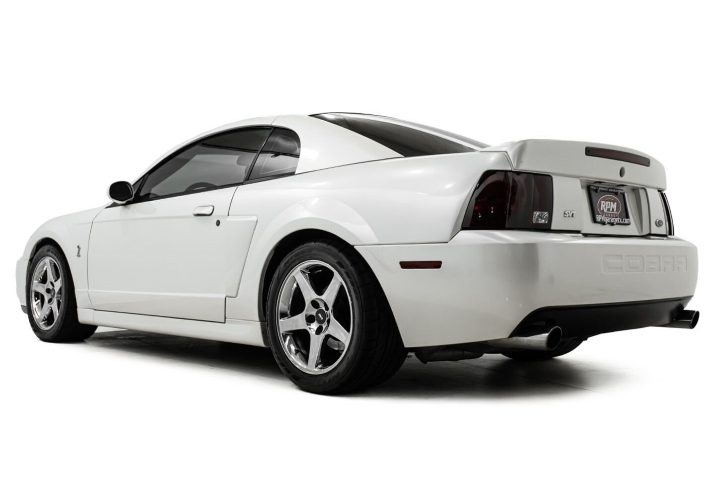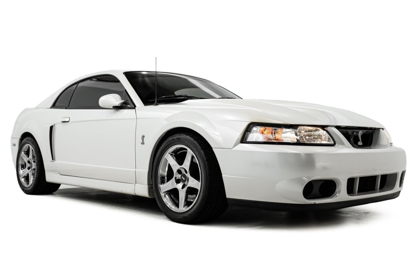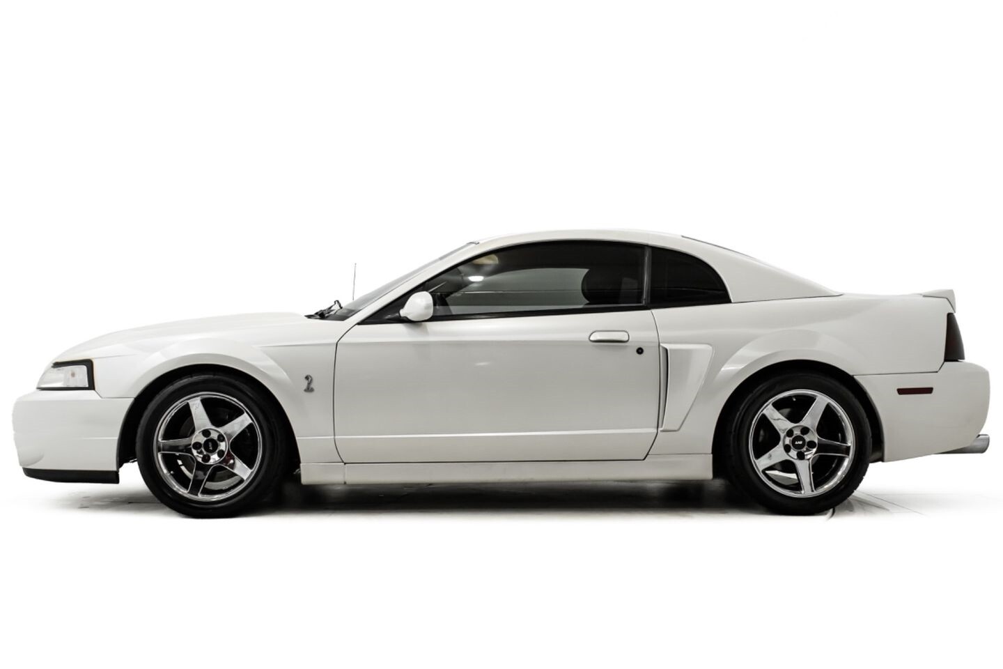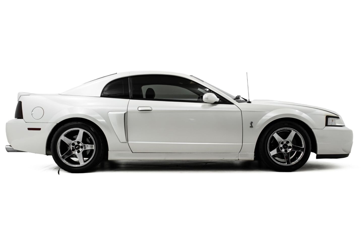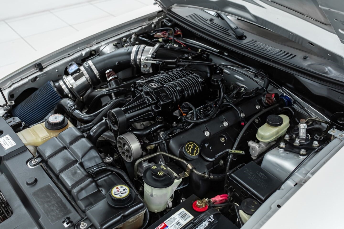 This 2003 Ford Mustang SVT Cobra is a legendary American performer that has been taken to the next level with several modifications. Under the hood is a supercharged 4.6-liter V8 engine that produced 390 horsepower and 390 lb-ft of torque from the factory, all of which is sent through a six-speed manual transmission to the rear wheels. The engine is not stock, however, having received a Stage IV Steggy ported blower, a 2.76" supercharger pulley, JBA shorty headers, a JBA catless X-pipe, a Dragon throttle body, 60lb Deka injectors, and performance tuning, among many other modifications. This aggressive build comes equipped with chrome-finished OEM 17" SVT wheels wrapped in Nitto NT555 Extreme tires, while the body is finished in Oxford White. In the interior, this Mustang SVT Cobra offers leather sport seats, white ball shift knob, a leather steering wheel, "SVT" gauges, single-zone climate controls, and a stereo system with CD and AM/FM radio, truly making this car the complete package.