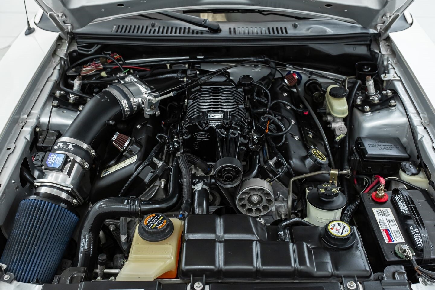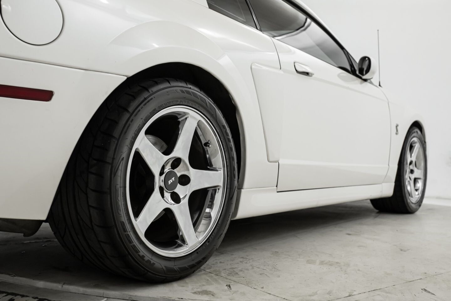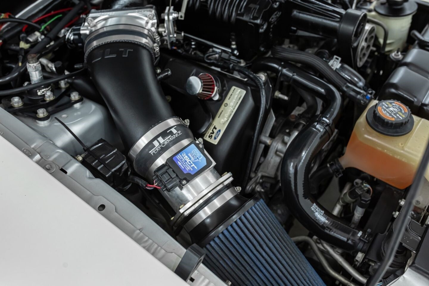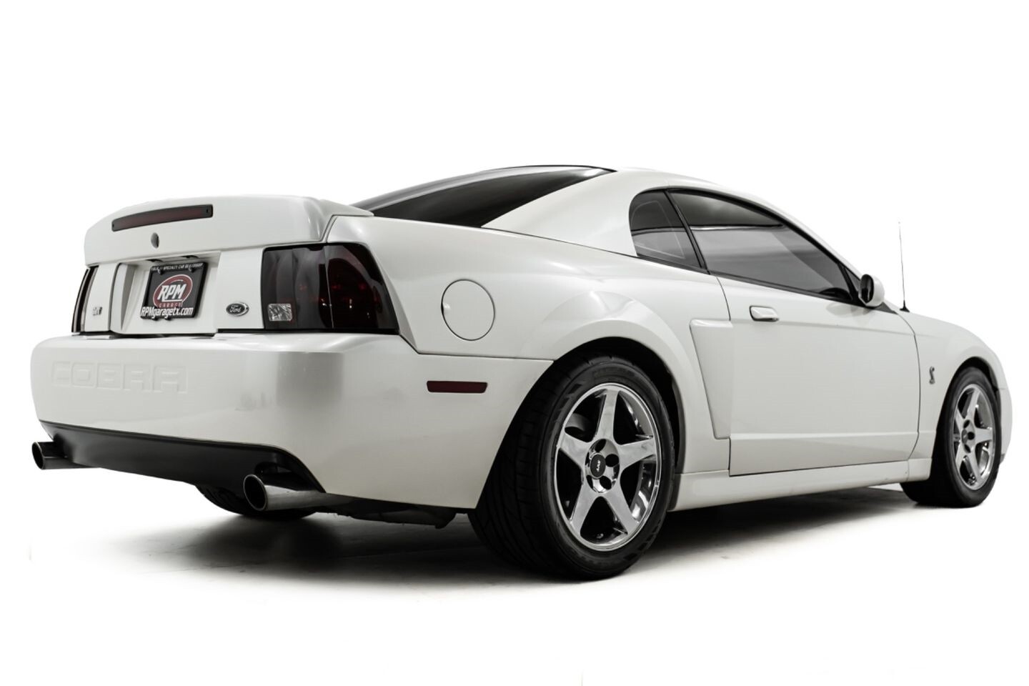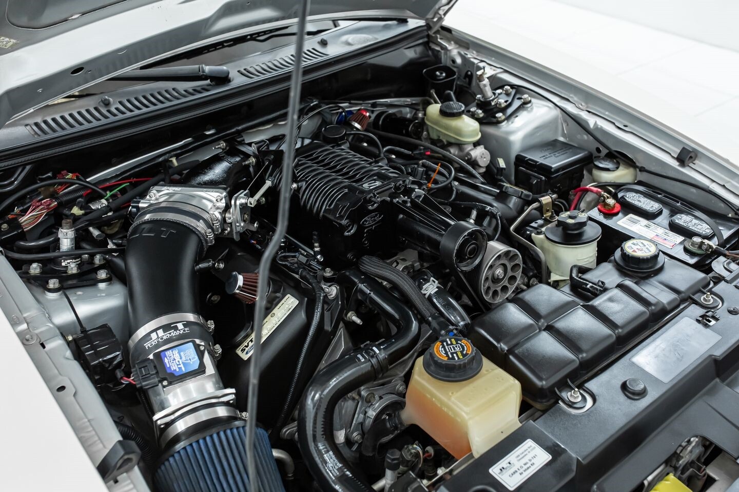 This 2003 Ford Mustang SVT Cobra is a legendary American performer that has been taken to the next level with several modifications. Under the hood is a supercharged 4.6-liter V8 engine that produced 390 horsepower and 390 lb-ft of torque from the factory, all of which is sent through a six-speed manual transmission to the rear wheels. The engine is not stock, however, having received a Stage IV Steggy ported blower, a 2.76" supercharger pulley, JBA shorty headers, a JBA catless X-pipe, a Dragon throttle body, 60lb Deka injectors, and performance tuning, among many other modifications. This aggressive build comes equipped with chrome-finished OEM 17" SVT wheels wrapped in Nitto NT555 Extreme tires, while the body is finished in Oxford White. In the interior, this Mustang SVT Cobra offers leather sport seats, white ball shift knob, a leather steering wheel, "SVT" gauges, single-zone climate controls, and a stereo system with CD and AM/FM radio, truly making this car the complete package.