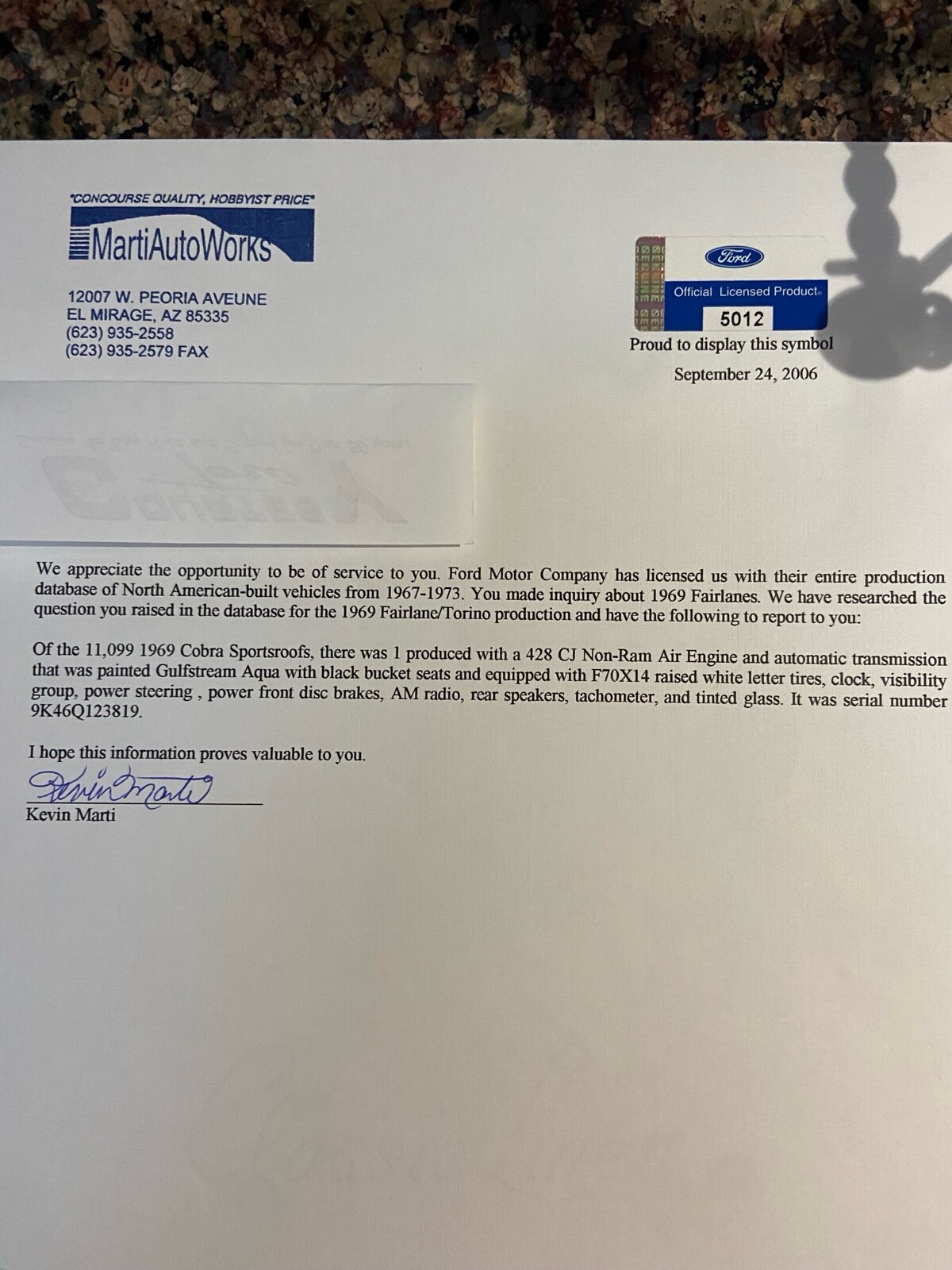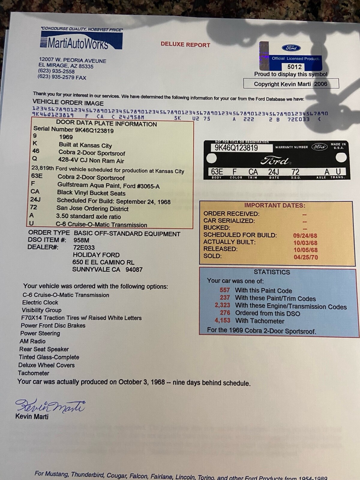 This is a Q code 428 CJ non ram air, Auto C-6, Gulfstream Aqua Paint #3065-A, Black bucket seat interior, Column shift,no console, 3.50 standard axle ratio,electric clock, visibility group, tachometer , rear seat speakers, tinted glass.