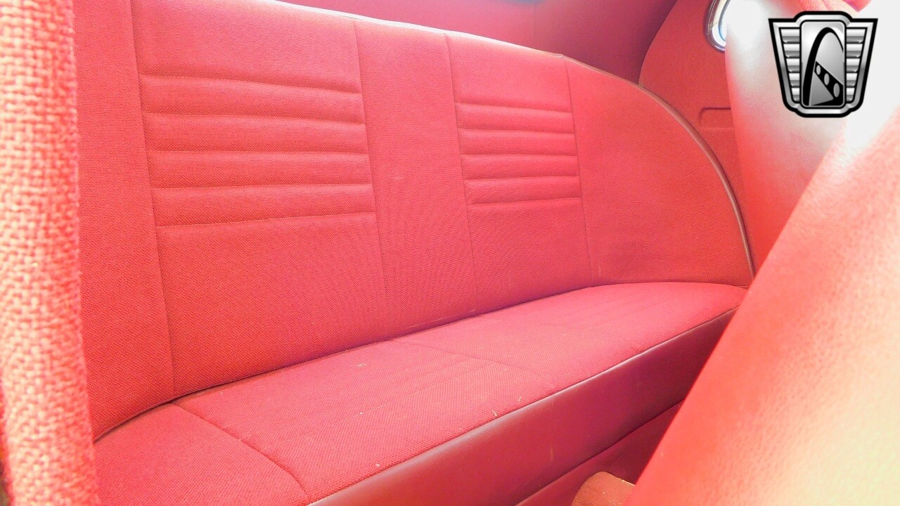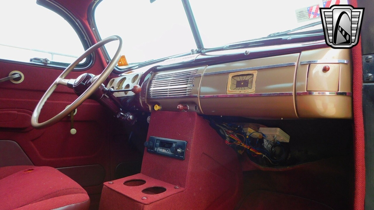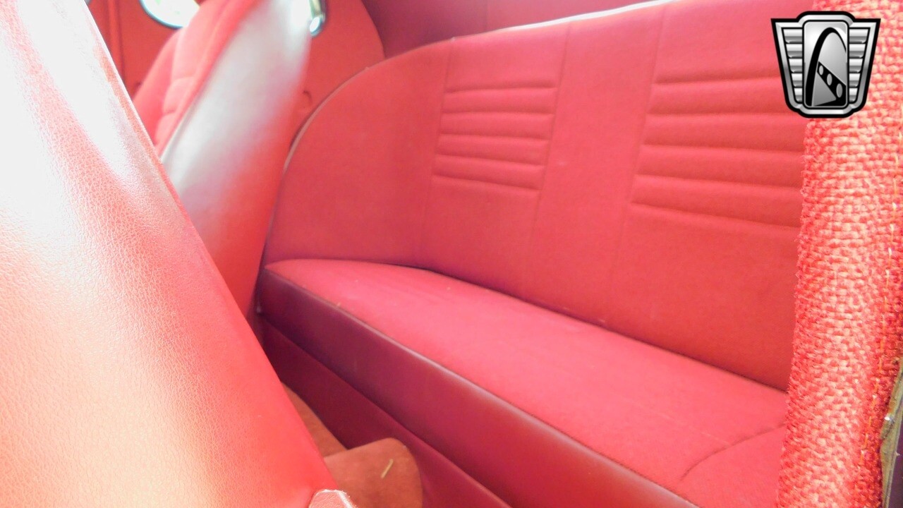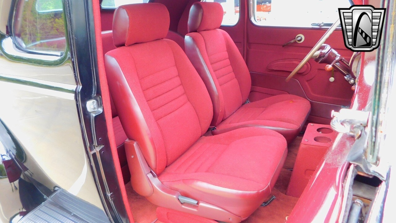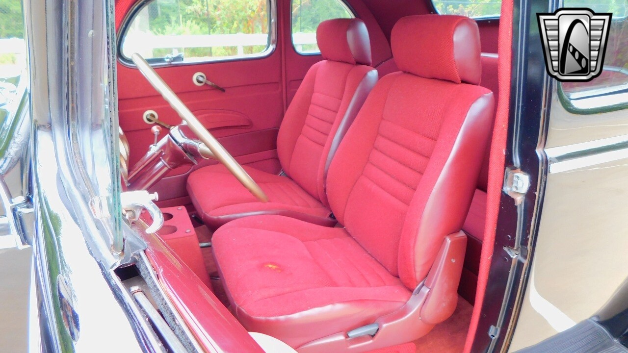 The interior of this Ford Coupe is a testament to classic design, featuring red cloth upholstery that provides a warm and inviting atmosphere. It is equipped with seatbelts for both the driver and passengers.