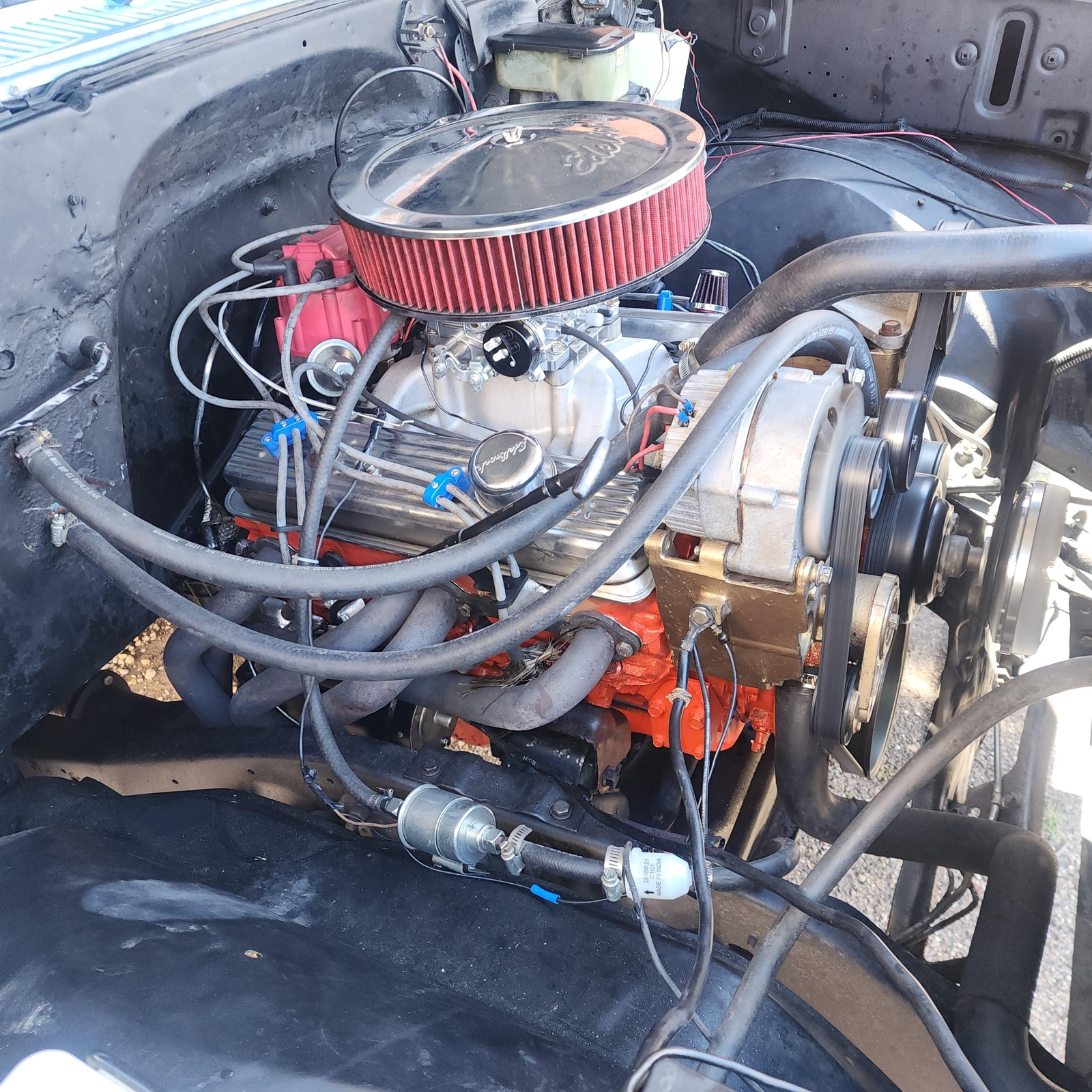 350 V8 coupled to a 5 speed manual transmission.