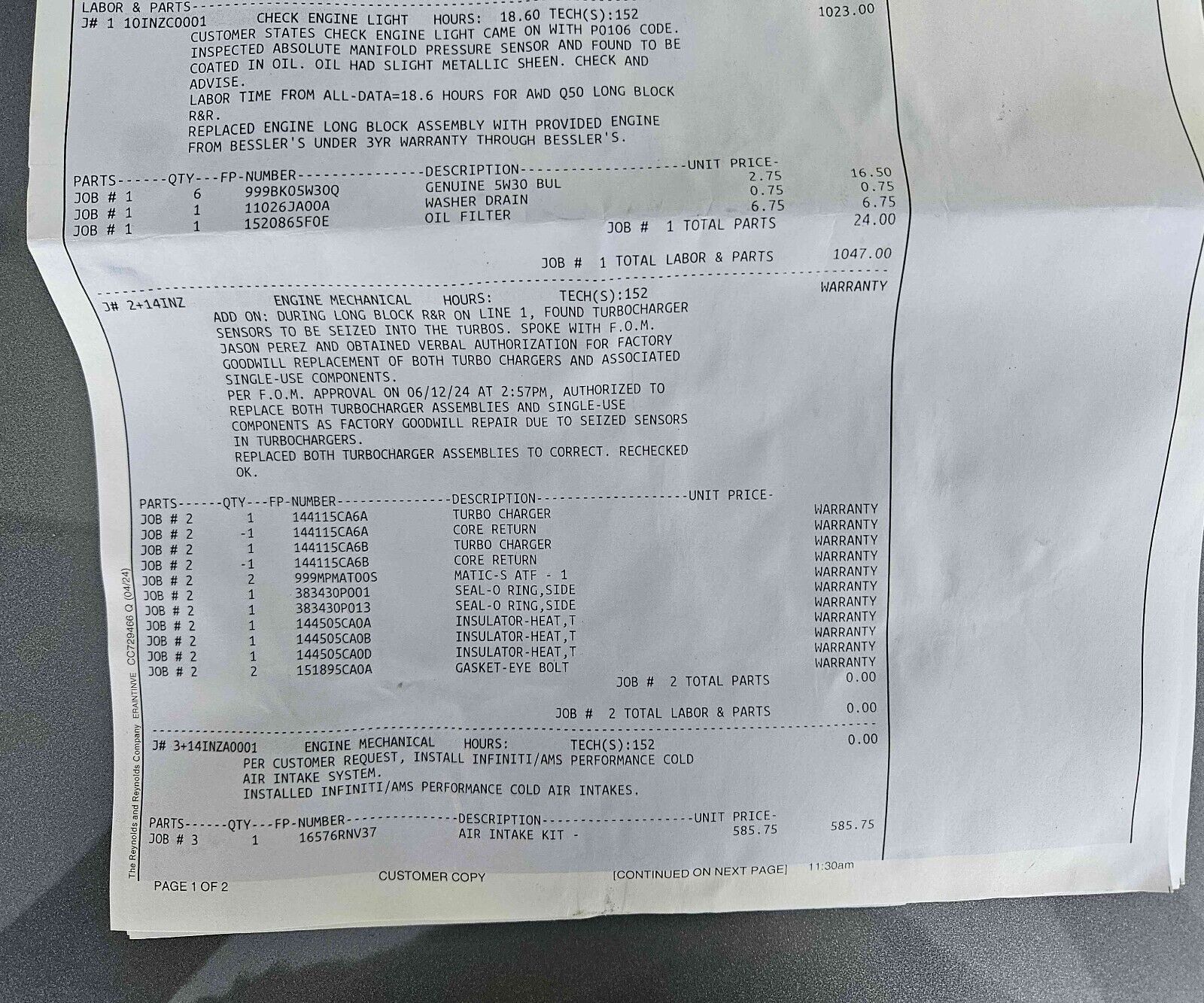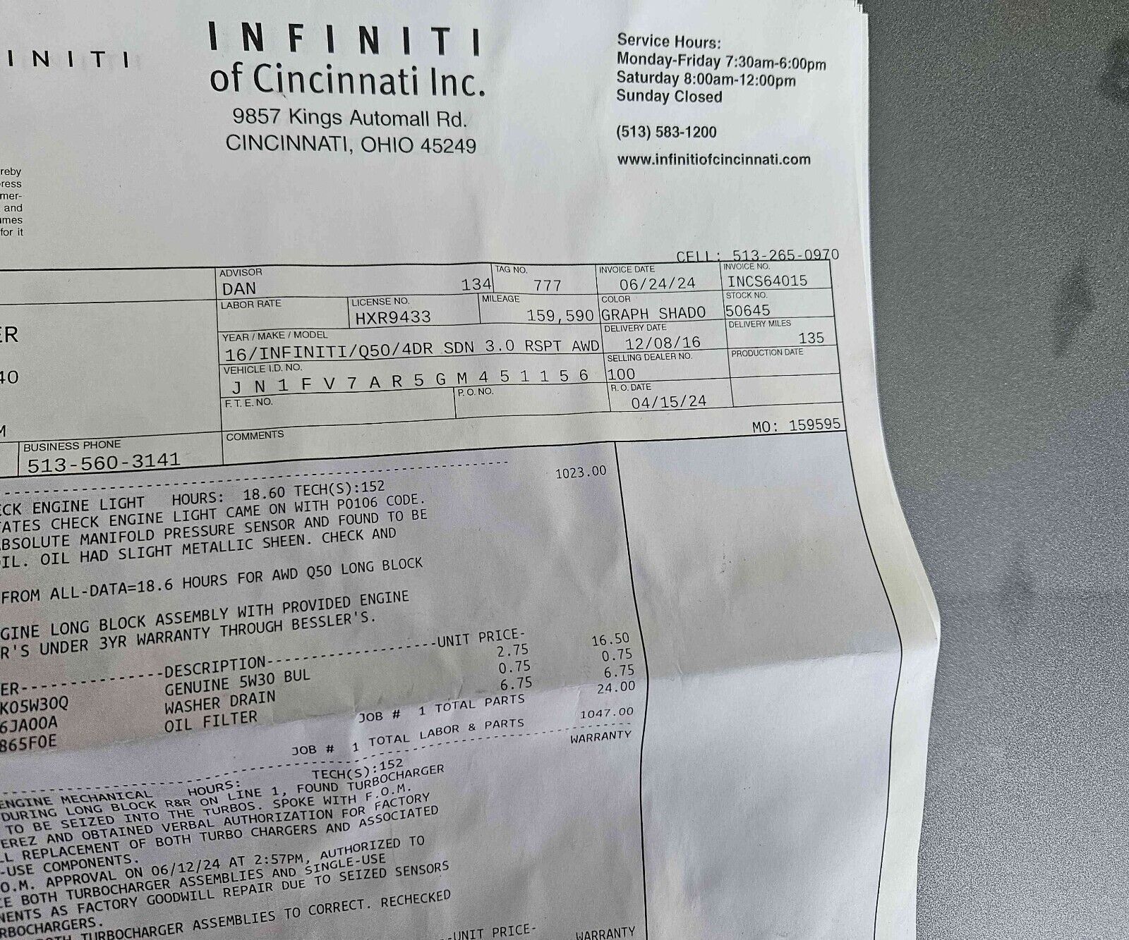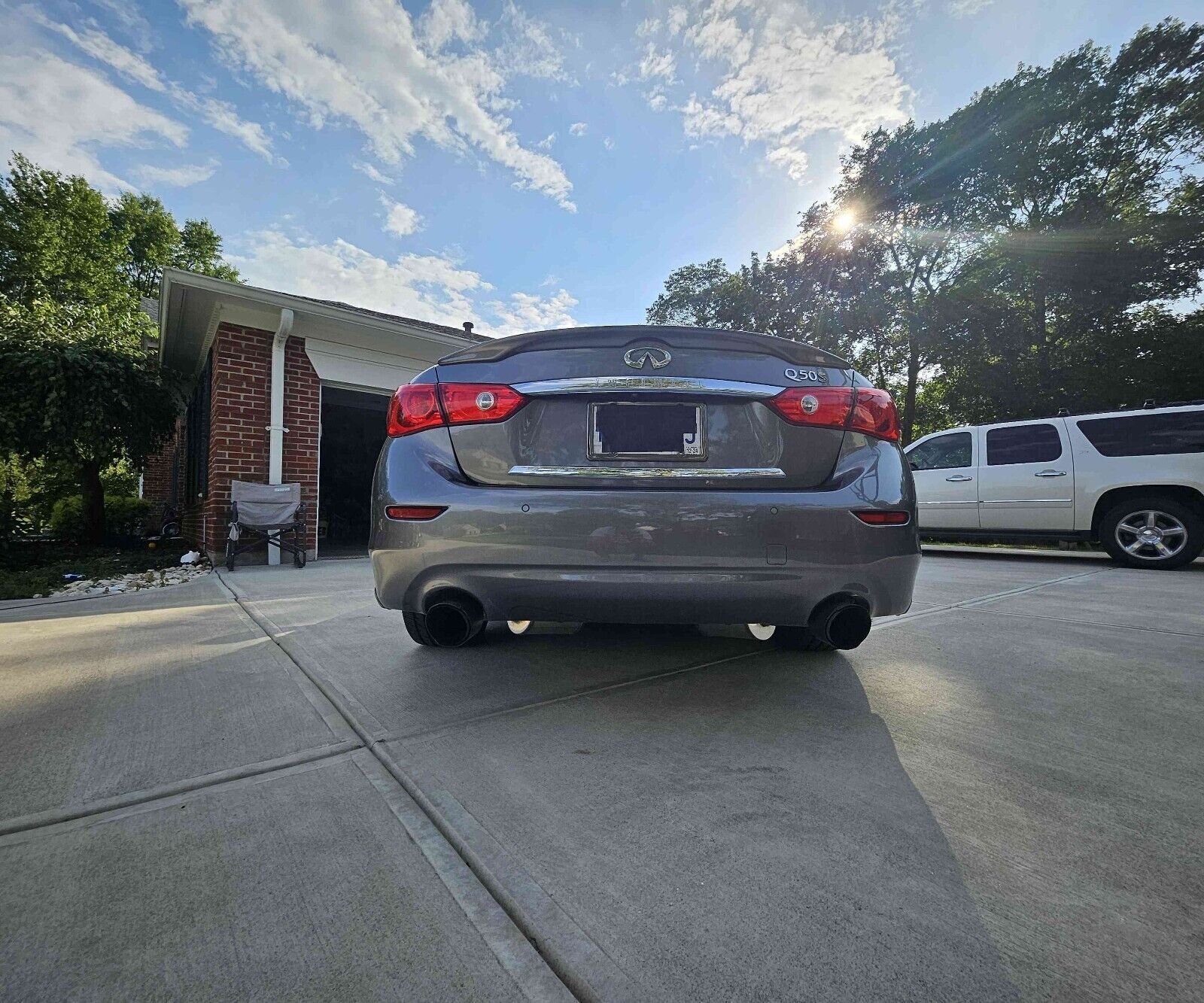 • New Engine only has 30,500 miles (replaced 6/20/2024 by Infiniti dealer) • 2 Brand New Twin Turbos with less than 1000 miles • New AMS air intake also has less than 1000 miles • Everything was handled directly through Infiniti Cincinnati and have paperwork to support engine mileage, new twin turbos, etc. • New Stillen CatBack Exhaust sounds mean! • 420+ HP with Intake and Exhaust • Odometer has just over 160,000 miles..New Engine and Turbos running like NEW! • Original Owner • Garaged entire life • All Premium Fuel Fill Ups • Consisent 5-7k mile oil Change Record through Infiniti See paperwork attached showing this engine has just over 30k miles. 2 NEW TURBOS! Bridgestone Potenza tires with less than 15k miles. Also has 1 spare complete rim and run flat tire in the trunk. Also including a new Infiniti Front LED Emblem (new with box). 2016 INFINITI Q50 is a sleek and stylish car that is sure to turn heads. With its grey exterior and updated features, it's a great choice for anyone looking for a reliable and comfortable ride. The car has been restored and has been well-maintained, ensuring its longevity on the road.Seller's Notes