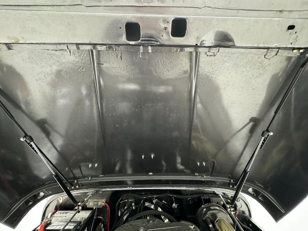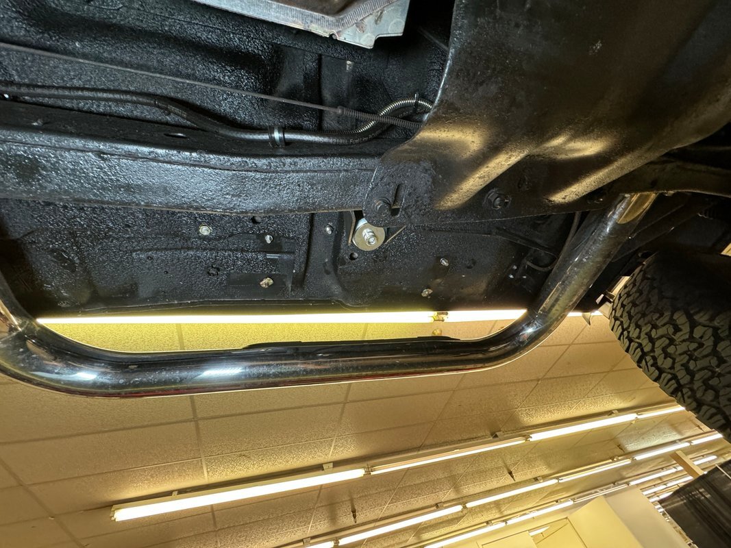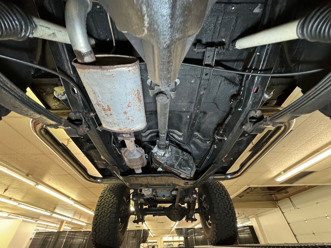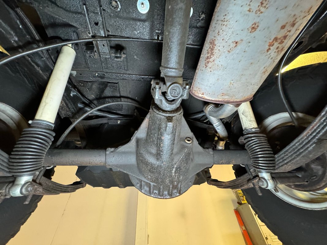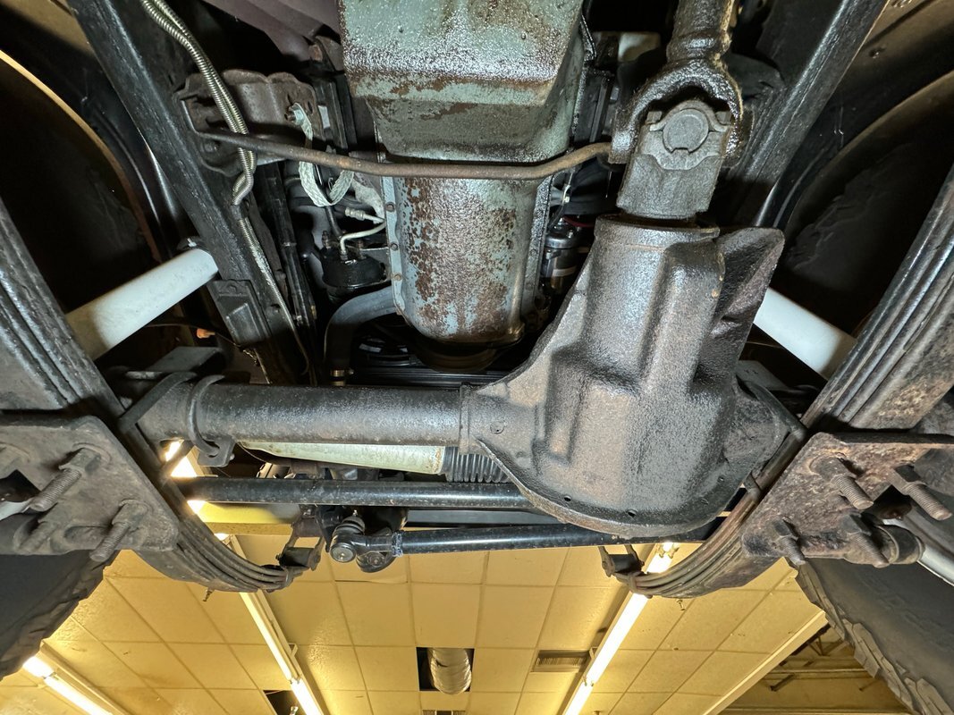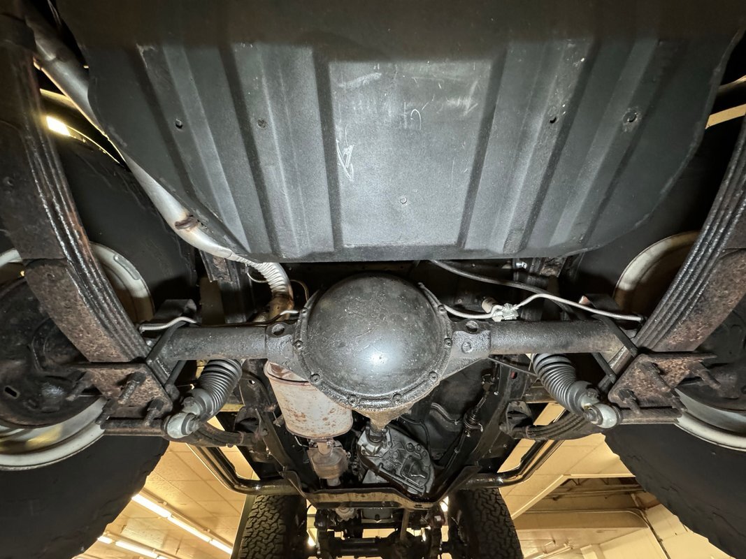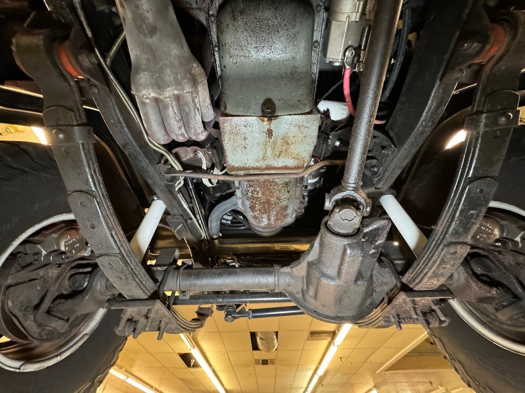 Very clean underneath where we find some typical surface rust on pans and leaf springs. There's no road dirt, sand, or mud under here and the brake components and steering knuckle are free of debris and grease. We don't see any leaks either. A single exhaust leads from the engine to a stock style muffler, then exits out back via a polished tailpipe. Leaf spring suspension is found front and rear.