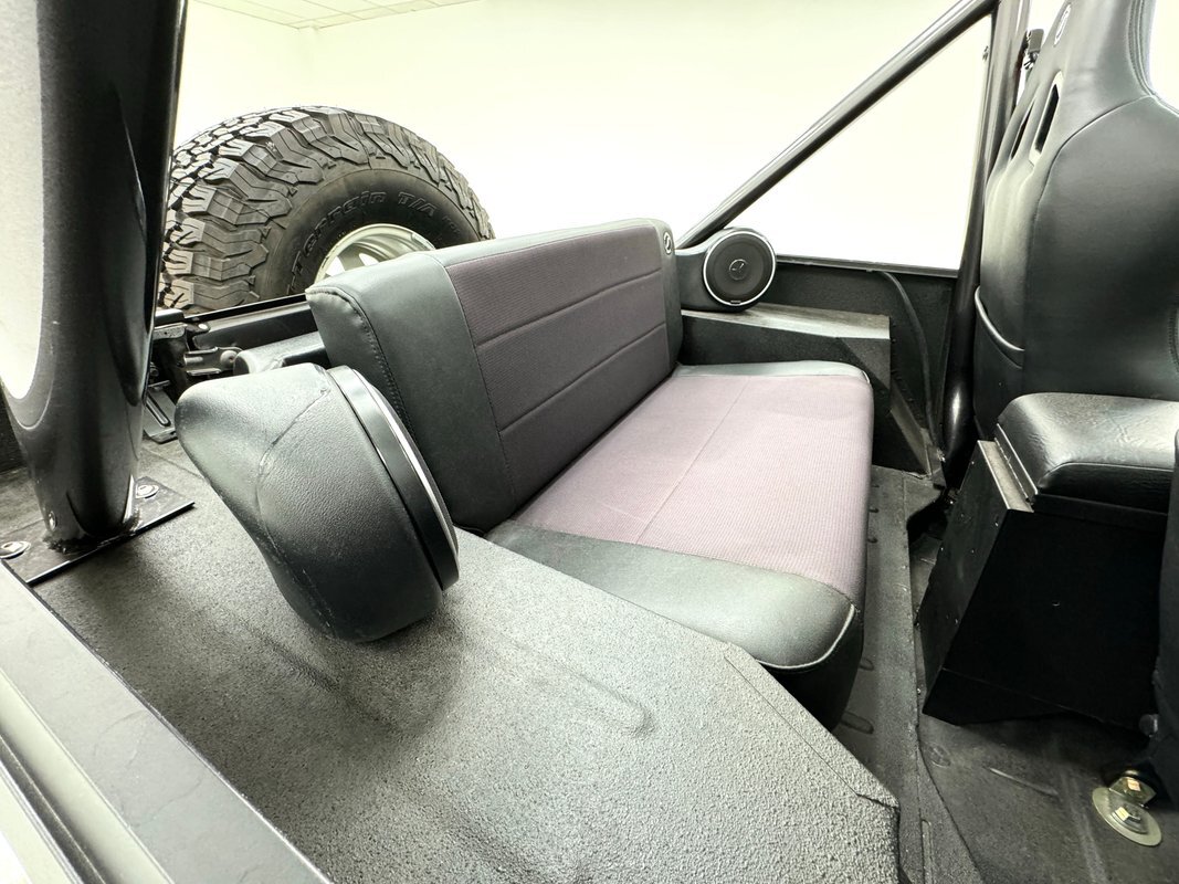 The half doors wear a plastic black door panel with an expanded header that allows you to look cool and rest your arm on the door. Corbeau heated seats, black leather with cloth inserts, are tall and supportive, and have harness ports, just in case. The rear bench is also a clean Corbeau seat and is flanked with speakers that are part of bigger units in the way back. The standard Jeep steering wheel leads to a brushed aluminum dashboard that houses gauges, knobs, and vents in the middle, and those controls include air conditioning. The gear shifter and range selector are floor mounted where we find the rubberized floor covering topped with carpeted mats.