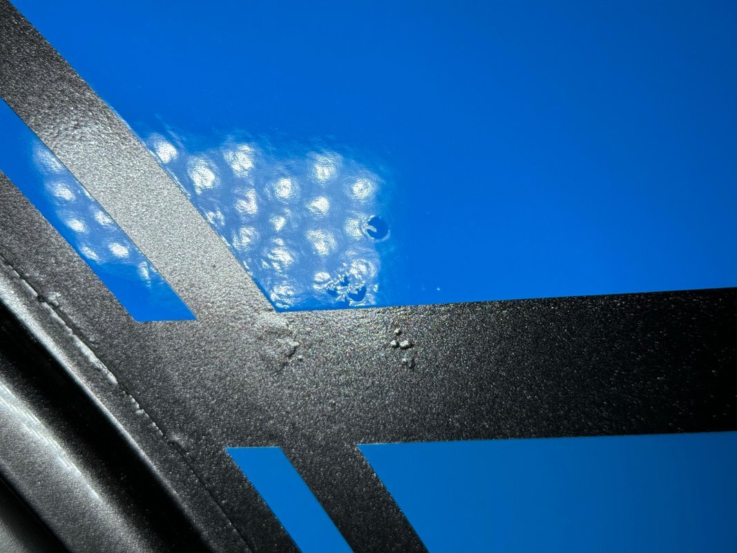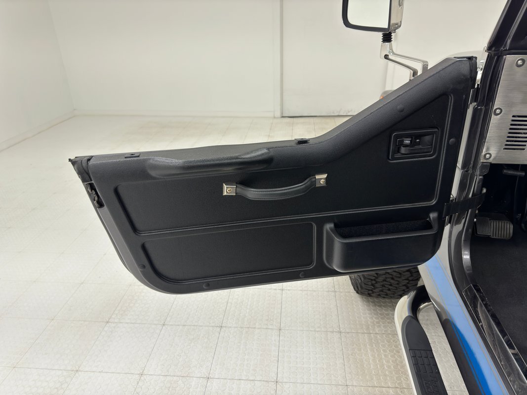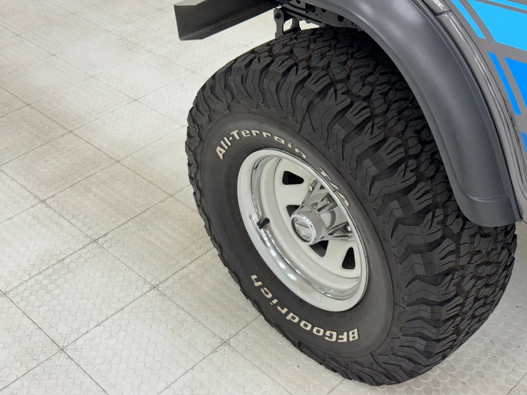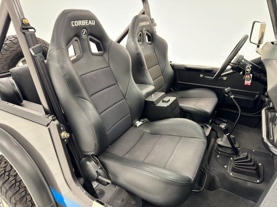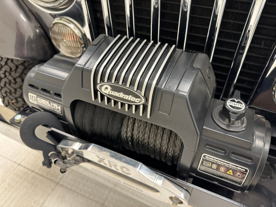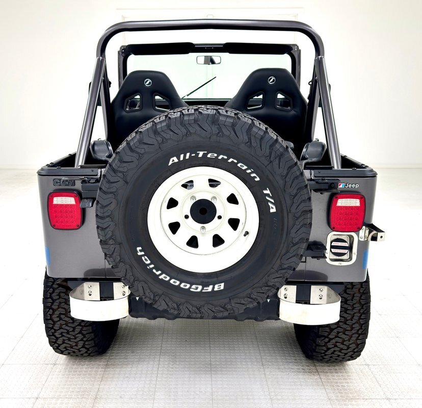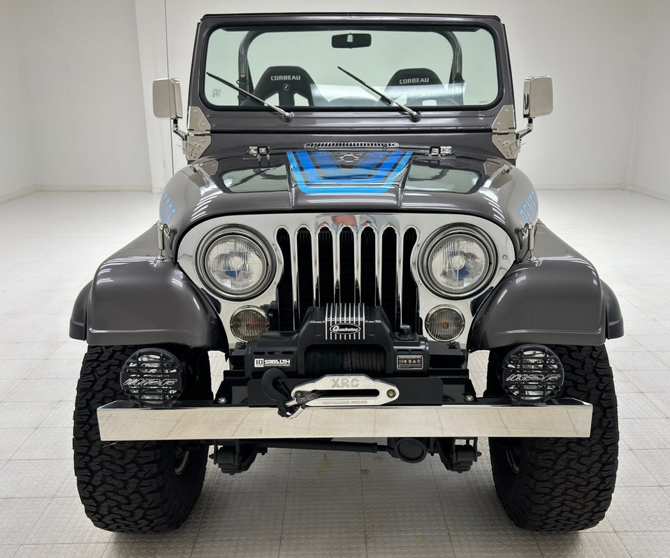 Classic Jeep decals adorn this rig that's painted with Charcoal Gray Metallic with contrasting shades of blue on stripes, the word Renegade on the hood sides, and the triple V that flows over the hood. In front, mirror-like chrome covers the 7 slot grille and flat front bumper while a Stealth winch stands in the ready on top. More polished metal covers the hinges, the side mirrors, the step bars, and the rear bumpers. While the inside of the 15-inch Jeep wheels are white, the rims are polished and each wears a 33x12.5R15LT all terrain tire with a mid 2020 date code. The body keyed roll bar is a nice touch and a full size spare hangs on the back. Imperfections are limited to some bubbling under a decal and on paint near it.