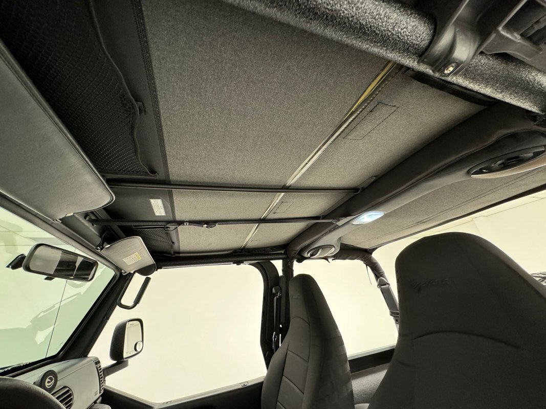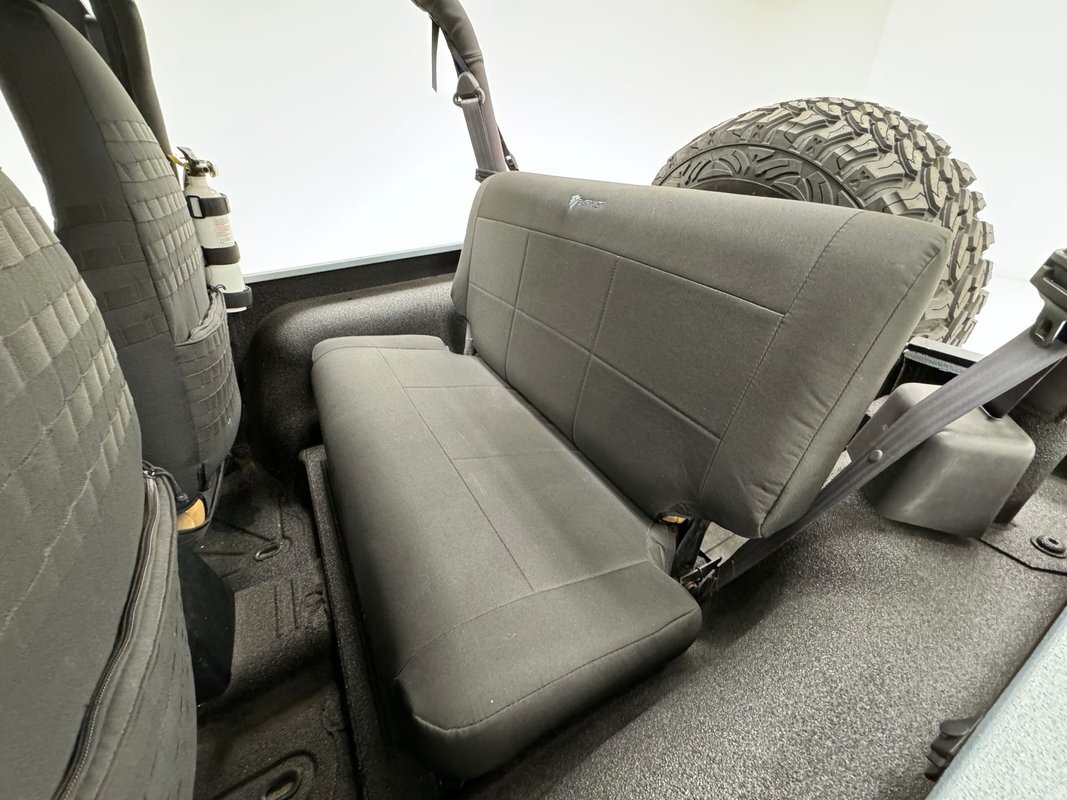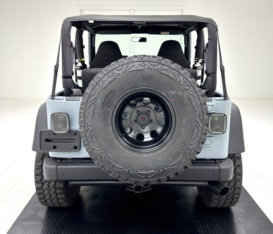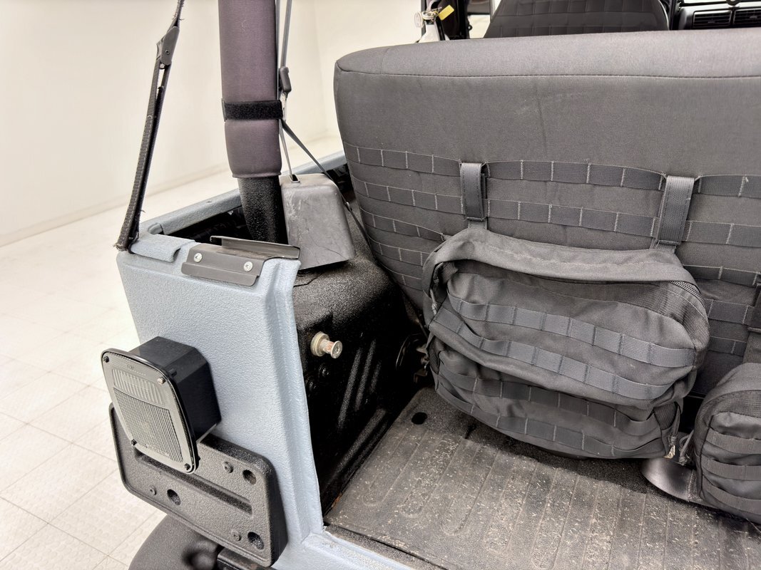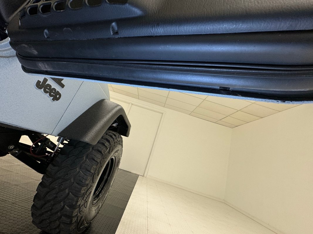 Gray Line-X bed liner coated steel bathes the rust free body, which maintains the factory gaps and displays nicely with a tubular front steel bumper, factory black steel rear bumper and black Line-X lined flexible fenders flares. 15" ProComp 7096 wheels which are wrapped in nearly new ProComp Xtreme MT2 35x12.50R15LT mud slingers. The long running and instantly recognizable Jeep grille leads the way and is flanked by traditional round headlights. The exterior latched hood leads back to the slightly raked windshield which gives support to a nice black bikini top, which can be removed giving one an open cockpit and rear passenger area. Half vinyl doors are on the sides, again easily removable for that full open air experience. A note to the full-sized spare hanging off the back mount for it, and is ready to step things up should you experience a flat. "Search high and low..."