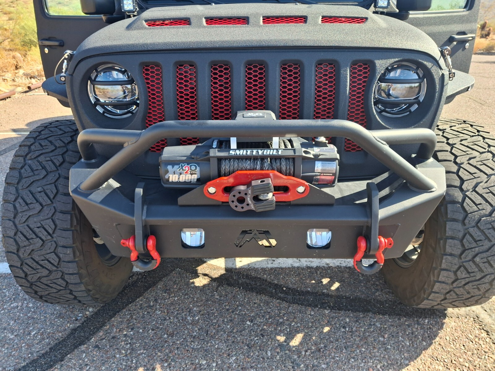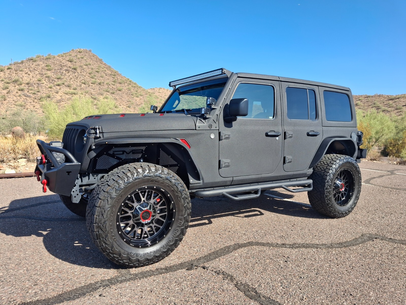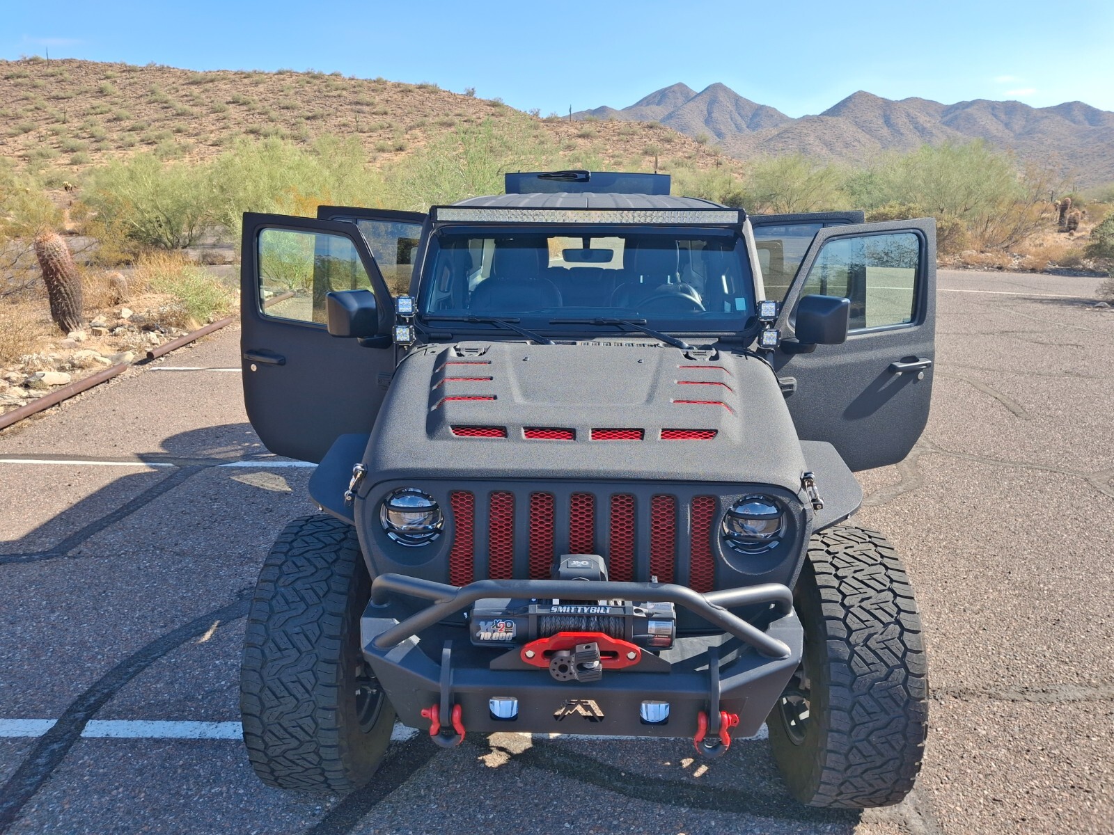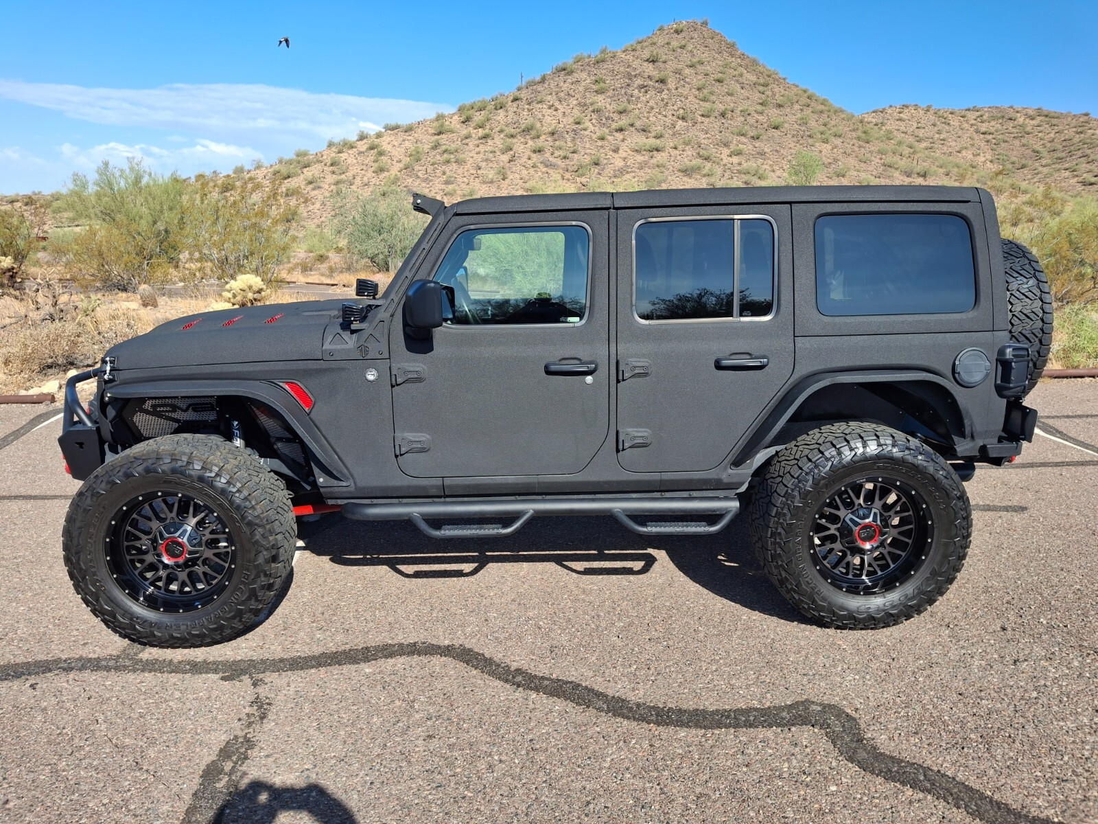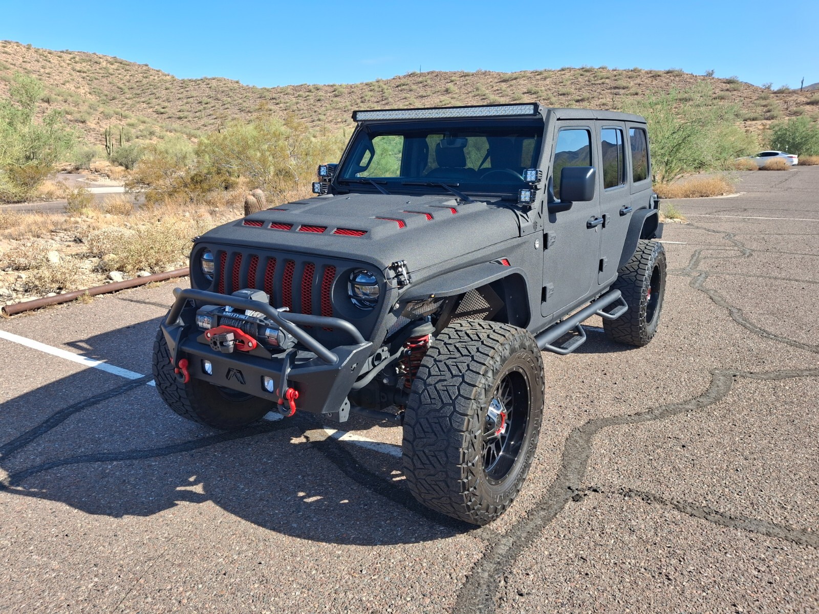 This custom build beauty was built back in 2021 in Carrolton, TX by a custom jeep builder and has been taken care of meticulously and is in phenomenal shape. I flew out to their facility and picked out all the customizations seen below. It has been garage stored, has a clean/clear title in hand and has ONLY been street driven, so it hasn’t been beat up on at all on the trails and backroads. This Jeep also comes with an electric hoist for the garage to lift off and store the hardtop and works through an app. This Jeep is coated with the Dupont Kevlar fiber spray when it was built and is a head turner and gets compliments everywhere I take it. It has been routinely maintenanced and runs perfectly. Let me know if you have any questions and no low ball offers or trades. Thanks. FACTORY OPTIONS INCLUDE/ 8.4 SCREEN WITH ALPINE AUDIO, CONVIENCE GROUP COLD WEATHER PACKAGE, AUTO TRANS, V6 TECHNOLOGY GROUP, 25SCUSTOM BUILD *RAPTOR BLACK KEVLAR COATING WITH RED ACCENTS (GRILL AND FENDER MESH RED) * RX SPORT HOOD WITH RED ACCENTS* FABFOUR STUBBY FRONT BUMPER WITH PRERUNNER GUARD*DV8 07 REAR BUMPER WITH TOW HITCH*RUGGED RIDGE REAR TIRE CARRIER WITH HINGE UPGRADE*DV8 SLIM FENDERS KEVLAR BLACK TO MATCH*SMITTYBILT GEN 2 WIRELESS WATERPROOF WINCH W/ SYNTHETIC ROPE (RED FAIRLEAD)*FRONT AND REAR RED D-RINGS WITH BLACK ISOLATORS*FACTOR 55 BLACK FLAT LINK*DRAKE OFF ROAD HOOD LATCHES*RUBICON EXPRESS 2.5 INCH SUSPENSION LIFT W/CONTROL ARMS (RED SUSPENSION) * FALCON 2.1 SERIES MONOTUBE SHOCKS*FALCON 2.2 NEXUS ADJUSTABLE STEERING STABILIZER*RUGGED RIDGE ELITE HEADLIGHT AND TAILLIGHT GAURDS*N-FAB STYLE BLACK NERF BARS*MOPAR BLACK FUEL DOOR*VOSWITCH AUX SWITCHES WITH RELAY/FUSE BOX* TVE UPPER LIGHT BRACKETS KEVLAR BLACK TO MATCH*50" LED LIGHT BAR MOUNTED AT TOP OF WINDSHIELD*2 SETS OR RIGID LED LIGHT PODS AT BOTTOM OF WINSHIELD*CUSTOM ALEA BLACK LEATHER WITH RED STITCH DOPPIO 60 WITH PERF*MATCHING BOOTS, STRAPS AND CONSOLE LID / BLACK WITH RED STITCH STEERING WHEEL*BLACK LEATHER DASH W RED STITCH / ALL WEATHER FLOOR MATS*FACTORY MATCH LED HEADLIGHTS*EVOLUTION BLACK LED TAILLIGHTS AND FOGLIGHTS *5 X NITTO 37/13.50/20 RECON GRAPPLER TIRES*5 X 20X10 XD SNARE WHEELS WITH RED RING*TAZER RECALIBRATION PROGRAMMER*RUGGED RIDGE LED THIRD BRAKE LIGHT RING*DV8 INNER LINERS FRONT AND REAR W / SILVER MESH*MAGNAFLOW BLACK AXLE BACK EXHAUST