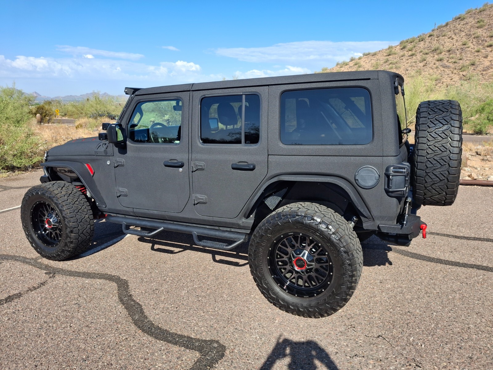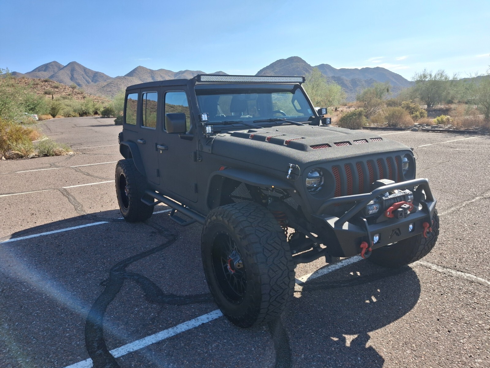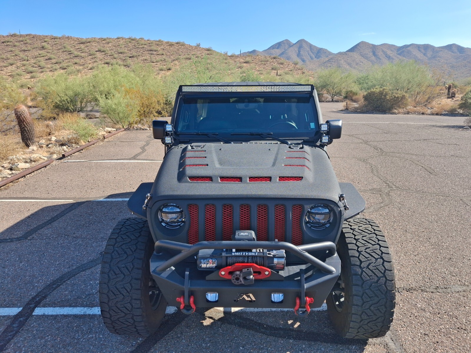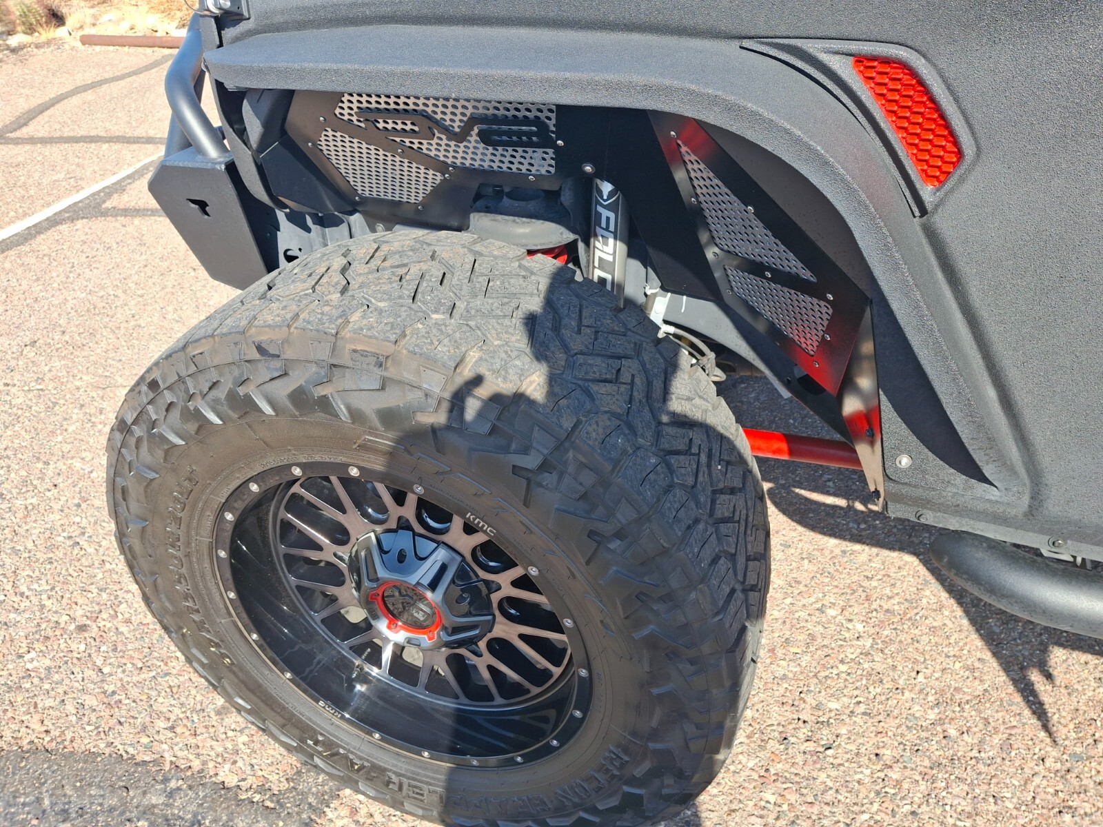 This custom build beauty was built back in 2021 in Carrolton, TX by a custom jeep builder and has been taken care of meticulously and is in phenomenal shape. I flew out to their facility and picked out all the customizations seen below. It has been garage stored, has a clean/clear title in hand and has ONLY been street driven, so it hasn’t been beat up on at all on the trails and backroads. This Jeep also comes with an electric hoist for the garage to lift off and store the hardtop and works through an app. This Jeep is coated with the Dupont Kevlar fiber spray when it was built and is a head turner and gets compliments everywhere I take it. It has been routinely maintenanced and runs perfectly. Let me know if you have any questions and no low ball offers or trades. Thanks. FACTORY OPTIONS INCLUDE/ 8.4 SCREEN WITH ALPINE AUDIO, CONVIENCE GROUP COLD WEATHER PACKAGE, AUTO TRANS, V6 TECHNOLOGY GROUP, 25SCUSTOM BUILD *RAPTOR BLACK KEVLAR COATING WITH RED ACCENTS (GRILL AND FENDER MESH RED) * RX SPORT HOOD WITH RED ACCENTS* FABFOUR STUBBY FRONT BUMPER WITH PRERUNNER GUARD*DV8 07 REAR BUMPER WITH TOW HITCH*RUGGED RIDGE REAR TIRE CARRIER WITH HINGE UPGRADE*DV8 SLIM FENDERS KEVLAR BLACK TO MATCH*SMITTYBILT GEN 2 WIRELESS WATERPROOF WINCH W/ SYNTHETIC ROPE (RED FAIRLEAD)*FRONT AND REAR RED D-RINGS WITH BLACK ISOLATORS*FACTOR 55 BLACK FLAT LINK*DRAKE OFF ROAD HOOD LATCHES*RUBICON EXPRESS 2.5 INCH SUSPENSION LIFT W/CONTROL ARMS (RED SUSPENSION) * FALCON 2.1 SERIES MONOTUBE SHOCKS*FALCON 2.2 NEXUS ADJUSTABLE STEERING STABILIZER*RUGGED RIDGE ELITE HEADLIGHT AND TAILLIGHT GAURDS*N-FAB STYLE BLACK NERF BARS*MOPAR BLACK FUEL DOOR*VOSWITCH AUX SWITCHES WITH RELAY/FUSE BOX* TVE UPPER LIGHT BRACKETS KEVLAR BLACK TO MATCH*50" LED LIGHT BAR MOUNTED AT TOP OF WINDSHIELD*2 SETS OR RIGID LED LIGHT PODS AT BOTTOM OF WINSHIELD*CUSTOM ALEA BLACK LEATHER WITH RED STITCH DOPPIO 60 WITH PERF*MATCHING BOOTS, STRAPS AND CONSOLE LID / BLACK WITH RED STITCH STEERING WHEEL*BLACK LEATHER DASH W RED STITCH / ALL WEATHER FLOOR MATS*FACTORY MATCH LED HEADLIGHTS*EVOLUTION BLACK LED TAILLIGHTS AND FOGLIGHTS *5 X NITTO 37/13.50/20 RECON GRAPPLER TIRES*5 X 20X10 XD SNARE WHEELS WITH RED RING*TAZER RECALIBRATION PROGRAMMER*RUGGED RIDGE LED THIRD BRAKE LIGHT RING*DV8 INNER LINERS FRONT AND REAR W / SILVER MESH*MAGNAFLOW BLACK AXLE BACK EXHAUST