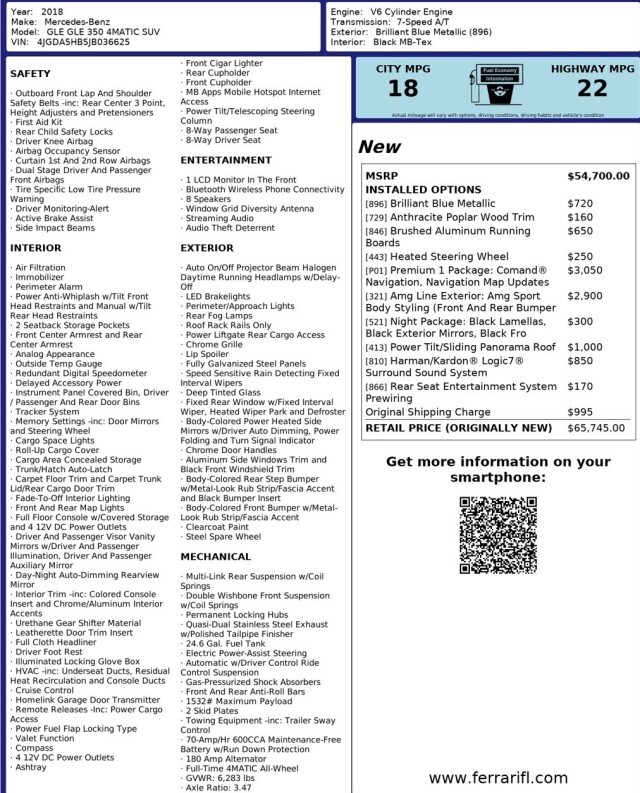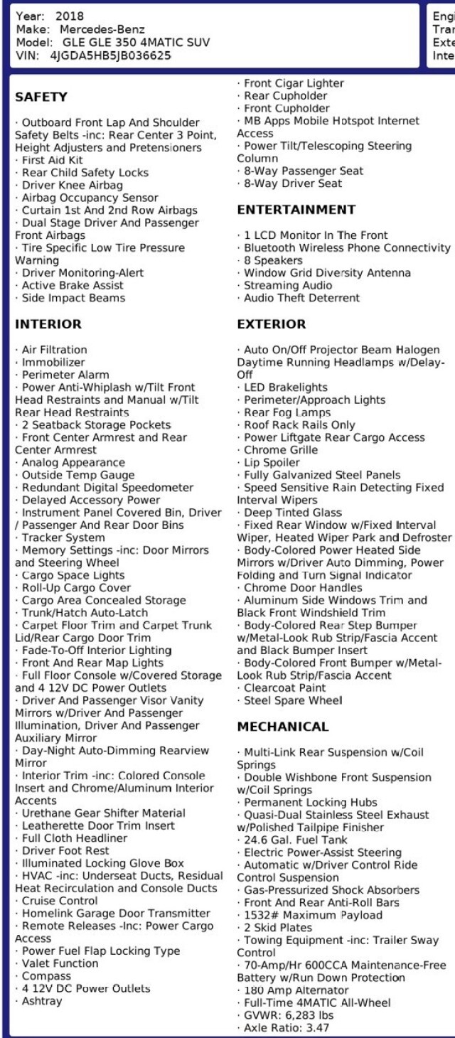 $65,745 ORIGINAL MSRP!! 2018 MERCEDES-BENZ GLE 350 4MATIC AWD, BRILLIANT BLUE METALLIC, BLACK MB-TEX, ANTHRACITE POPLAR WOOD TRIM, BRUSHED ALUMINUM RUNNING BOARDS, HEATED STEERING WHEEL, PREMIUM 1 PACKAGE, COMAND NAVIGATION, AMG LINE EXTERIOR, NIGHT PACKAGE, PANORAMA ROOF, HARMAN/KARDON LOGIC7 SURROUND SOUND, 20-INCH AMG WHEELS, LANE TRACKING PACKAGE, BLIND SPOT ASSIST, LANE KEEPING ASSIST, SATELLITE RADIO, SMARTPHONE INTEGRATION, APPLE CARPLAY, ANDROID AUTO, KEYLESS GO, CLEAN CARFAX!! This vehicle will be reviewed by an independent certified mechanic in accordance with PA state inspection regulations. If for any reason this vehicle does not pass inspection it will be noted. !!PLEASE CONTACT OUR SALES TEAM AT 877-864-0274 WITH ANY QUESTIONS!! We are pleased to show you another great opportunity! Sky Motor Cars is in the wholesale business and that represents the majority of what we do. When we have a vehicle this nice we present it to the public. Our turn time is quick and depending on auction schedules we may end listings early and take the vehicle to a dealer-only auction. Do not hesitate if you are interested! We have supplied many detailed photos to give you an accurate sense of just how nice this one is! !!A VARIETY OF EXTENDED WARRANTY OPTIONS ARE AVAILABLE!! !!NATIONWIDE SHIPPING & FINANCING ARE AVAILABLE!! This is a previously enjoyed vehicle so there MAY be a few light scratches and small chips around the vehicle. Please study the photos provided. Anything unusual or significant will be shown in the pictures. PLEASE NOTE THAT UNLESS SPECIFIED OUR VEHICLES ARE NOT MATTE-FINISHED. THE PICTURES OFTEN SHOW THE REFLECTION OF OUR PHOTO BOOTH CURTAINS IN SHINY PAINT AND THAT CAN MAKE THE FINISH APPEAR DULL. Also, note there are many shadows cast on the vehicle due to the conditions in which the photos were taken. If you are unclear of anything please contact us PRIOR to purchasing!