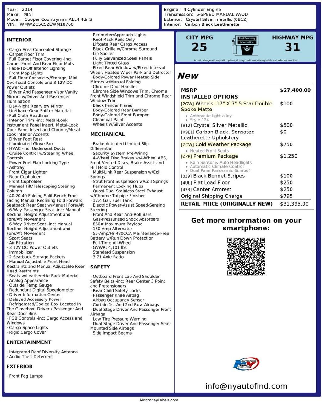 Take a look at this 2014 Crystal Silver Metallic MINI Cooper Countryman S ALL4 with Carbon Black Leatherette Interior and a Clean Carfax. This is a car that will make any car owner happy. It's a sparkling clean vehicle all around. Whether you are looking for a clean history, amazing options or superb looks, this car will deliver. It comes equipped with a 1.6L 4-cylinder engine paired to a 6-speed Manual Transmission, All Wheel Drive, Premium Package (with Dual Pane Panoramic Sunroof, Automatic Climate Control, Rain Sensor and Automatic Headlights), Cold Weather Package (with Heated Front Seats), 17 5-Star Double Spoke Matte Wheels, Cold Weather Package (with Heated Front Seats), Black Bonnet Stripes, Flat Load Floor, Center Armrest, Cruise Control, Steering Wheel Controls, AM/FM Radio, Power Windows, Power Locks, Air Conditioning and so much more. Every NY Auto Find vehicle comes with a complimentary Limited Warranty and a Carfax Vehicle Report. Our vehicles are priced to sell quickly. Please call to check availability and to schedule an appointment. -