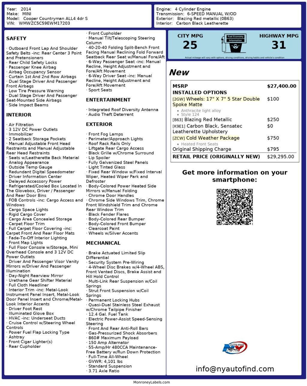 Take a look at this 2014 Blazing Red Metallic MINI Cooper Countryman S ALL4 with Carbon Black Leatherette Interior and a Clean Carfax. This car has a serious presence and a seriously clean history. It's a winning combination of spectacular looks and a quality history along with some impressive wheels. Don't miss this fine vehicle. It comes equipped with a 1.6L 4-cylinder engine paired to a 6-speed Manual Transmission, All Wheel Drive, Cold Weather Package (with Heated Front Seats), 17 Star Double Spoke Matte Light Alloy Wheels, Roof Rack, Chrome Door Handles and Side Window Trim, Black Grille with Chrome Surround, Lip Spoiler, Cruise Control, Steering Wheel Controls, AM/FM Radio, Power Windows, Power Locks, Air Conditioning and so much more. Every NY Auto Find vehicle comes with a complimentary Limited Warranty and a Carfax Vehicle Report. Our vehicles are priced to sell quickly. Please call to check availability and to schedule an appointment. -