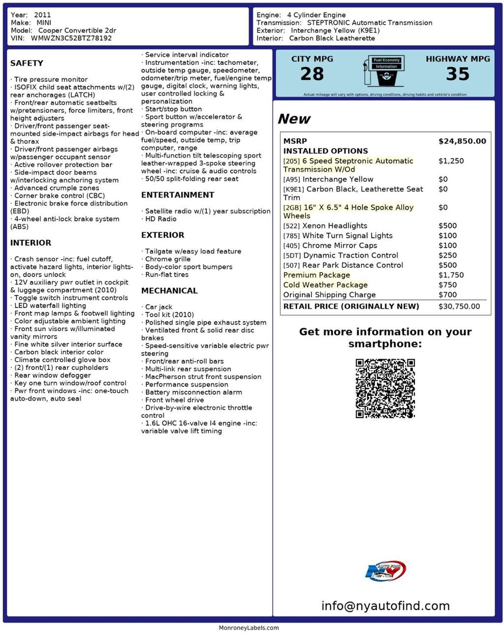 Take a look at this 2011 Interchange Yellow MINI Cooper Convertible with Carbon Black Leatherette Interior, a Clean Carfax and only 89,800 miles. This is one very clean convertible that is ideal in so many ways. It is a relatively low mileage car with a clean history and lots of great options. It is also very attractive and well maintained all around, making this one phenomenal vehicle. It comes equipped with a 1.6L 4-cylinder engine paired to a 6-speed Automatic Transmission, Premium Package (with Chrome Line Exterior, Chrome Line Interior, Dual Zone Automatic Climate Control, Alarm System, Harman/Kardon Premium Sound System), Cold Weather Package (with Heated Front Seats, Heated Mirrors and Washer Jets, Power-Folding Mirrors), Xenon Headlights, Rear Park Distance Control, Dynamic Traction Control, Chrome Line Interior, White Turn Signals, 16 Hole Spoke Alloy Wheels, Cruise Control, AM/FM/HD Radio, Steering Wheel Controls, Power Windows, Power Locks, Air Conditioning and so much more. Every NY Auto Find vehicle comes with a complimentary Limited Warranty and a Carfax Vehicle Report. Our vehicles are priced to sell quickly. Please call to check availability and to schedule an appointment. -