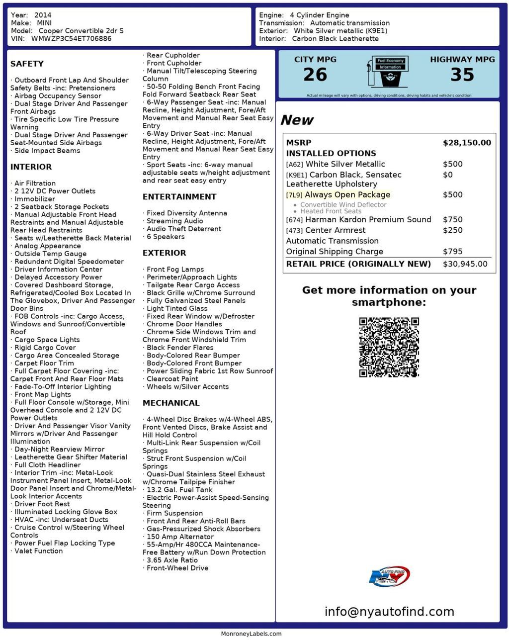 Take a look at this White Silver Metallic 2014 MINI Cooper S Convertible with Carbon Black Leatherette Interior and only 85,893 miles. This car makes me want to take it right to the beach with the top down. And it's low mileage and very well maintained surfaces really add to the allure of a gorgeous vehicle like this. It comes equipped with a 1.6L 4-cylinder Engine paired to a 6-speed Automatic Transmission, Heated Front Seats, Harman Kardon Premium Sound, Sport Seats, Black Grille with Chrome Surround, Chrome Door Handles, Cruise Control, Steering Wheel Controls, AM/FM Radio, Power Windows, Power Locks, Air Conditioning and so much more. Every NY Auto Find vehicle comes with a complimentary Limited Warranty and a Carfax Vehicle Report. Our vehicles are priced to sell quickly. Please call to check availability and schedule an appointment. -