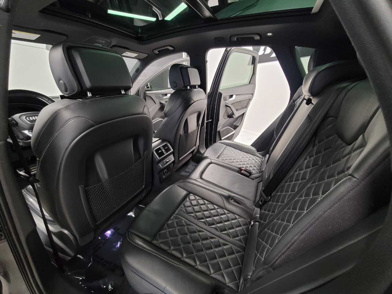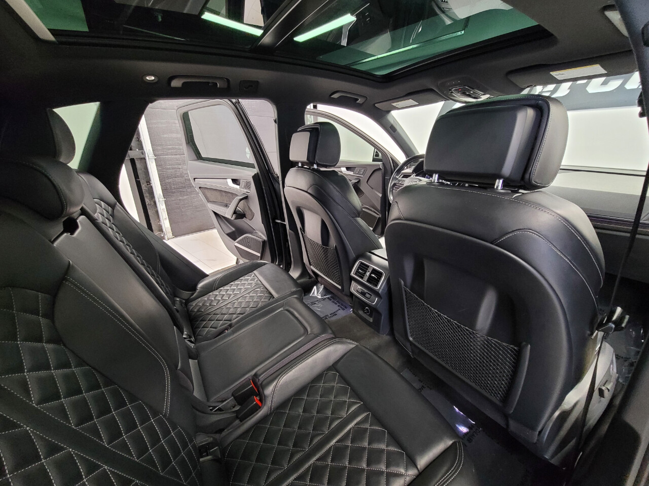 Daytona gray pearl effect, Prestige package, black premium leather interior, navigation package, S sport package, 21 Audi sport 5 double spoke wheels, carbon atlas inlays, and panoramic roof.