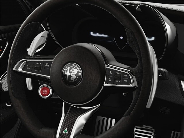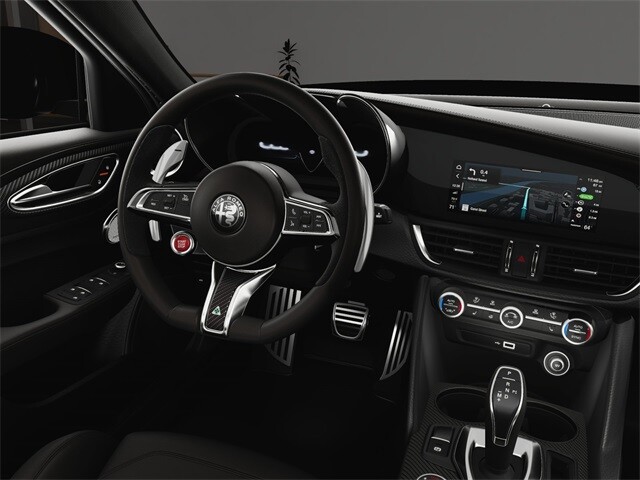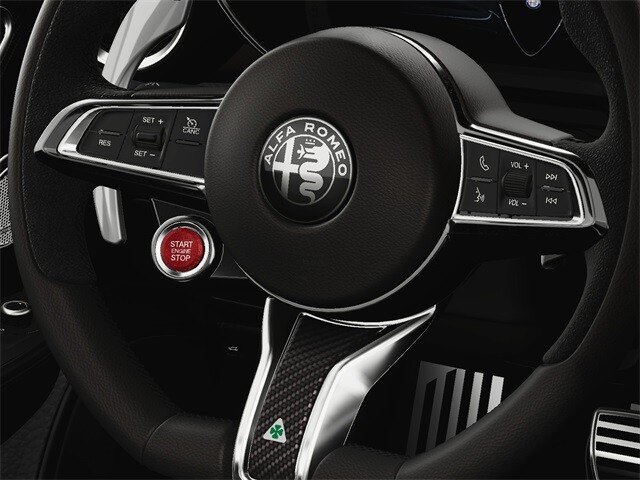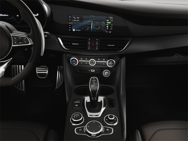 This Giulia Quadrifoglio is nicely equipped with Quick Order Package 25P Quadrifoglio, 14 Speakers, 4-Wheel Disc Brakes, ABS brakes, Air Conditioning, Alloy wheels, AM/FM radio: SiriusXM, Apple CarPlay/Android Auto, Auto High-beam Headlights, Auto-dimming door mirrors, Auto-dimming Rear-View mirror, Automatic temperature control, Bodyside moldings, Brake assist, Bumpers: body-color, Compass, Delay-off headlights, Driver door bin, Driver vanity mirror, Dual front impact airbags, Dual front side impact airbags, Electronic Stability Control, Exposed Carbon Fiber Roof, Exterior Parking Camera Rear, Four wheel independent suspension, Front anti-roll bar, Front Bucket Seats, Front Center Armrest, Front dual zone A/C, Front reading lights, Fully automatic headlights, Garage door transmitter, Gloss Red Calipers w/White Script, harman/kardon Speakers, Heated door mirrors, Heated front seats, Heated rear seats, Heated steering wheel, Illuminated entry, Knee airbag, Leather Shift Knob, Low tire pressure warning, Memory seat, Navigation System, Occupant sensing airbag, Outside temperature display, Overhead airbag, Overhead console, Panic alarm, Passenger door bin, Passenger vanity mirror, Power door mirrors, Power driver seat, Power passenger seat, Power steering, Power windows, Radio data system, Radio: AM/FM/HD 8.8 w/Navigation, Rain sensing wipers, Rear anti-roll bar, Rear reading lights, Rear seat center armrest, Rear window defroster, Remote keyless entry, Security system, Speed control, Speed-sensing steering, Speed-Sensitive Wipers, Split folding rear seat, Spoiler, Sport Leather Seats, Sport steering wheel, Steering wheel mounted audio controls, Tachometer, Telescoping steering wheel, Tilt steering wheel, Traction control, Trip computer, Turn signal indicator mirrors, Variably intermittent wipers, and Wheels: 19 x 8.5 Fr & 19 x 10 Rr Dark 5-Hole.
