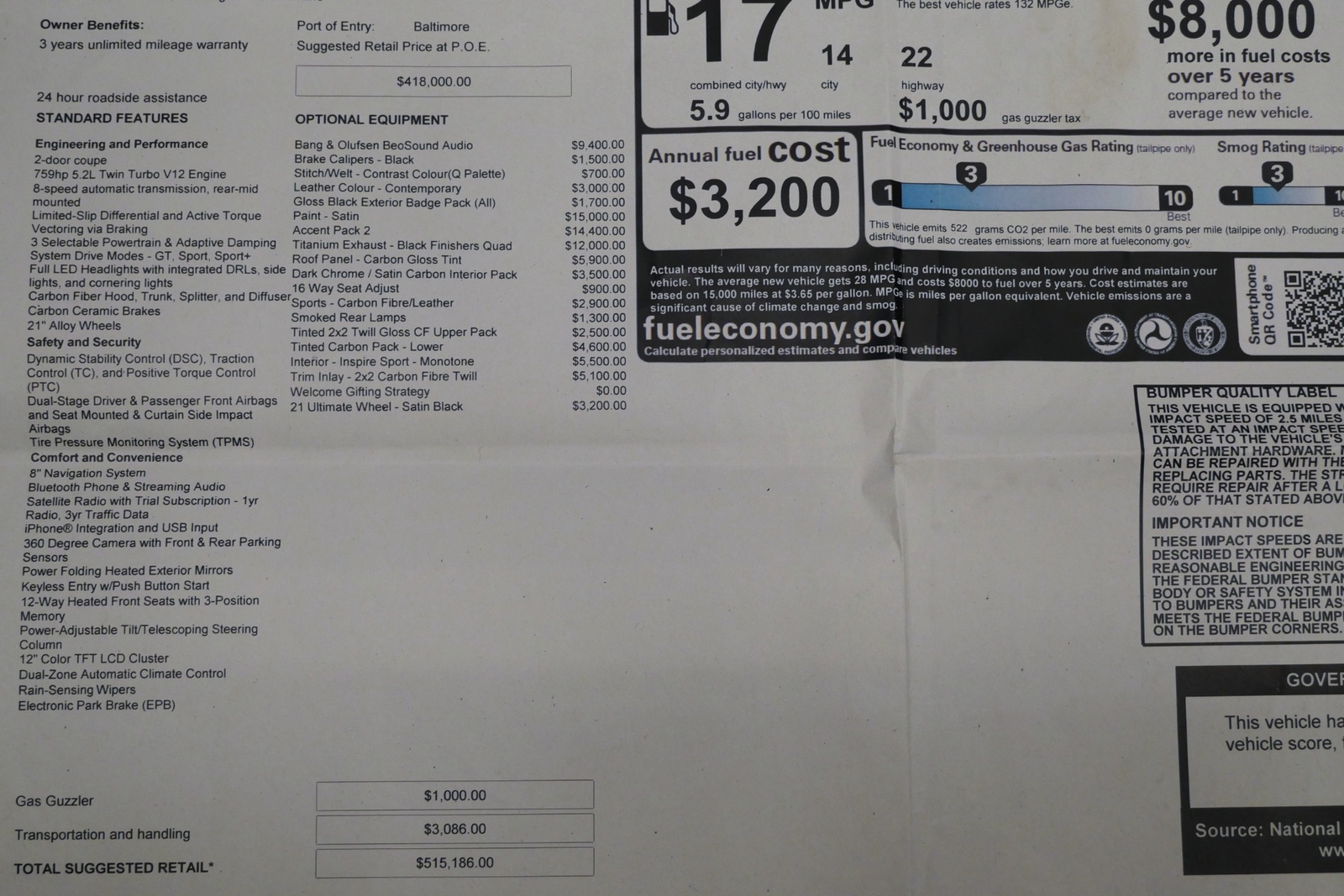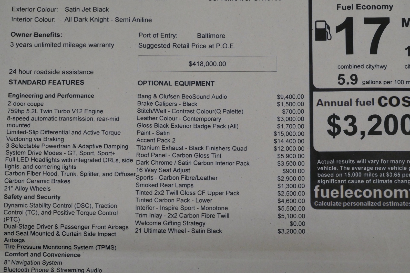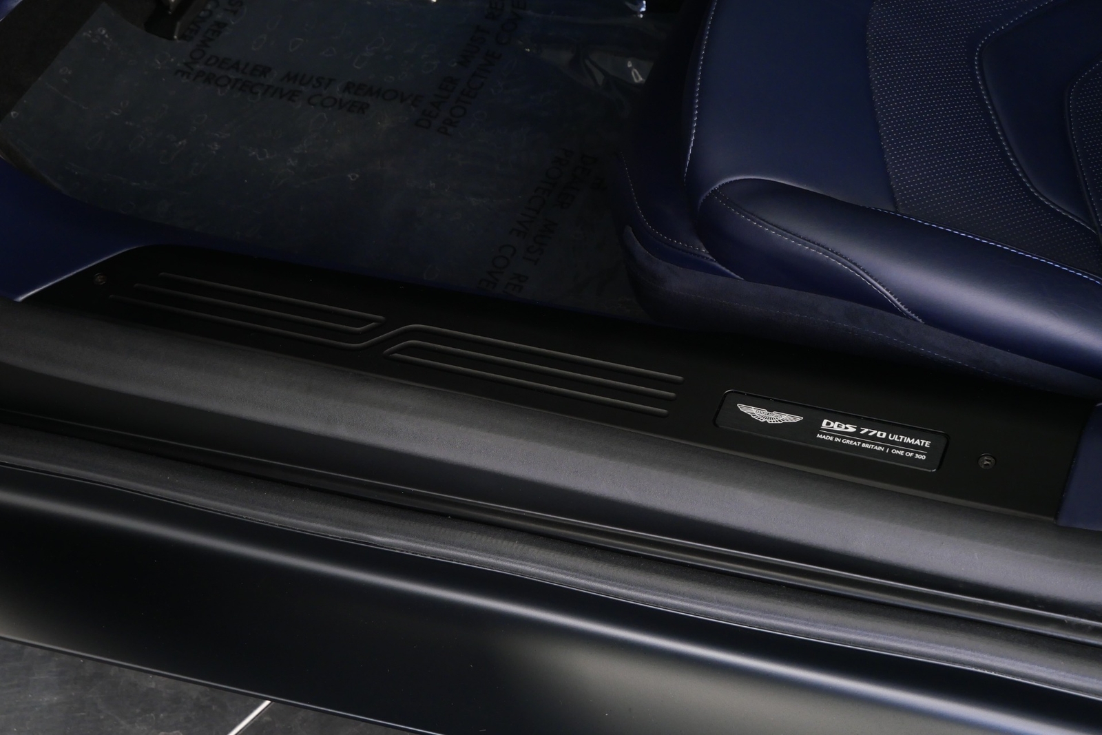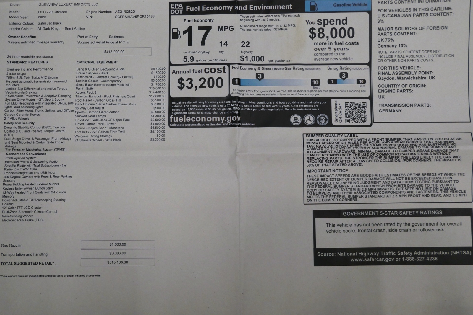 We have just added to our extensive exotic car inventory a beautiful 2023 Aston Martin DBS Ultimate in Satin Jet Black over Dark Knight interior and only 661 original miles. This DBS is loaded with: 5.2 liter twin turbo V12 with 759 horsepower, 8 speed automatic transmission, satin black 21 inch Ultimate wheels, carbon ceramic brakes with calipers in black, titanium exhaust finishers in black, carbon gloss tint roof panel, tinted lower carbon pack, tinted 2x2 twill carbon fiber upper pack, gloss black exterior badge pack, smoked rear lamps, paint color--satin, accent pack 2 (blue painted accents on exterior carbon trim), Inspire Sport monotone interior, Aston Martin wings embroidered in seat backs, Q palette contrasting stitching and welting, Bang & Olufsen BeoSound audio, contemporary leather color, navigation, 16 way seats with heat and ventilation, dark chrome and satin carbon interior pack, 2x2 twill carbon interior trim, carbon fiber and leather sports steering wheel, floor mats and much more. This is one of only 300 700 Ultimates built for the world, and this one carried a stratospheric $515,186 MSRP.
