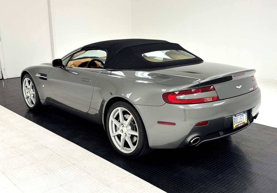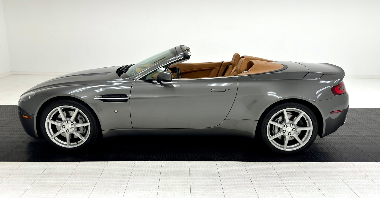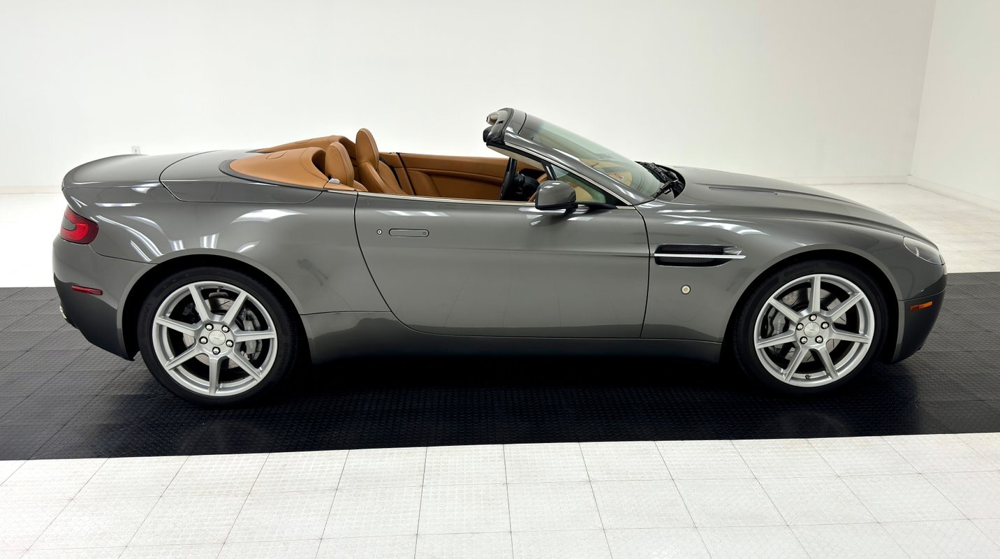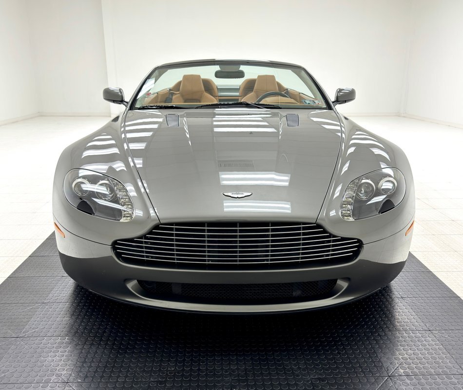 A spectacular grade of two state Mercury Silver Metallic coats this roadster, one of just a few thousand produced in 2008. Aston's work of art begins at the characteristic grille opening, like none other, although occasional pretenders borrow the design, (we see you, Ford Fusion!). The wide gaping grille seems to contour to the oblong headlights which fit flush to the corners and begin the rounded hips that flank a low, flat hood sporting a pair of mesh covered hood vents. In profile, it's wedged shaped but with rounded edges, smooth as a river rock and mildly aggressive with a slightly upturned and integrated wing in back and fender vents that seemingly point forward. The wonderfully wide tail features perfectly flush tail lights with color keyed inserts, dual exhaust in the rear valance, and a rear splitter between them. There's a supercar-like rake to the windshield designed to duck under the wind with top up or top down. The canvas top and glass rear window are in great shape, the panel gaps are impeccable, and the only exterior flaw noted are some scuffs under the chin.