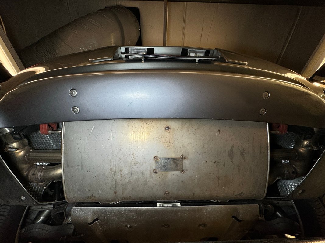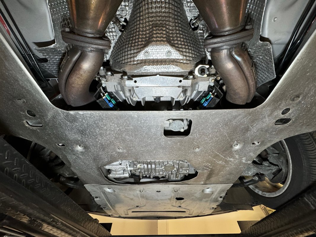 Wind be damned as the clean underside is replete with flat belly pans. No grease, no dripping oil, no surface rust. The dual exhaust flows from factory headers to original mufflers before singing their song out back and independent suspension is supplied in front and back.