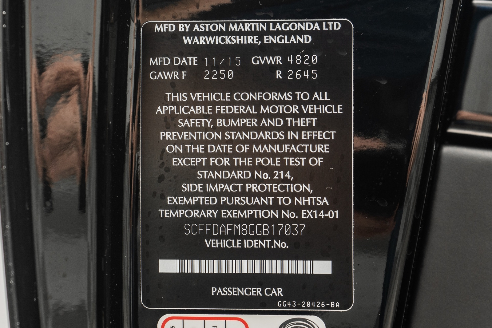 We have just added to our extensive exotic car inventory a beautiful 2016 Aston Martin DB9 GT Volante in Jet Black over Obsidian Black leather and only 5,225 miles. This DB9 is loaded with: 6.0 liter V12, 6 speed automatic transmission, 20 inch split 5 spoke wheels, grey brake calipers, bright finish grille and hood vents, heated front seats, memory seats, piano black fascia trim, front and rear parking sensors with rear camera, navigation, black convertible top and much more.