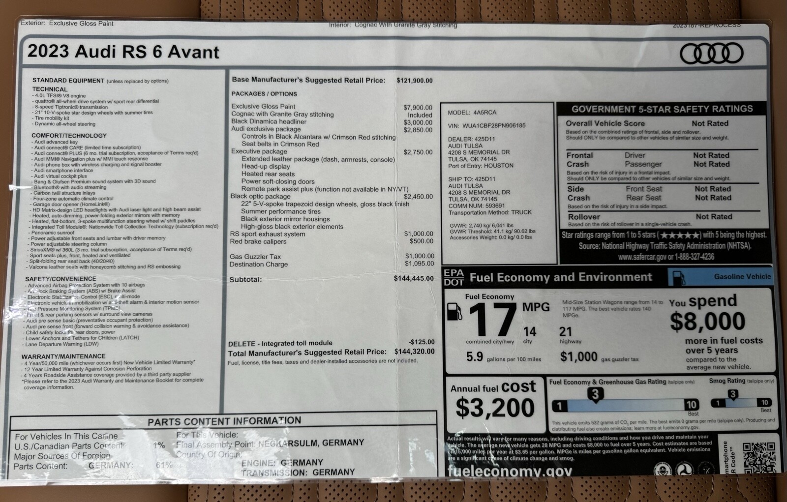 2023 Audi RS6 Avant in excellent condition. One owner. 11K miles. No damage history. Clean title.