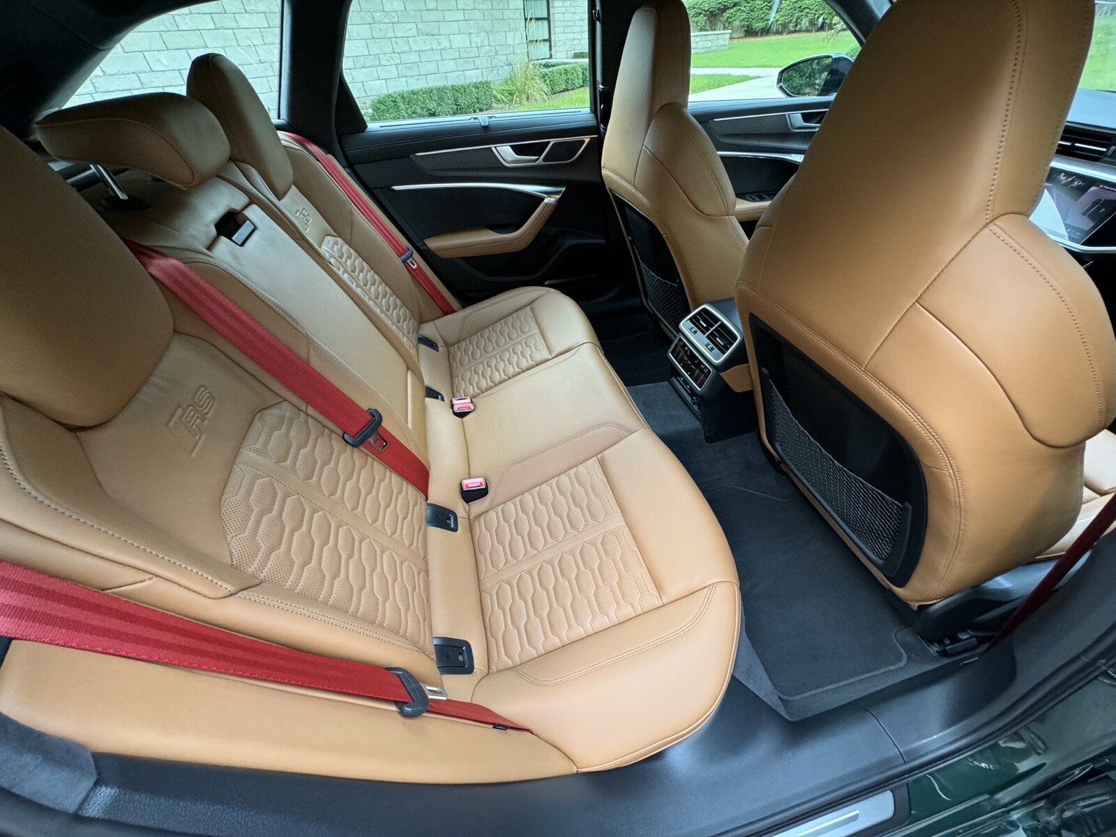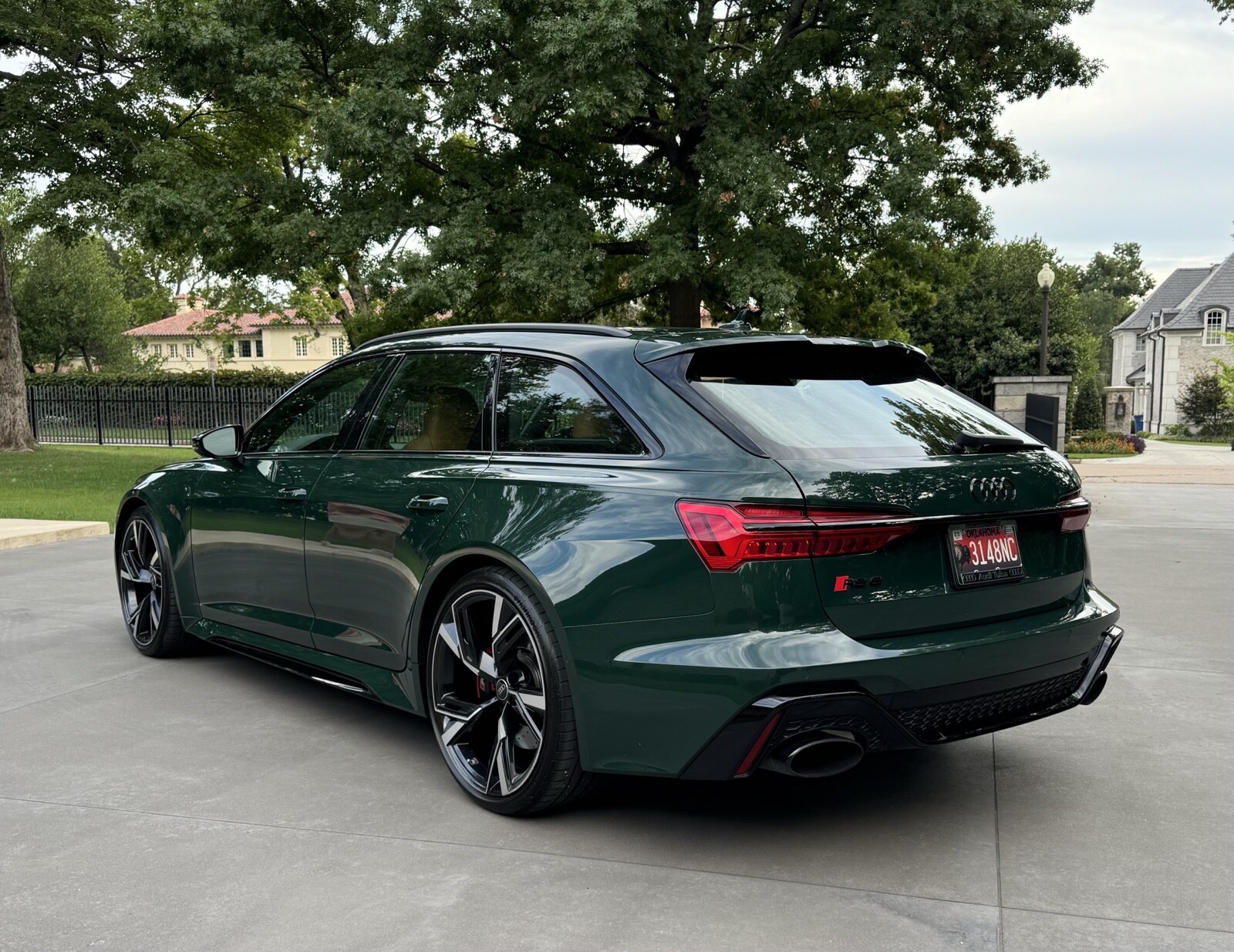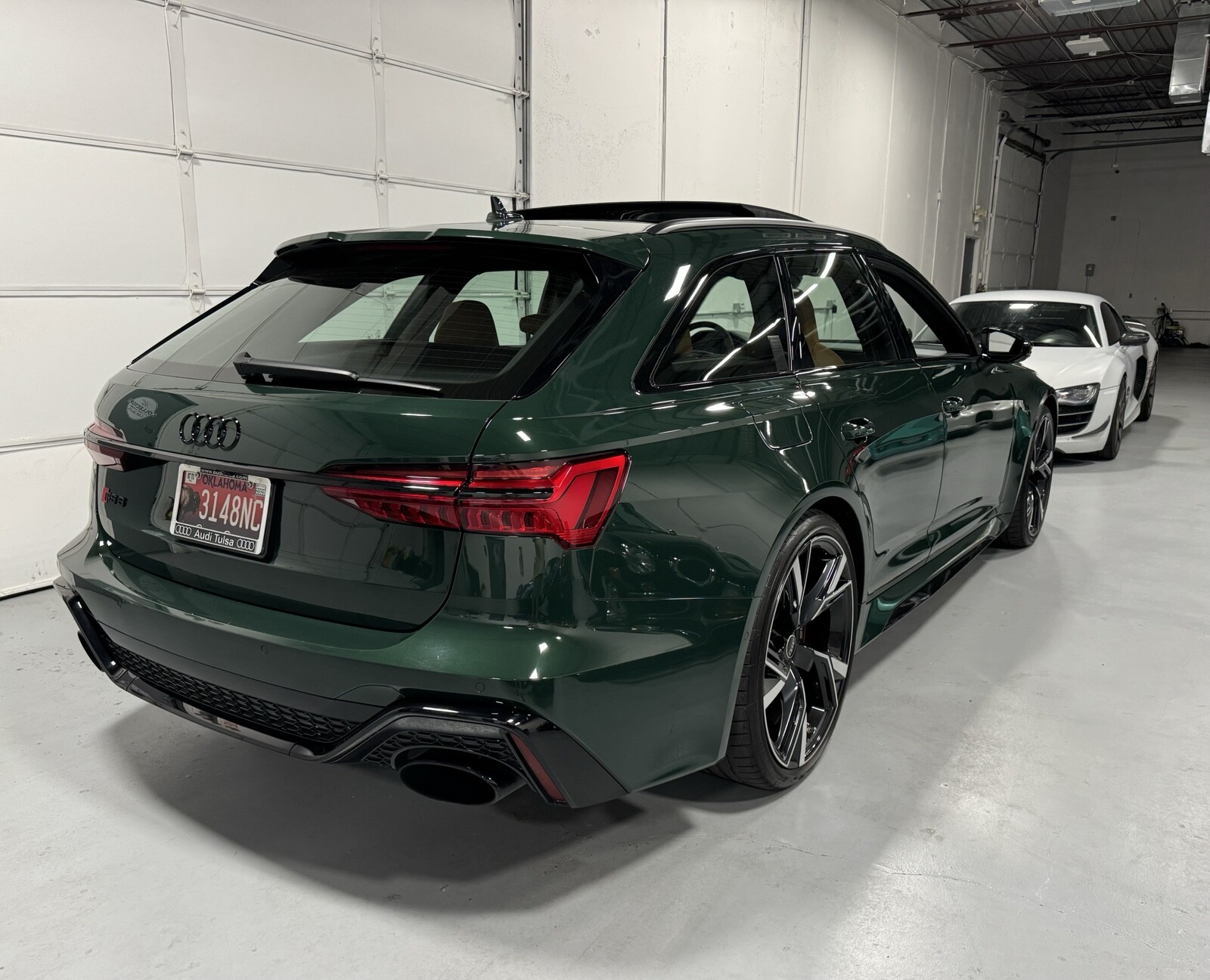 600hp Twin Turbo V8. Audi Exclusive Goodwood Green over Cognac. Black Dinamica Headliner. Audi Exclusive Alcantara Steering Wheel, Shifter and Seatbelts in Crimson Red. Executive Package with extended leather, Head-up display, Heated Rear Seats, Soft Close Doors and Remote Park Assist. Black Optic Package. RS Sport Exhaust. Red Calipers.