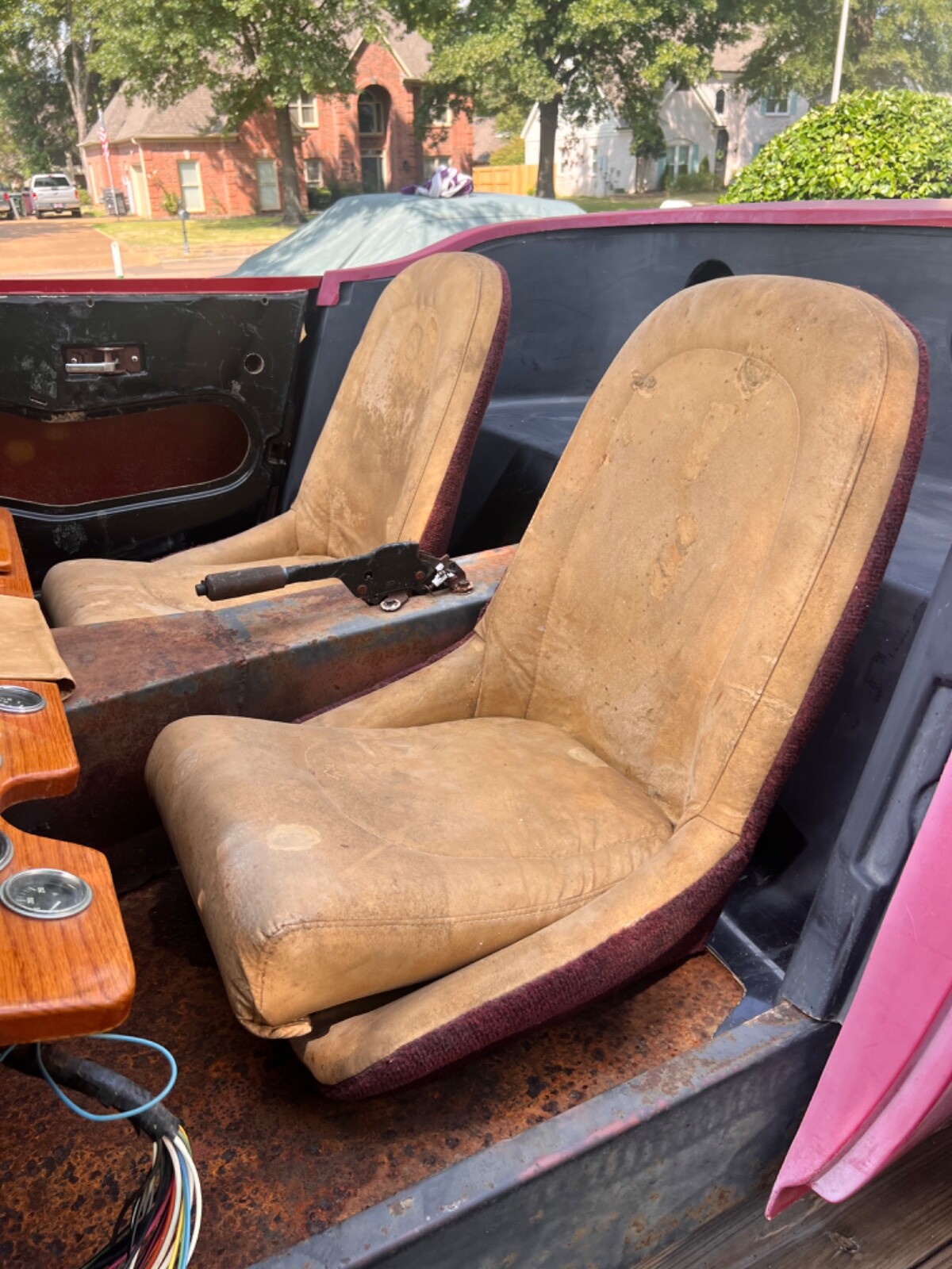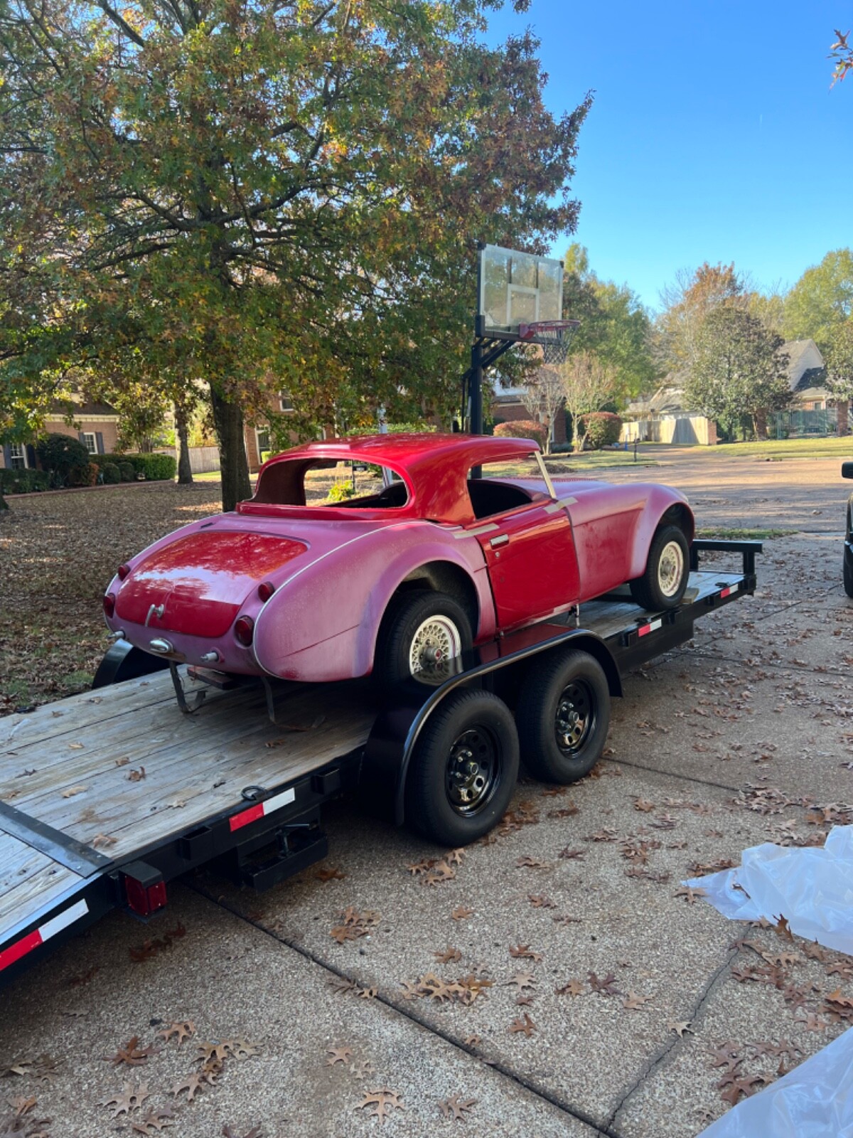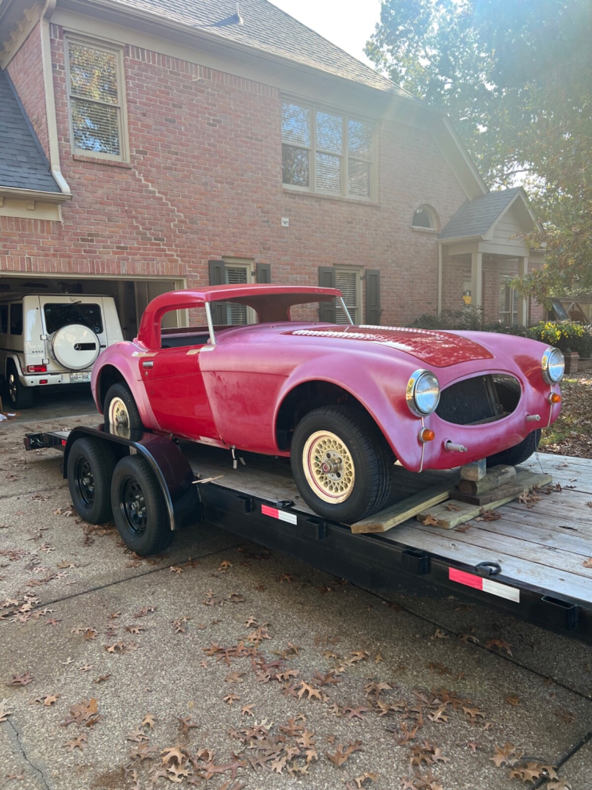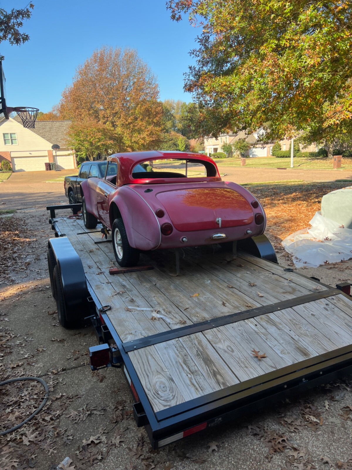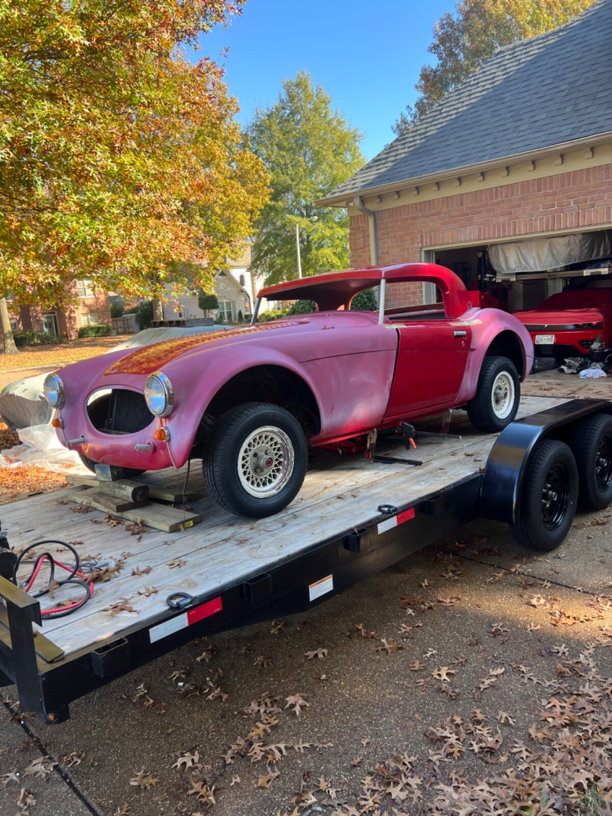 For sale: 1966 Austin Healey Sebring classic roadster. This was a kit that was purchased in the early 1980s and never finished. The car has a fiberglass body and includes all trim , grill, bumpers, doors, hood, trunk lid, windshield frame, seats, instrument cluster, two extra real Healey dashes, hardtop, and radiator support. It also includes a rebuildable small block Chevy from a 1980 corvette and a C6 transmission. The car can be set up for a small block Chevy or ford small block. It currently has a Mustang ll front and rear suspension and ugly Mustang ll wheels from the 70s. The body is excellent. There is some rust in the floor pans but the frame is super solid. There no cracks or breaks anywhere on the body. This is a fantastic project with huge potential. The car has NO title and will be sold on a bill of sale. The fiberglass body alone is worth more than my reserve. Any questions please message me or call 9 zero 1 six 5 two 3 nine 6 nine.