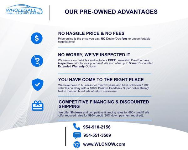 NO DEALER FEES! 30 DAY 500 MILE ENGINE / TRANSMISSION WARRANTY INCLUDED! Financing Available for all credit types with competitive rates $0 down to 20% down! Discounted Nationwide Shipping! This vehicle has a rebuilt title from previous damage that was fully repaired and is what we specialize in! We mainly sell on eBay so our customers can see our 100% positive feedback rating with over 1,000 vehicles sold! WholesaleLuxuryCars(dot)com . Discounted 3-5 year FULL coverage nationwide extended warranty options also available!