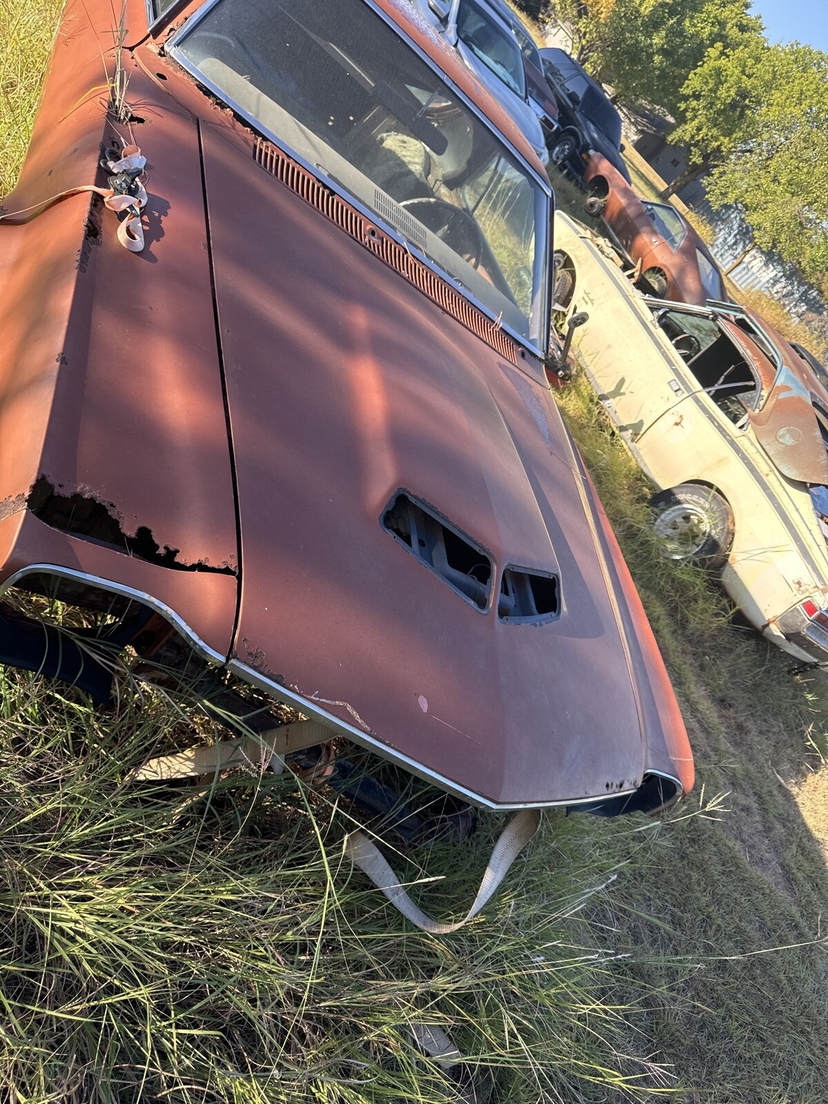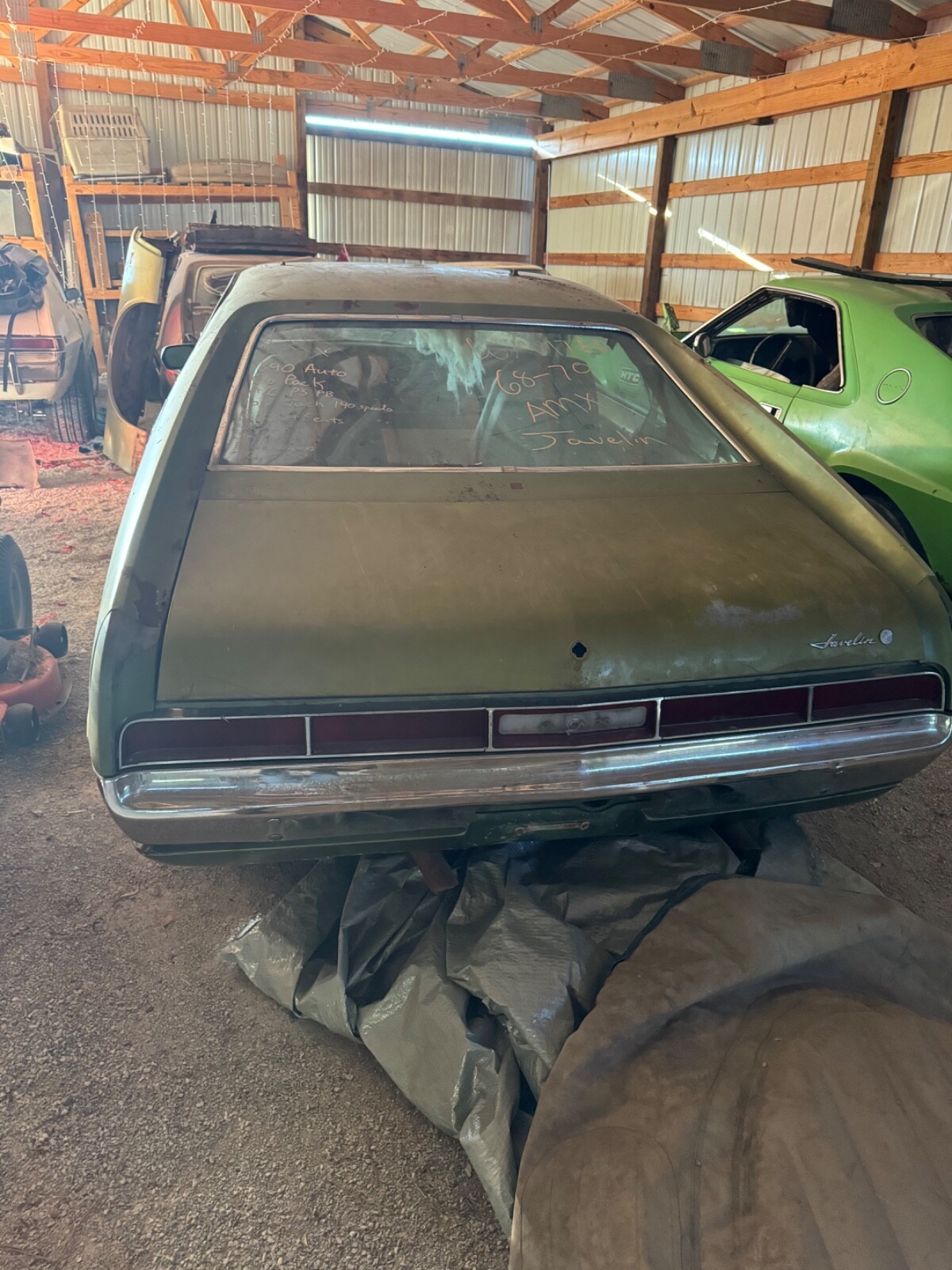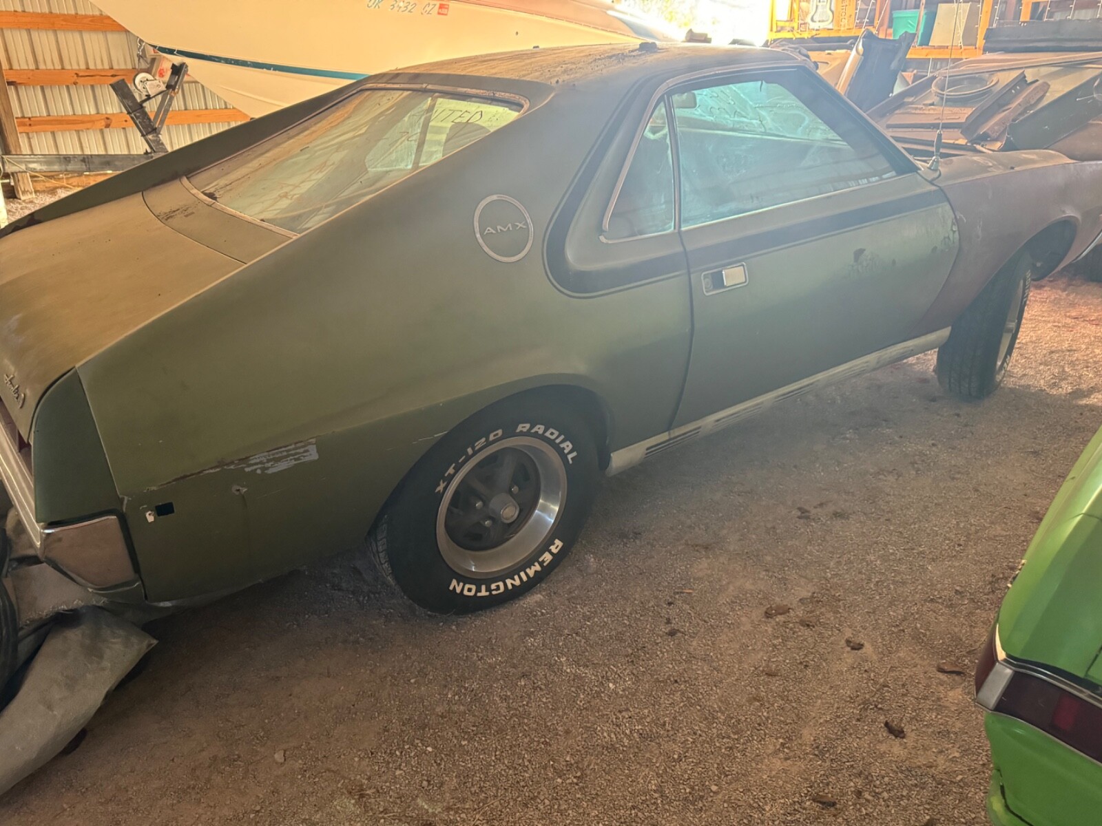 1970 amc amx project this car is a Oklahoma car was wrecked in 80s fixed w a 68 javelin clip which I removed and placed a set of 70 fenders and grille on it. Fairly solid car needs rear quarters and floor pan has few spots not bad. I have a 390 core 70 model condition of motor is unknown. This is a real go pac car w disc. Factory air conditioning. I have a core m12 included with sale.  The car was set up for big block Chevy but that is easy to fix back to the amc 390. I do have a hood on parts car not perfect but will be included in sale of car. Pics of core motor and transmission added!