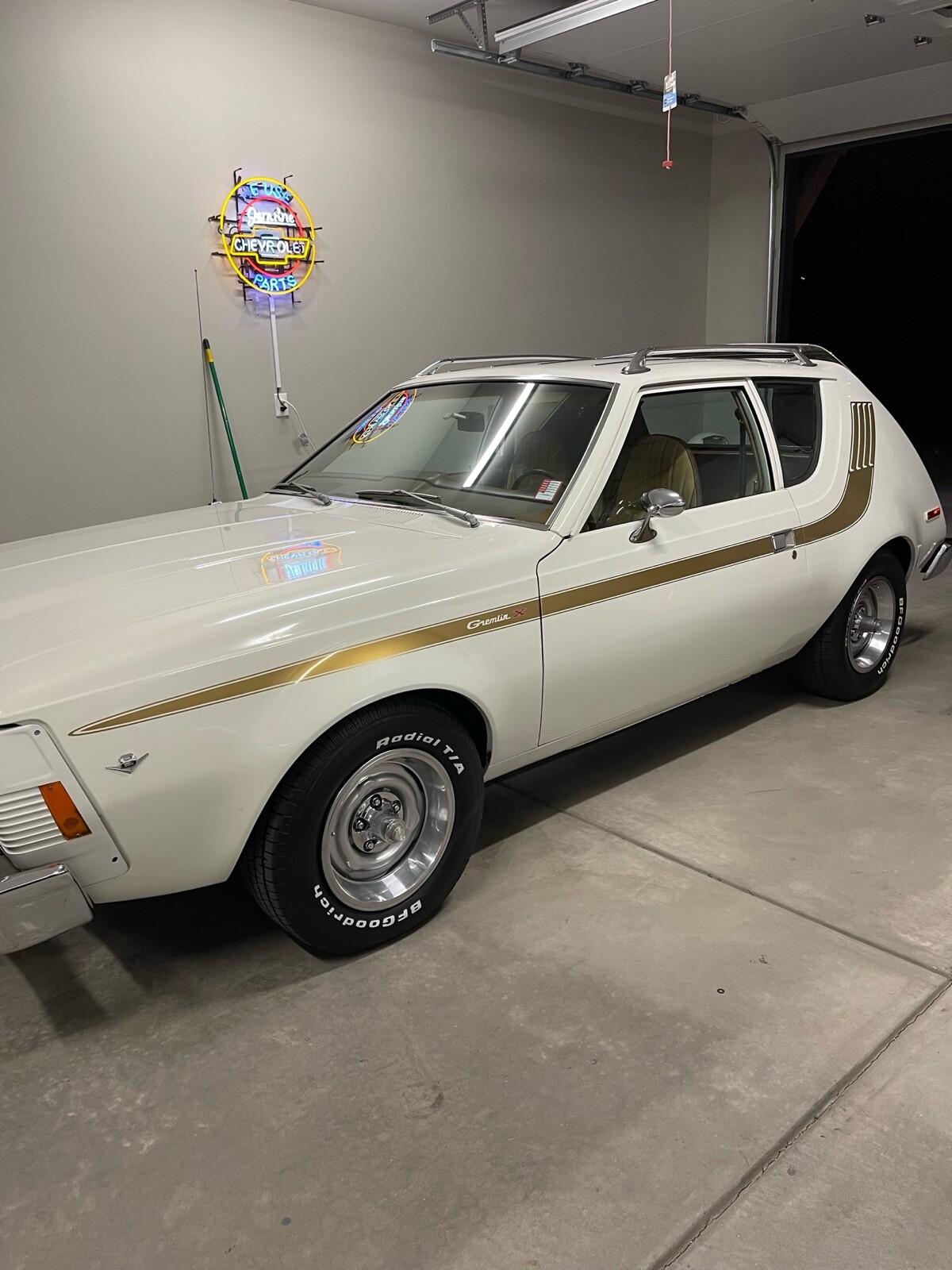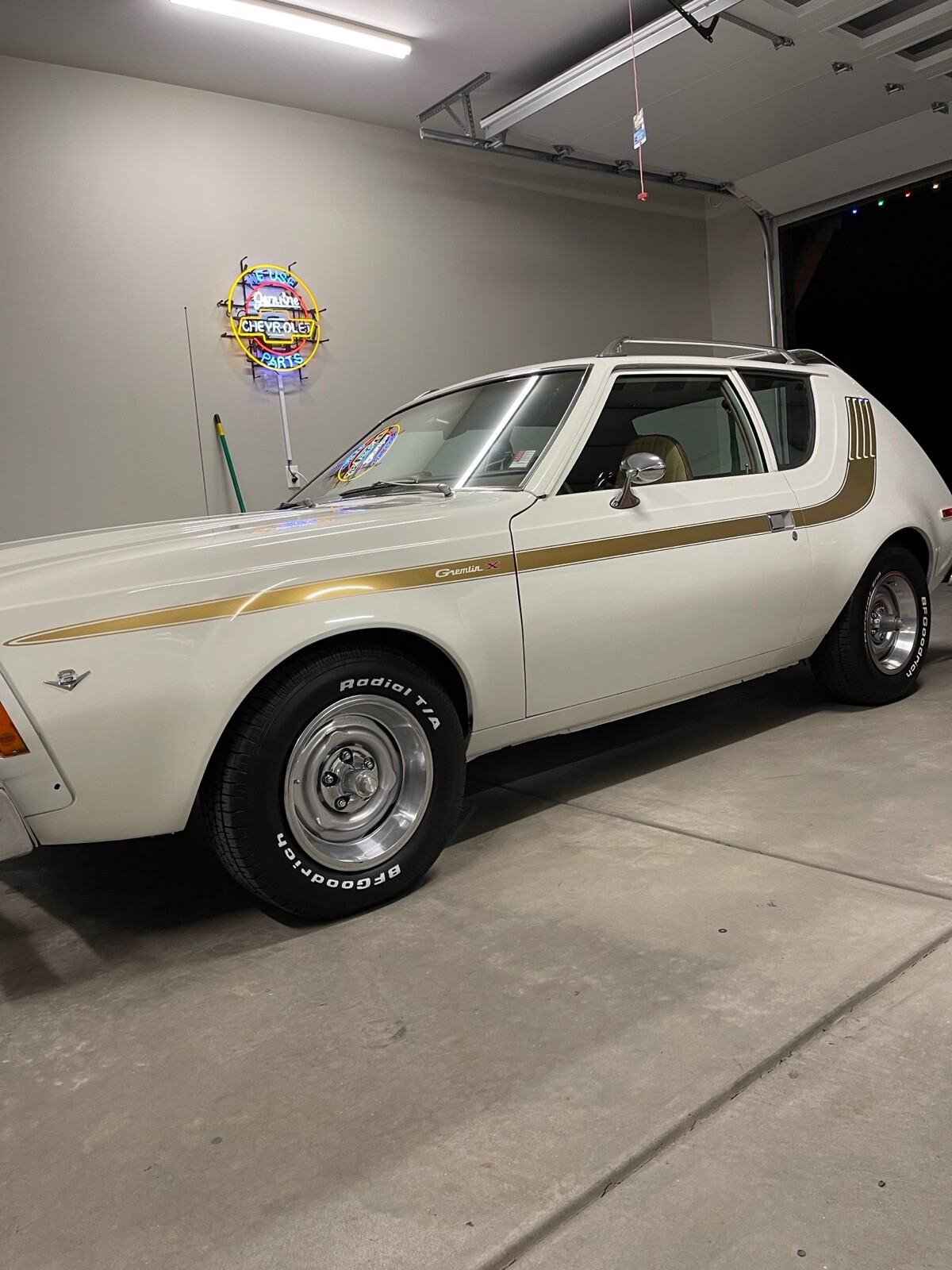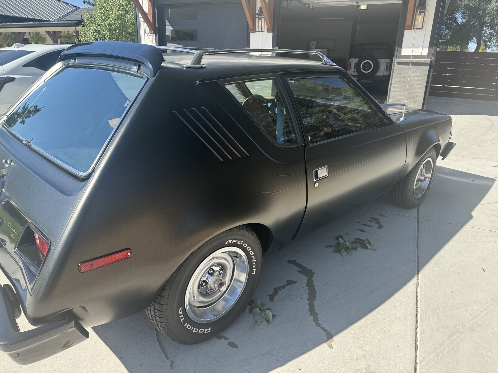 You are looking at a 1974 gremlin X originally white wrapped in satin black Metallic. We added front disk breaks and a Delphi electric fuel pump for reliability. New carpet and had the seats redone. New seals around the doors and rear glass.