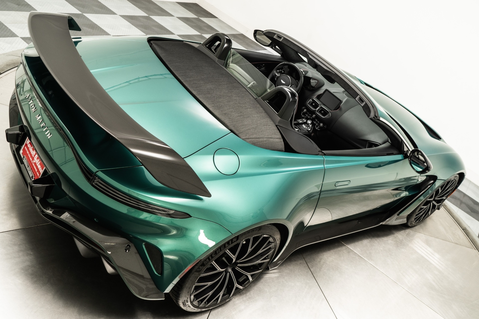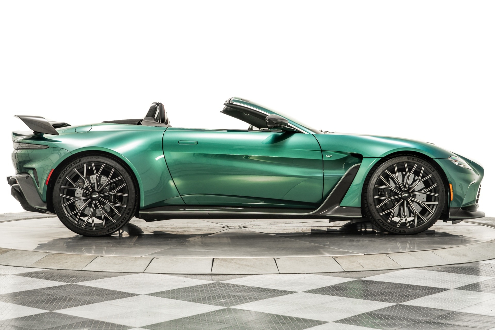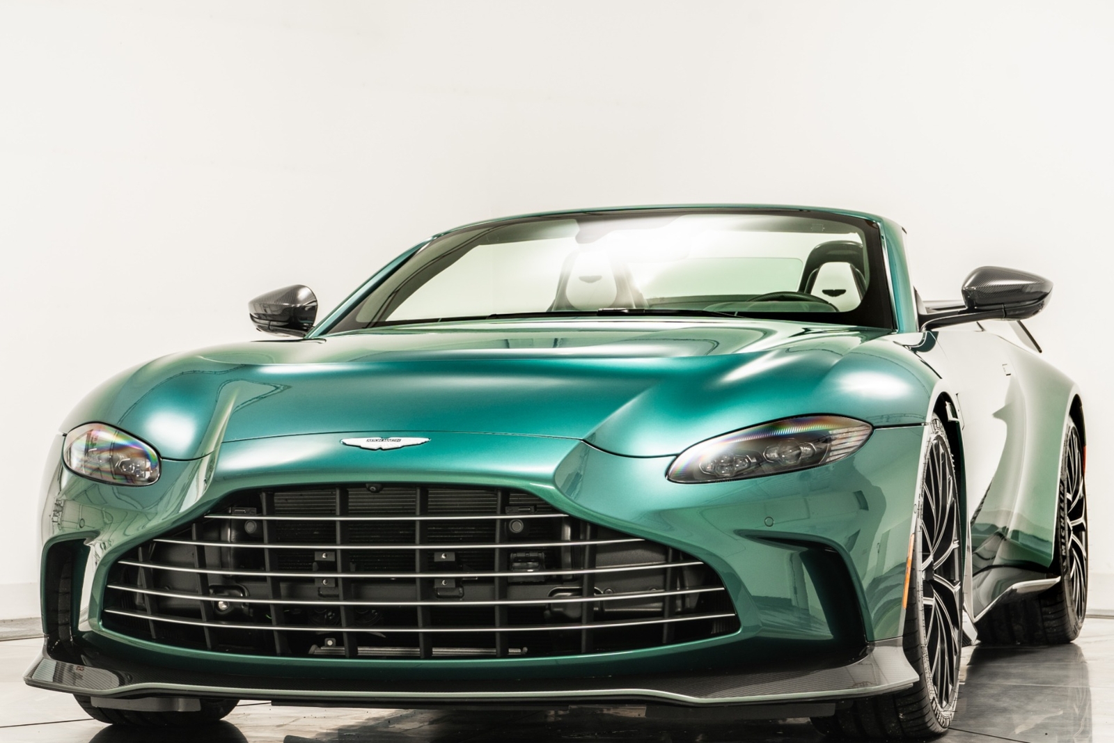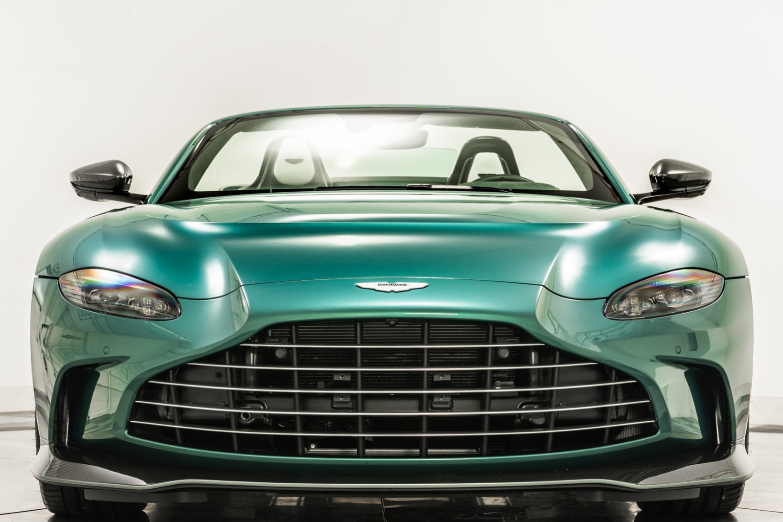 We have just added to our extensive exotic car inventory a beautiful 2023 Aston Martin Vantage V12 Roadster in Aston Martin Racing Green over Onyx Black and Light Argento Metallic leather interior and only 914 original miles. This Vantage is loaded with: 5.2 liter twin turbo V12 with 590 horsepower, 8 speed automatic transmission, 21 inch Y spoke matte black and diamond turned wheels, carbon fiber lower pack, paint color from the Racing Line collection, pinstripe livery, smoked rear lamps, lightweight carbon fiber seats, Alcantara and semi aniline leather duotone color scheme, contemporary leather color, contrast stitching, 2x2 twill carbon fiber interior trim, Aston Martin premium audio, AML special color black and silver convertible top, battery charger, floor mats and much more. This is #218 of only 249 V12 Roadsters built for the world. The MSRP was a massive $415,386, more than triple the cost of a base model Vantage convertible.