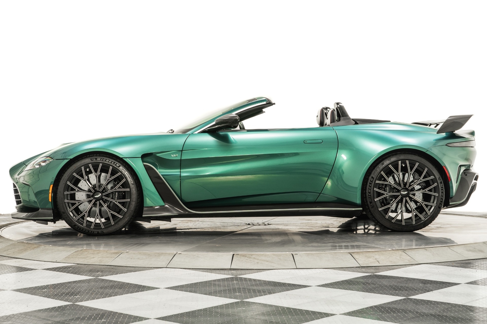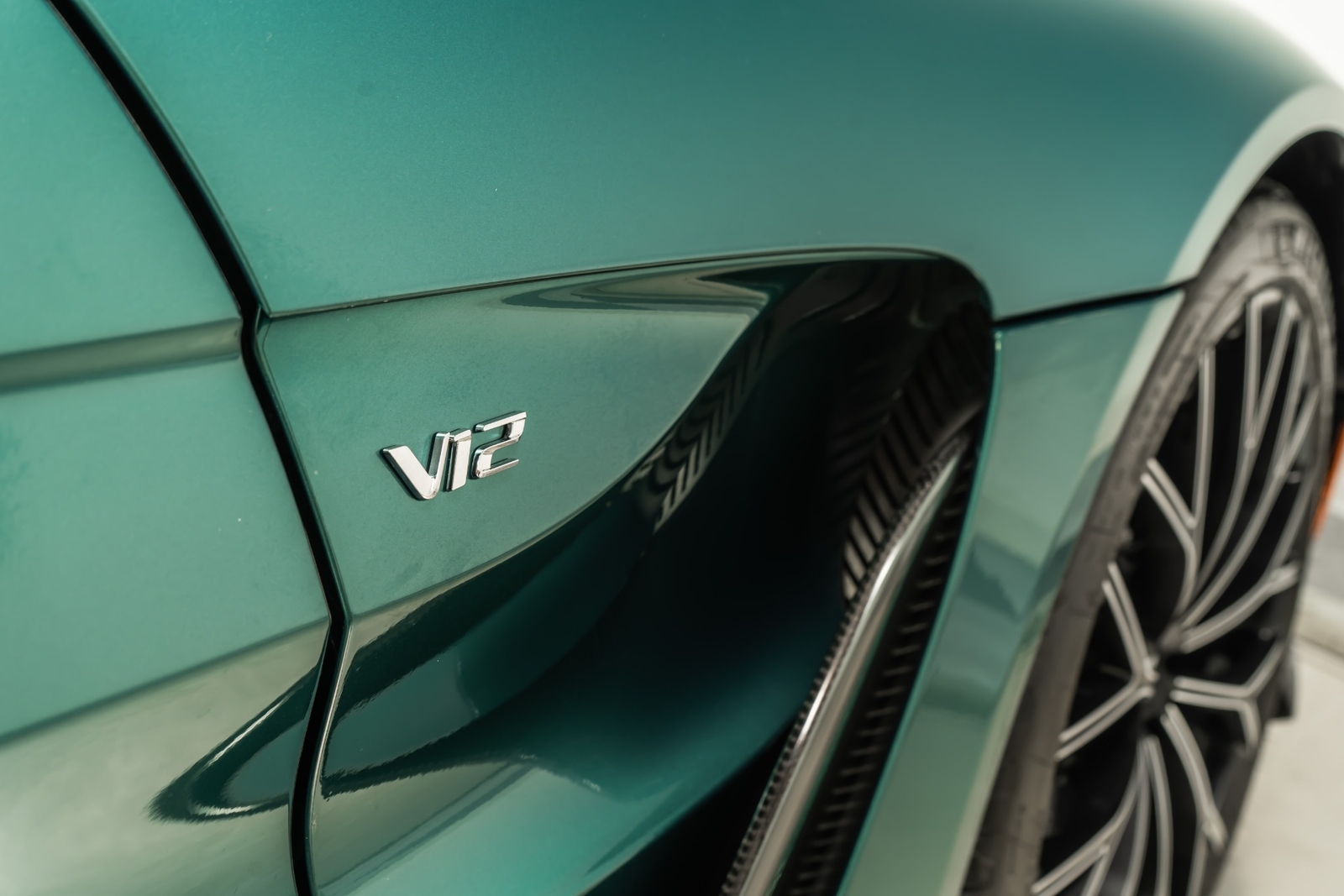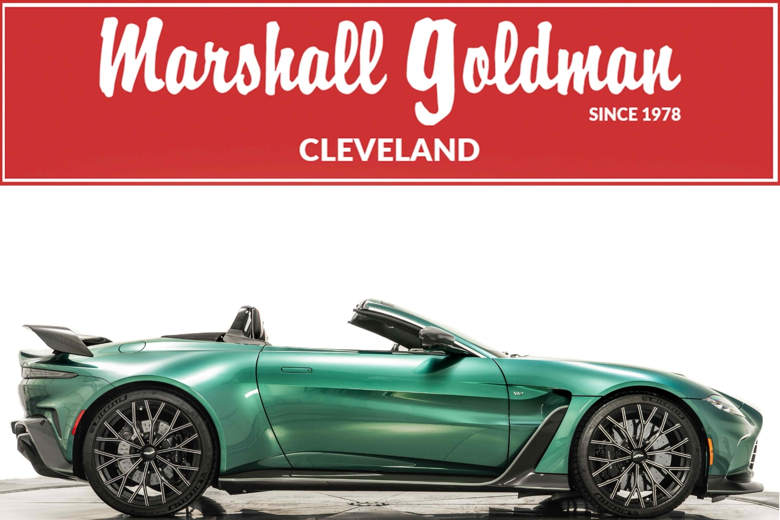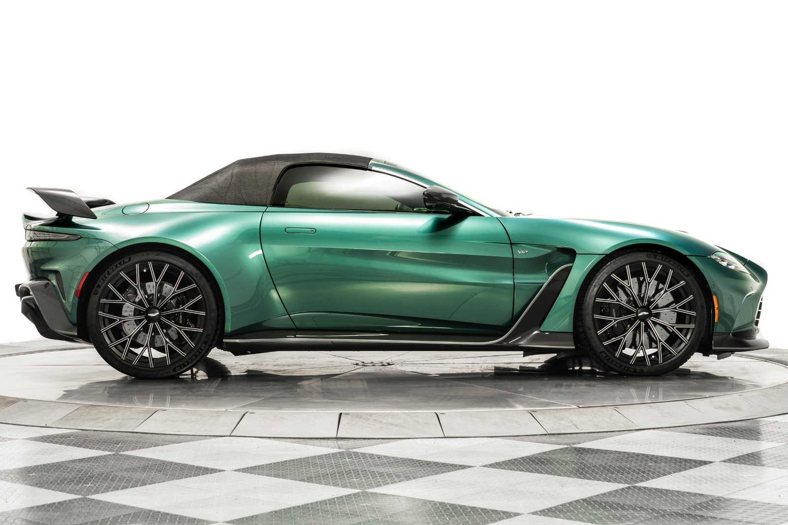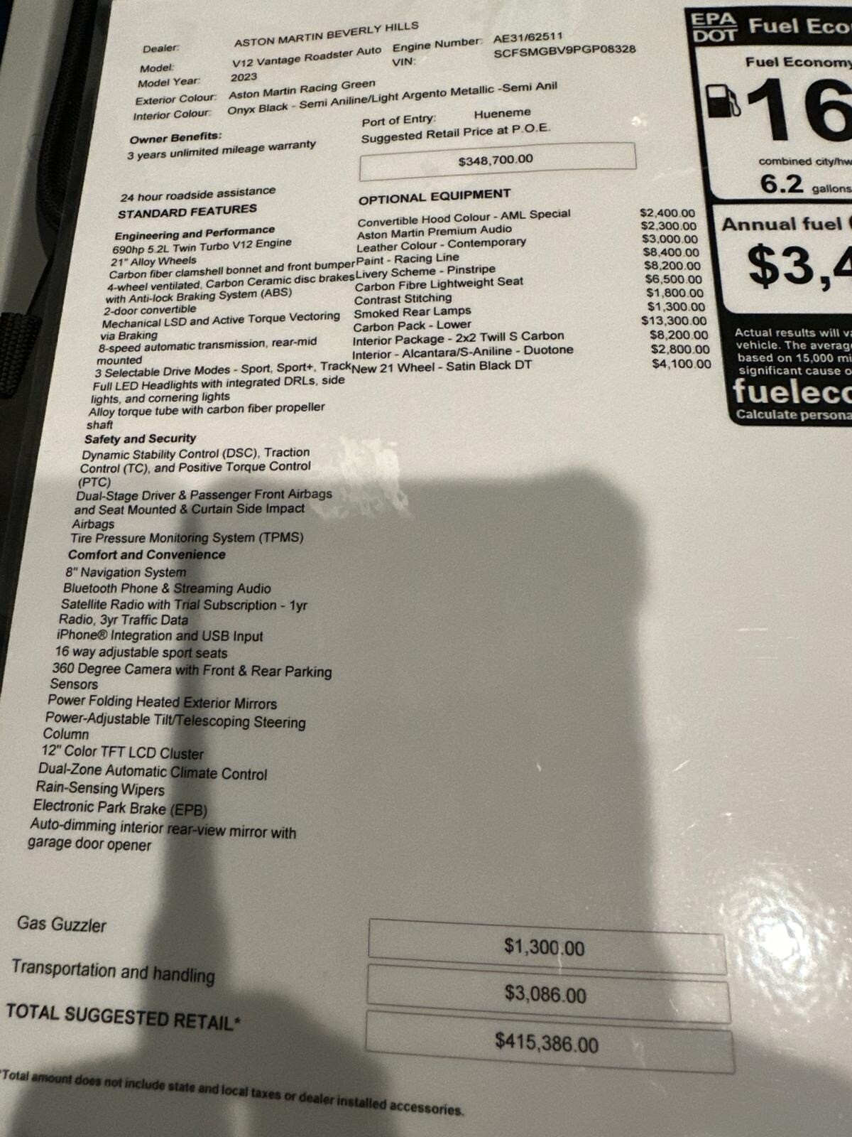 We have just added to our extensive exotic car inventory a beautiful 2023 Aston Martin Vantage V12 Roadster in Aston Martin Racing Green over Onyx Black and Light Argento Metallic leather interior and only 914 original miles. This Vantage is loaded with: 5.2 liter twin turbo V12 with 590 horsepower, 8 speed automatic transmission, 21 inch Y spoke matte black and diamond turned wheels, carbon fiber lower pack, paint color from the Racing Line collection, pinstripe livery, smoked rear lamps, lightweight carbon fiber seats, Alcantara and semi aniline leather duotone color scheme, contemporary leather color, contrast stitching, 2x2 twill carbon fiber interior trim, Aston Martin premium audio, AML special color black and silver convertible top, battery charger, floor mats and much more. This is #218 of only 249 V12 Roadsters built for the world. The MSRP was a massive $415,386, more than triple the cost of a base model Vantage convertible.