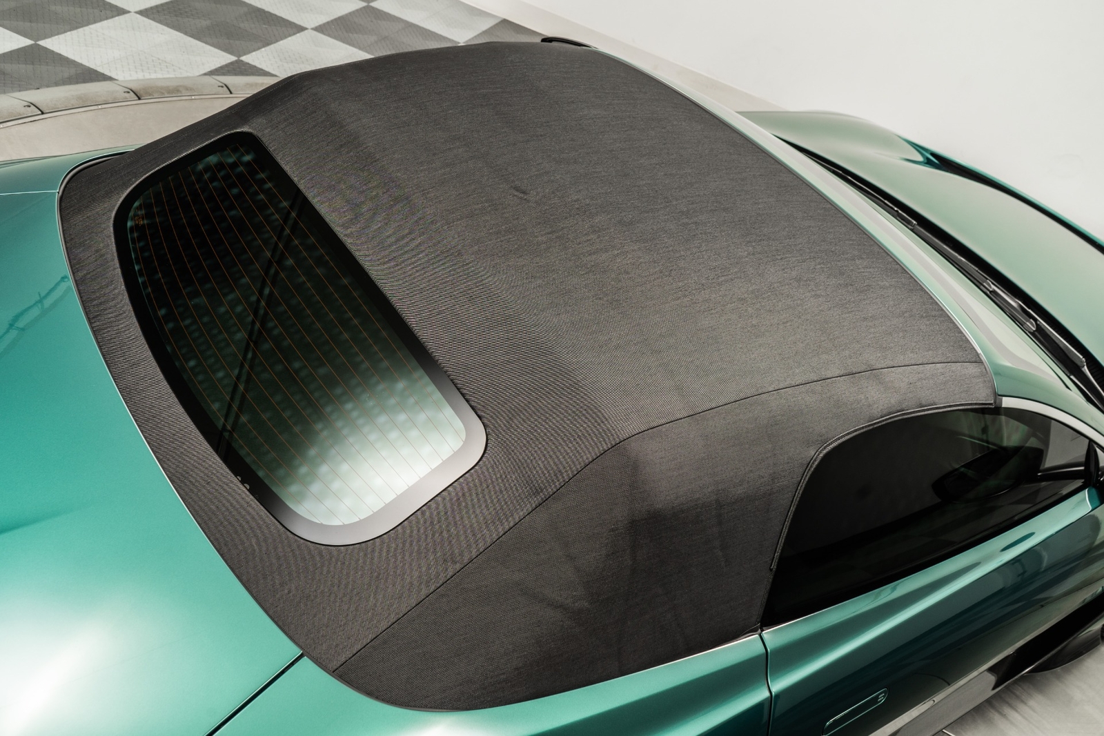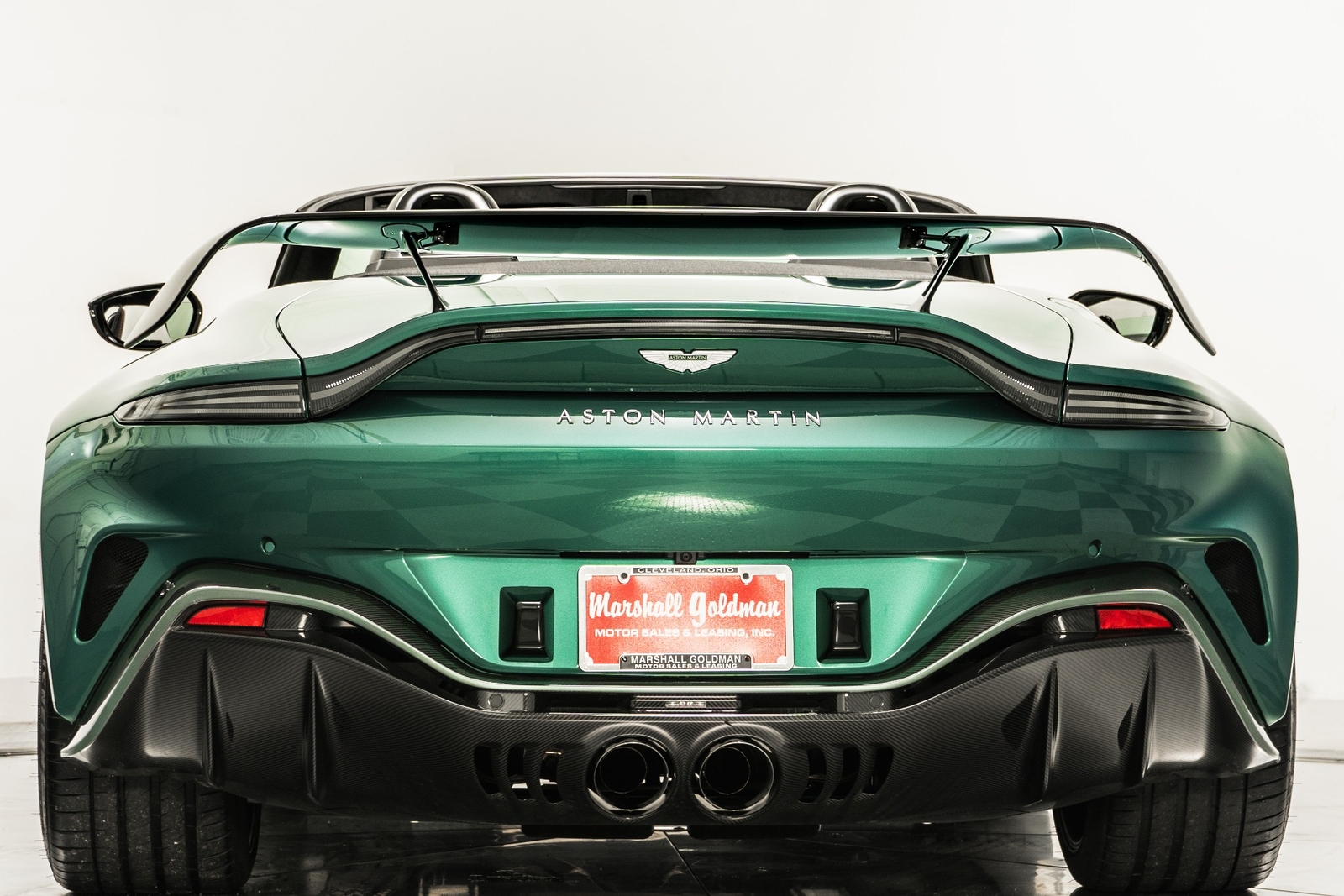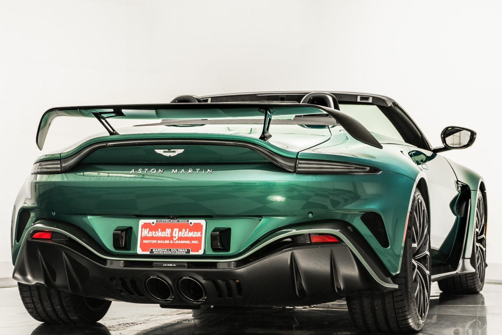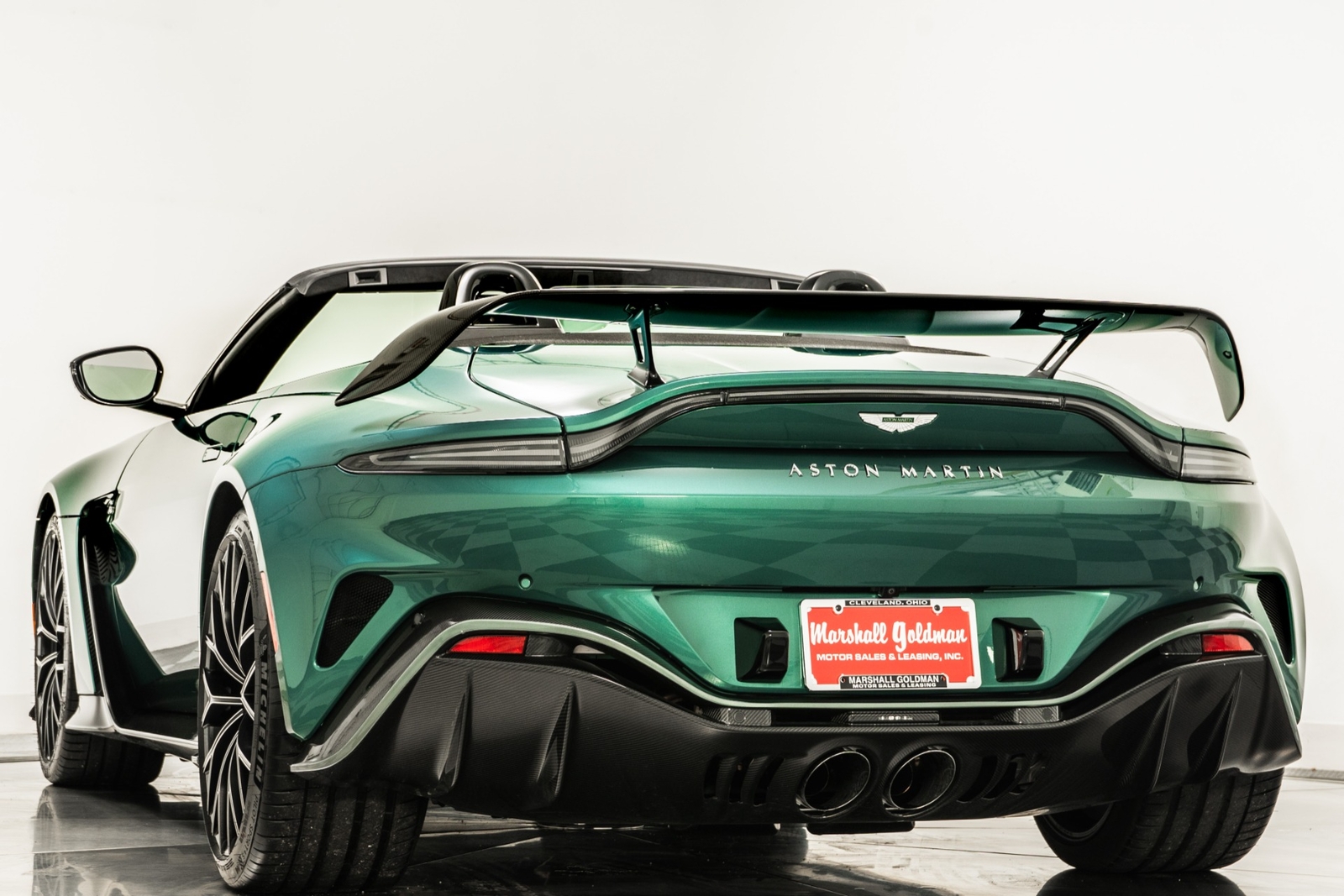 We have just added to our extensive exotic car inventory a beautiful 2023 Aston Martin Vantage V12 Roadster in Aston Martin Racing Green over Onyx Black and Light Argento Metallic leather interior and only 914 original miles. This Vantage is loaded with: 5.2 liter twin turbo V12 with 590 horsepower, 8 speed automatic transmission, 21 inch Y spoke matte black and diamond turned wheels, carbon fiber lower pack, paint color from the Racing Line collection, pinstripe livery, smoked rear lamps, lightweight carbon fiber seats, Alcantara and semi aniline leather duotone color scheme, contemporary leather color, contrast stitching, 2x2 twill carbon fiber interior trim, Aston Martin premium audio, AML special color black and silver convertible top, battery charger, floor mats and much more. This is #218 of only 249 V12 Roadsters built for the world. The MSRP was a massive $415,386, more than triple the cost of a base model Vantage convertible.