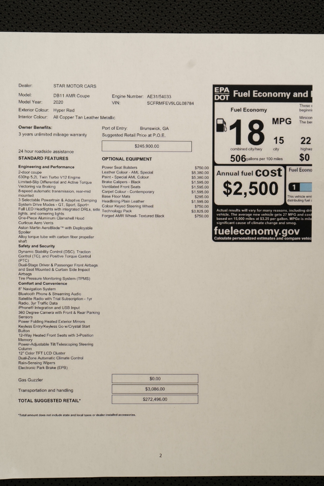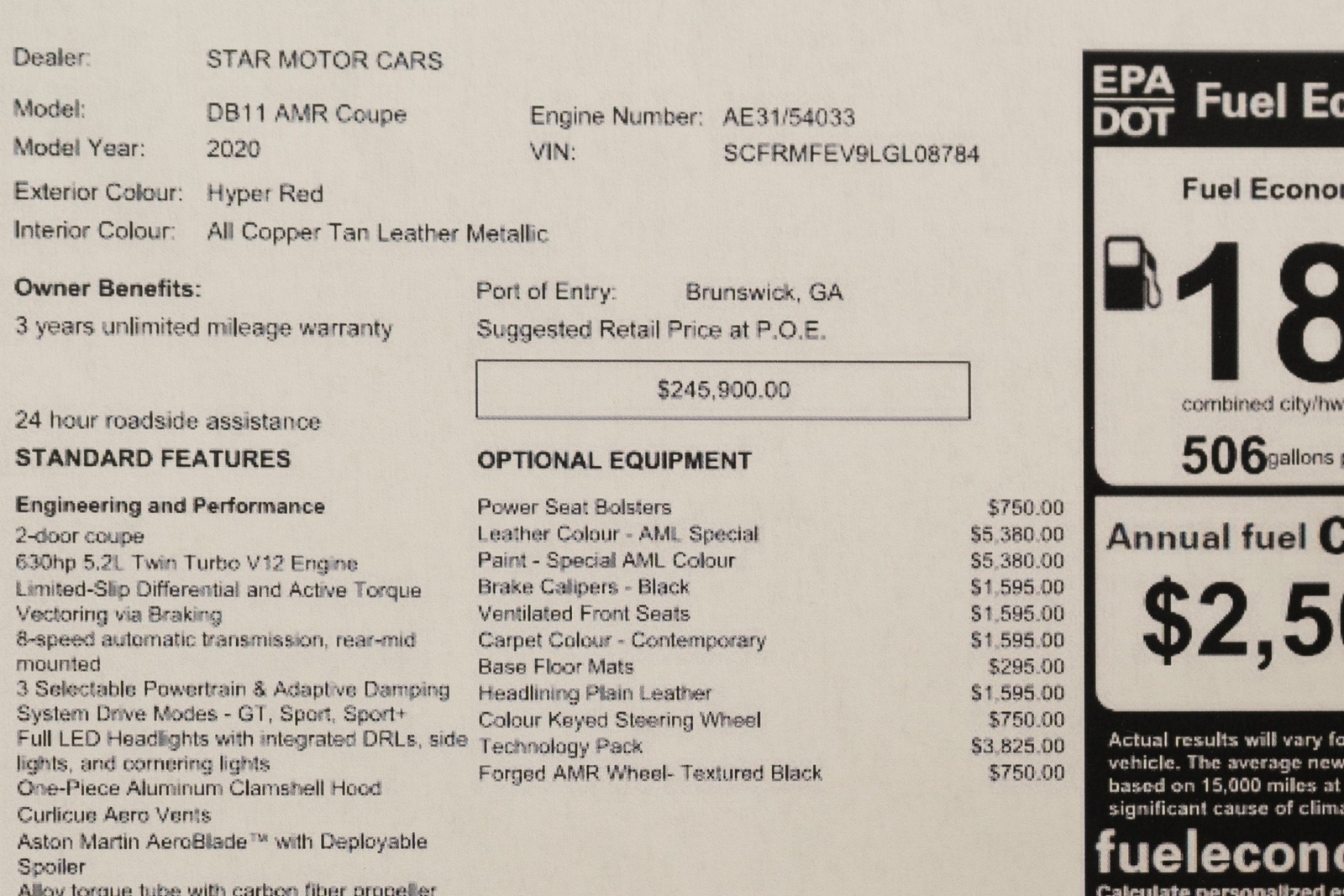 We have just added to our extensive exotic car inventory a beautiful 2020 Aston Martin DB11 AMR in Hyper Red over Copper Tan Metallic leather with only 3,647 miles. This DB11 is loaded with: 5.2 Liter twin turbo V12 with 630 horsepower, 8 speed automatic transmission, forged AMR wheels in textured black, brake calipers in black, special AML color, special AML leather color, heated and ventilated front seats, headlining in leather, technology pack, color keyed steering wheel, navigation, carpet color-contemporary, floor mats and much more. The original MSRP was $272,496.