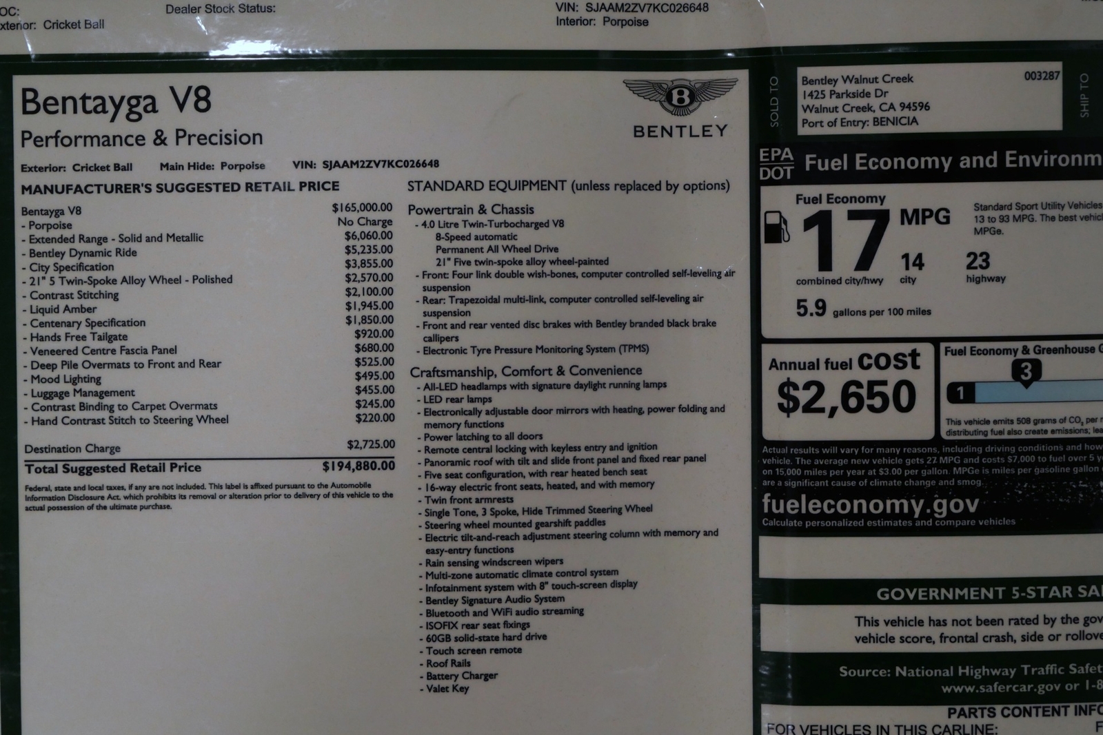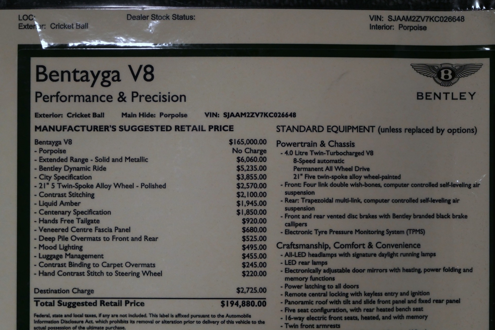 We have just added to our extensive exotic car inventory a beautiful 2019 Bentley Bentayga in Cricket Ball with Porpoise leather interior and only 13,880 miles. This Bentayga is loaded with: 4.0 Liter twin turbo V8, automatic transmission, 21 inch polished wheels, extended range paint, Bentley dynamic ride, centenary specification, city specification, liquid amber veneers, veneered center fascia panel, contrast stitching, steering wheel with hand cross stitching, mood lighting, hands free tailgate, cargo management, all weather floor mats, battery charger and much more.