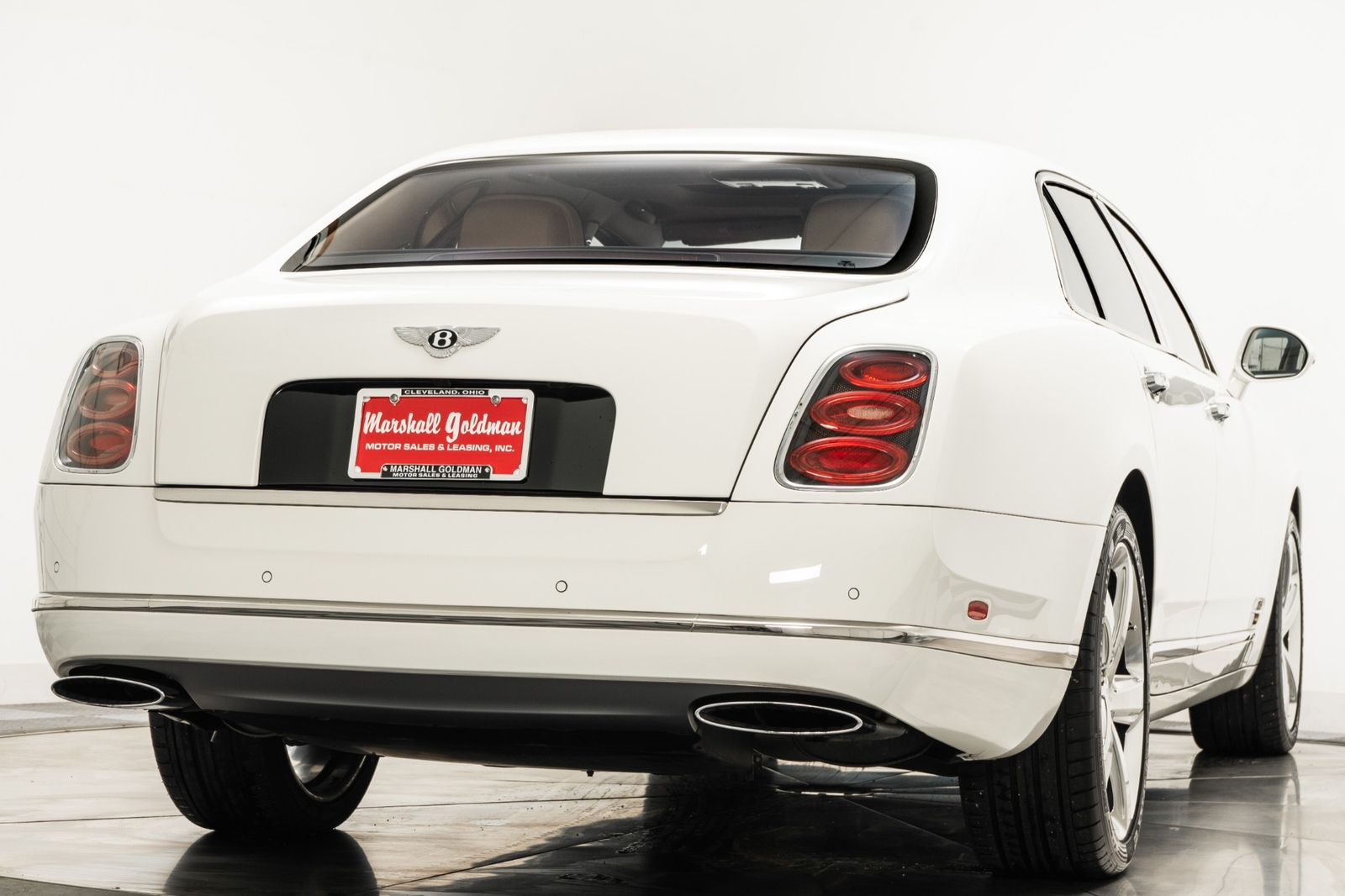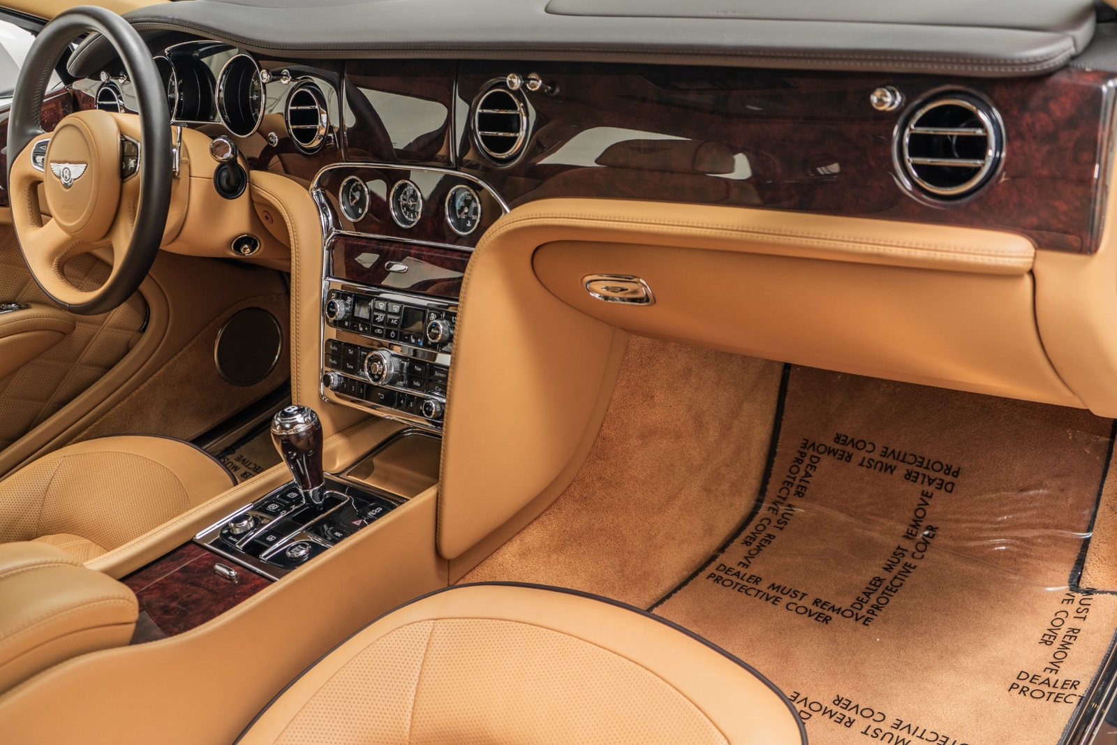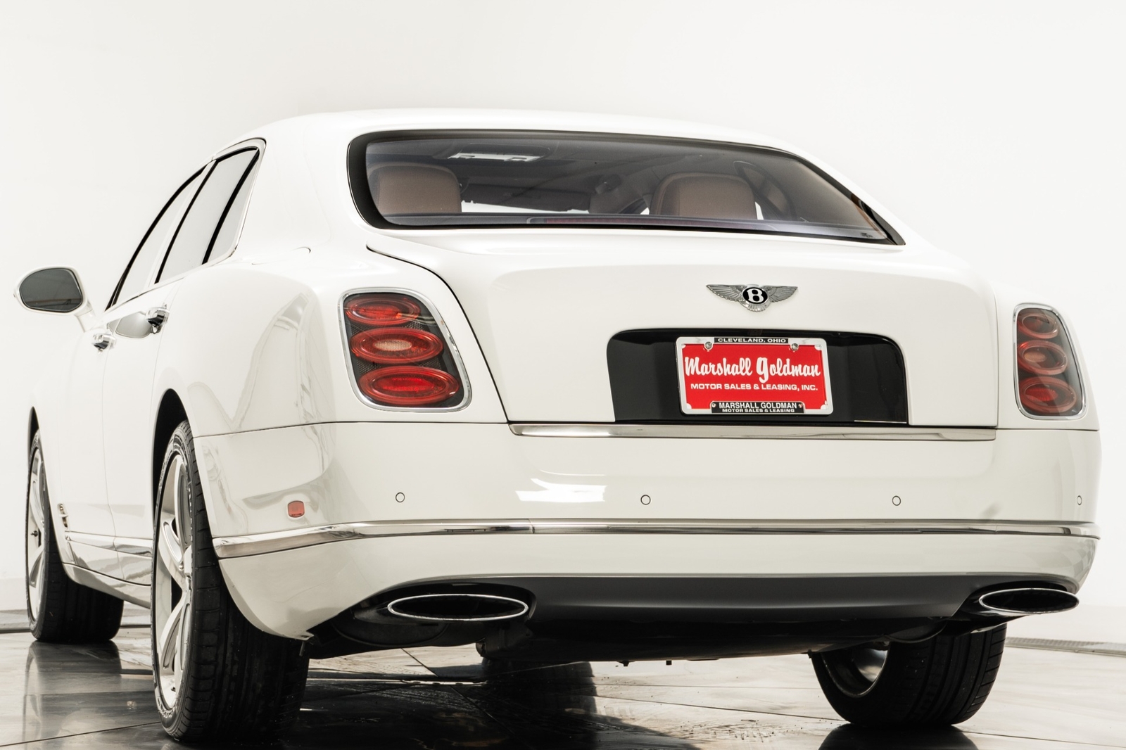 We have just added to our extensive exotic car inventory a beautiful 2016 Bentley Mulsanne Speed in Glacier White with Camel and Burnt Oak leather interior and only 25,943 miles. This Mulsanne is loaded with: 6.75 Litre twin turbo V8 with 530 horsepower and an earth-moving 811 lbs/ft of torque, automatic transmission, Speed Premier specification (21 inch polished Mulsanne Speed wheels, flying B radiator mascot, jewel fuel filler cap, rear view camera, remote opener for electronic garage door and gate, valet key, ambient interior mood lighting, shade band to tinted windscreen, twin illuminated fold down vanity mirrors, veneered iPod drawer and minor gauge panel, and ventilated seats with massage function), picnic tables, adaptive cruise control, comfort specification, picture frame style inlay to waistrails, veneered gear lever, rear quarter windows with veneer trim, WiFi hotspot, front and rear heated and ventilated seats, seat piping, bright stainless door pillar finishers, two city umbrellas, deep pile mats front and rear, navigation, sunroof, surround view cameras and much more. The original MSRP was a massive $371,502!