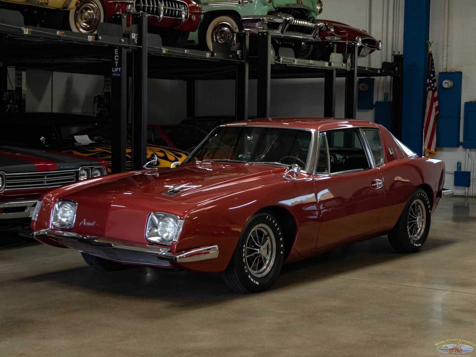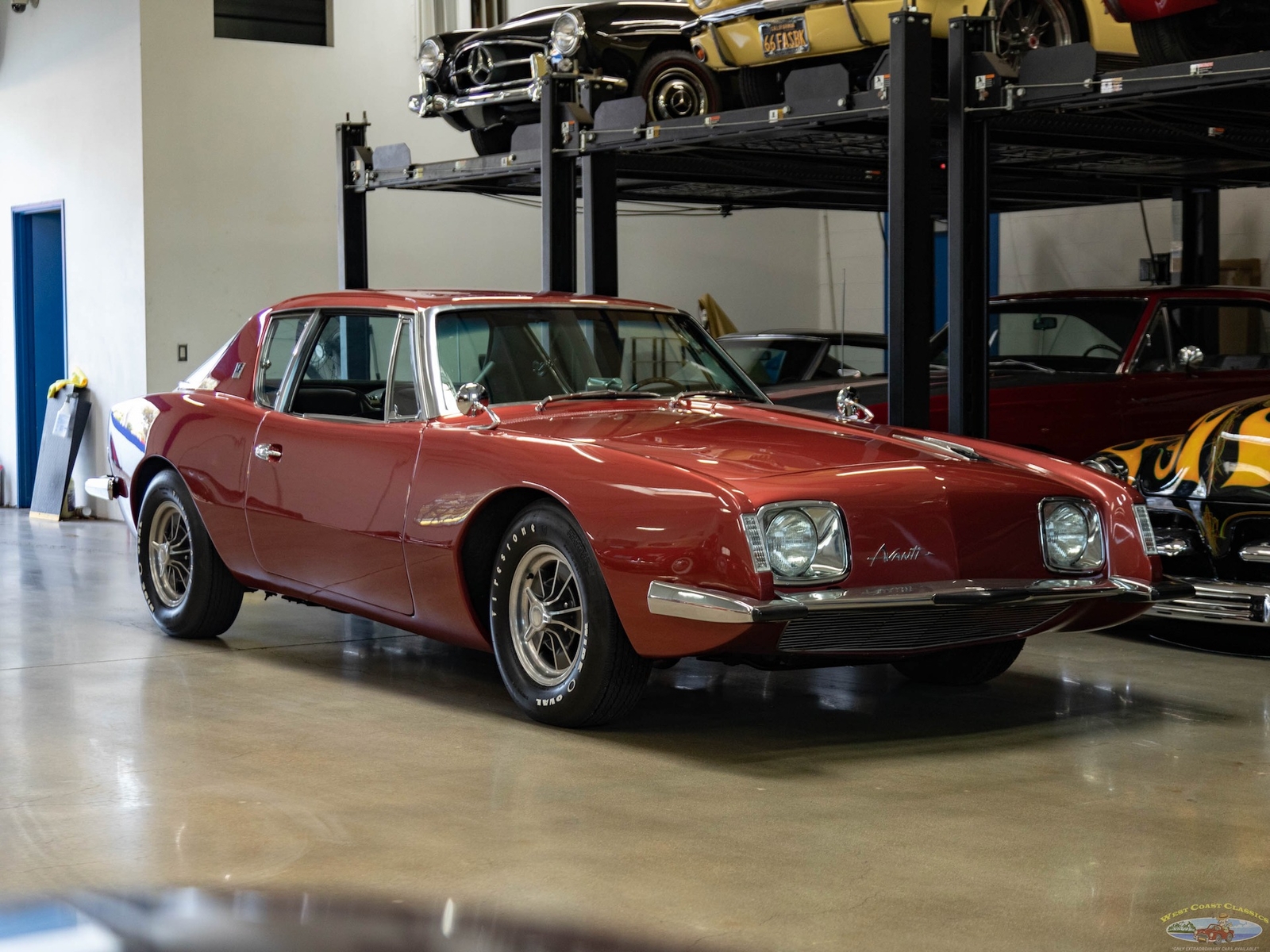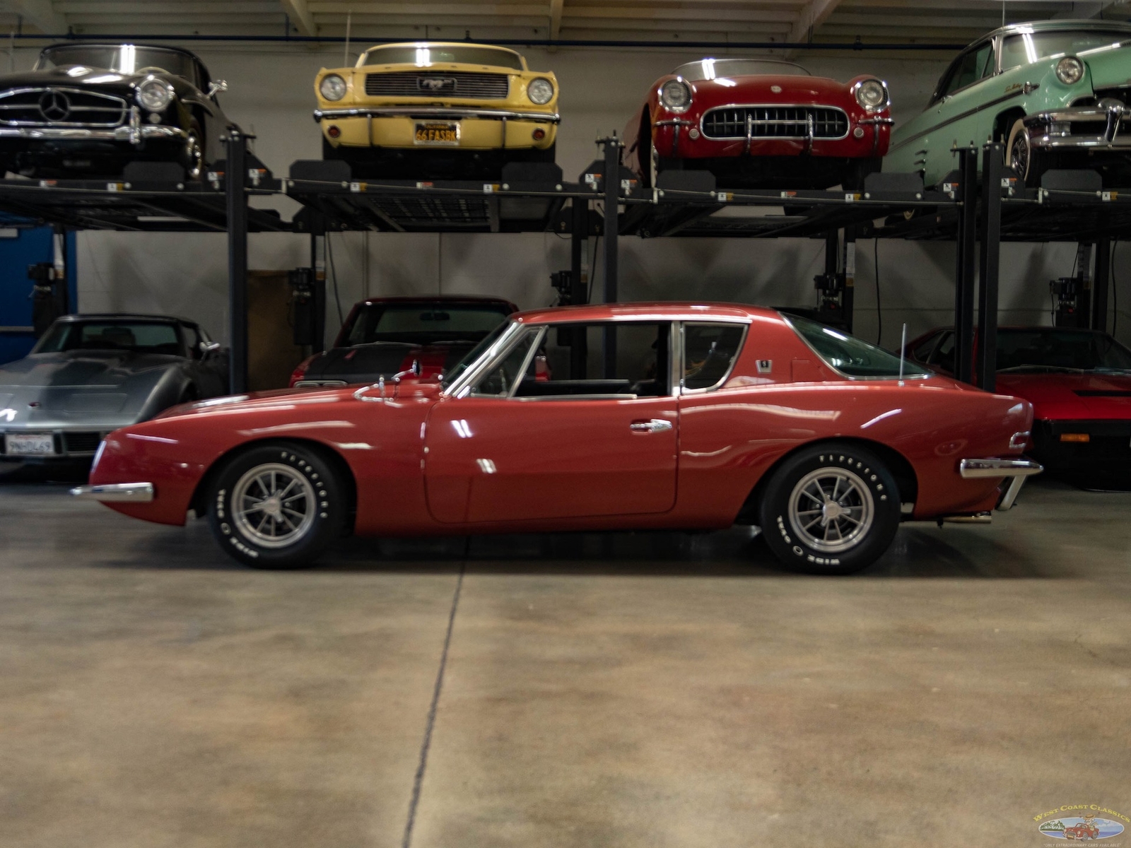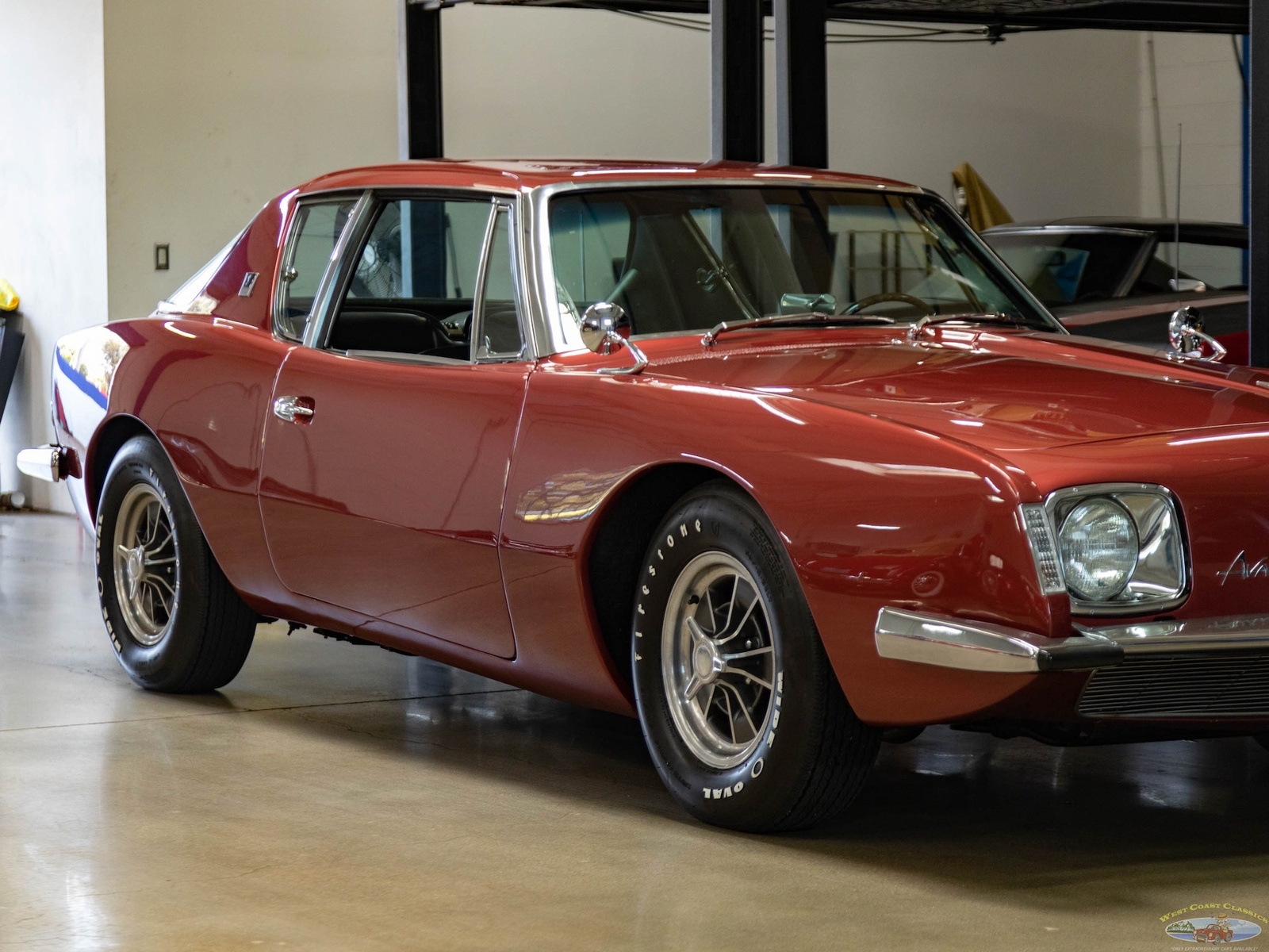 The 1963-64 Studebaker Avanti was amongst the most daring of 1960's American cars, a modern masterpiece which still seems contemporary today! Built with modern safety features such as a built in roll bar, padded interior and door latches that became structural body members when closed! A supercharged 289 V8 made the car one of the fastest cars built in its day with a top speed of over 168mph - a staggeringly fast speed for a production street car! Some 29 Bonneville speed records were set by a supercharged Avanti. This was also the first major fiberglass body four passenger car and also the first such car to use caliper style disc brakes and anti-sway bars front and rear. With only 3,834 models built in 1963 and even less, 809 in 1964, this car was to prove an instant collectible and has since reached certified 'Milestone Status'. Distinctive features abound such as a grille-less front end, asymmetrically placed hood bulge, shaped windows with large glass areas, a short rounded tail end, aircraft-like cockpit instrumentation and controls, slim section bucket seats and a padded roll bar.