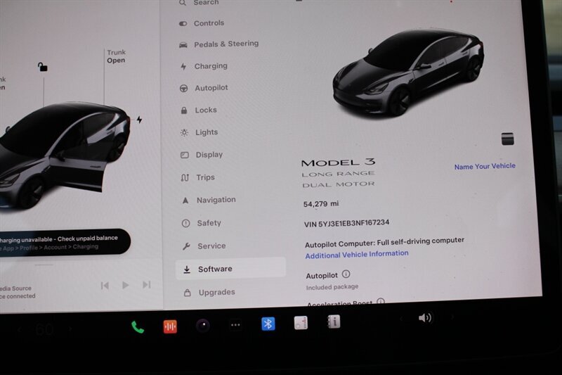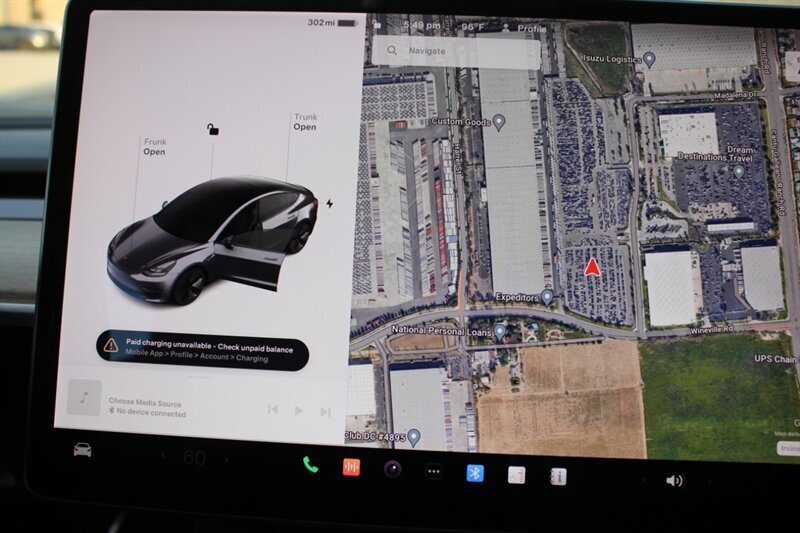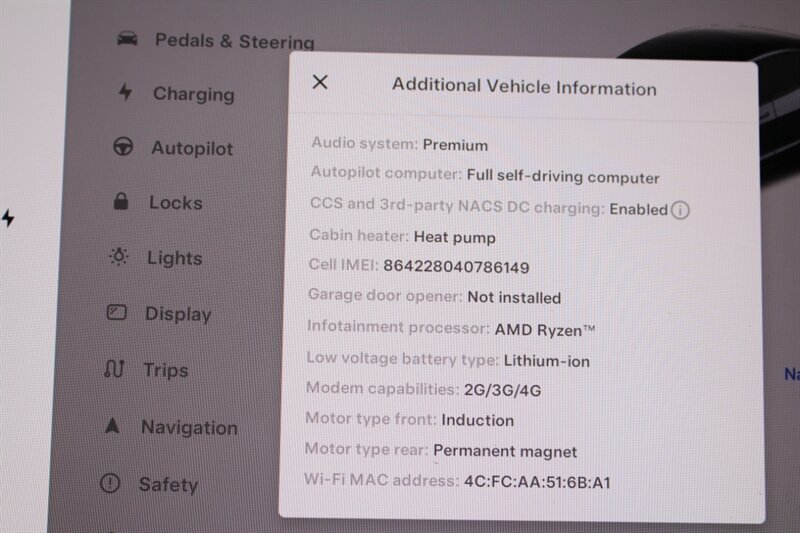 INSTALLED FEATURES: Air filtration, Front air conditioning: automatic climate control, Front air conditioning zones: dual, Rear vents: second row, Airbag deactivation: occupant sensing passenger, Front airbags: dual, Knee airbags: dual front, Side airbags: front, Side curtain airbags: front / rear, Antenna type: element, Auxiliary audio input: Bluetooth / USB, Internet radio app: Slacker / Spotify / TuneIn, Radio: FM / HD radio / touch screen display / voice operated, Radio data system, Subwoofer: 1, Total speakers: 14, Watts: 560, ABS: 4-wheel, Braking assist, Electronic brakeforce distribution, Electronic parking brake, Front brake diameter: 12.6, Front brake type: ventilated disc, Front brake width: 0.98, Power brakes, Rear brake diameter: 13.2, Rear brake type: ventilated disc, Rear brake width: 0.79, Regenerative braking system, Armrests: rear center with cupholders / rear folding, Center console trim: leatherette, Door trim: faux suede, Floor mat material: carpet, Floor material: cargo area carpet / carpet, Floor mats: front / rear, Heated steering wheel, Interior accents: metallic-tone / wood, Steering wheel trim: leatherette, Adaptive cruise control, Adaptive stop and go cruise control: fully automated, Ambient lighting, Cargo area light, Cargo cover: hard, Center console: front console with armrest and storage, Cupholders: front / rear, Easy entry: power driver seat / power steering wheel, Memorized settings: 10 driver / audio system / driver seat / side mirrors / steering wheel, Multi-function remote: proximity entry system / trunk release / vehicle and key memory, One-touch windows: 4, Power outlet(s): 12V front / USB front / USB-C front / USB-C rear, Power steering: variable/speed-proportional, Power windows: lockout button, Reading lights: front / rear, Rearview mirror: auto-dimming, Steering wheel: power tilt and telescopic, Steering wheel mounted controls: air conditioning / audio / cruise control / multi-function / phone / voice control, Storage: accessory hook / door pockets, Universal remote transmitter: Homelink - garage door opener, Vanity mirrors: dual illuminating, Wireless charging station: front, 4WD type: full time, Axle ratio: 9.00, Drive mode selector, Electric charge cord: 240 volt, Electric motor battery type: lithium ion, Electric motor charger connector: Tesla (SAE J3400), Electric motor charging time (240V): 10 hours, Electric Motor HP: 346, Electric motor miles per charge: 334, Electric Motor Power Output (Kilowatts): 258, Electric Motor Torque: 389, EV on-board charger rating: 11.5 kW, Door handle color: black, Front bumper color: body-color, Grille color: black, Mirror color: body-color, Rear bumper color: body-color, Rear spoiler: lip, Rear spoiler color: body-color, Rear trunk/liftgate: power operated, Window trim: black, EV battery capacity: 82 kWh, Infotainment screen size: 15 in., Clock, Compass, Digital odometer, External temperature display, Fuel economy display: range, Multi-function display, Trip odometer, Warnings and reminders: low battery, Daytime running lights: LED, Exterior entry lights: approach lamps / puddle lamps, Front fog lights: LED, Headlights: LED / auto delay off / auto high beam dimmer / auto on/off / self-leveling, Taillights: LED, Side mirror adjustments: power / power folding / reverse gear tilt, Side mirrors: auto-dimming / heated, Moonroof / Sunroof: panoramic, Automatic emergency braking: front / front pedestrian, Automatic hazard warning lights, Blind spot safety: sensor/alert, Camera system: front / rearview, Child safety door locks, Child seat anchors: LATCH system, Crumple zones: front, Dash camera: front recording / rear recording / side recording, Driver attention alert system, Emergency interior trunk release, Impact sensor: battery disconnect / door unlock / post-collision safety system, Lane deviation sensors, Lane keeping assist, Parking sensors: front / rear, Pedestrian safety sound generation, Pre-collision warning system: audible warning / pedestrian detection / visual warning, Rearview monitor: in dash, Traffic sign recognition: adaptive speed limiting, Emergency locking retractors: front / rear, Front seatbelts: 3-point, Rear seatbelts: 3-point, Seatbelt force limiters: front / rear, Seatbelt pretensioners: front / rear, Seatbelt warning sensor: front, Driver seat: heated, Driver seat power adjustments: 4-way power lumbar / height / reclining / 12, Front headrests: integrated / 2, Front seat type: bucket, Passenger seat: heated, Passenger seat power adjustments: 4-way power lumbar / height / reclining / 12, Rear headrests: fixed / 3, Rear seat: heated, Rear seat folding: split, Rear seat type: 60-40 split bench, Upholstery: leatherette, Anti-theft system: alarm / perimeter alarm / vehicle immobilizer, Power door locks: anti-lockout / auto-locking, Hill holder control, Stability control, Traction control, Turns lock-to-lock: 2.0, Front shock type: twin-tube gas, Front spring type: coil, Front stabilizer bar, Front struts, Front suspension classification: independent, Front suspension type: double wishbone, Rear shock type: twin-tube gas, Rear spring type: coil, Rear stabilizer bar, Rear struts, Rear suspension classification: independent, Rear suspension type: multi-link, Driver assistance app: roadside assistance, Electronic messaging assistance: voice operated, Hands-free phone call integration: voice operated, Navigation data: real time traffic / send destination to vehicle, Navigation system: touch screen display / voice operated, Smart device app compatibility: Tesla App, Smart device app function: camera system display / horn/light operation / lock operation / maintenance scheduling / maintenance status / phone as a key / security event/collision alert / vehicle location / window operation, Wi-Fi: hotspot compatible, Wireless data link: Bluetooth, Tire Pressure Monitoring System, Tire type: all season, Wheel covers: full, Wheels: aluminum alloy, Front wipers: rain sensing / speed sensitive / variable i