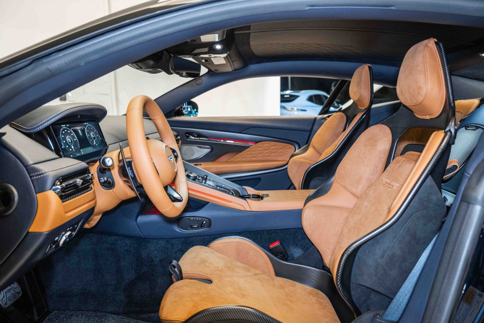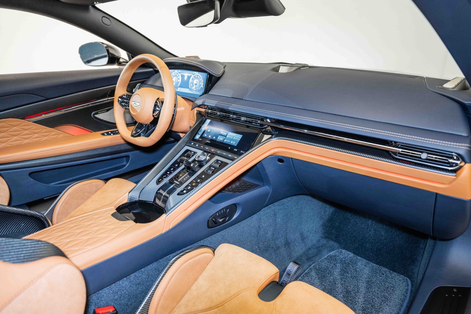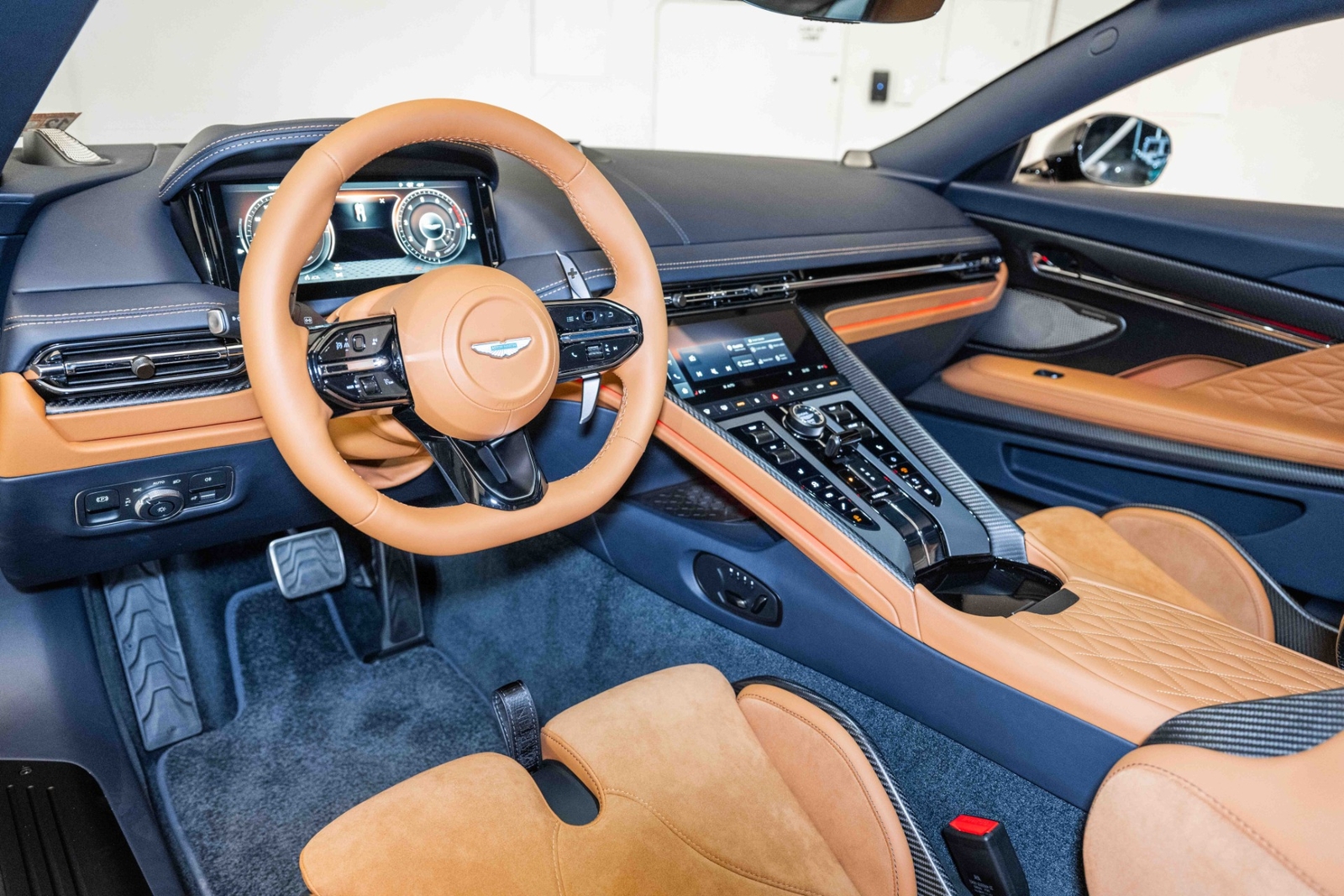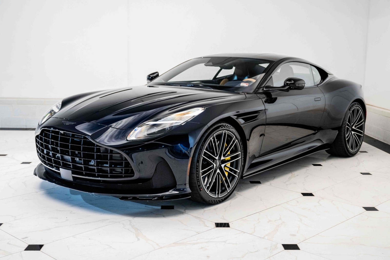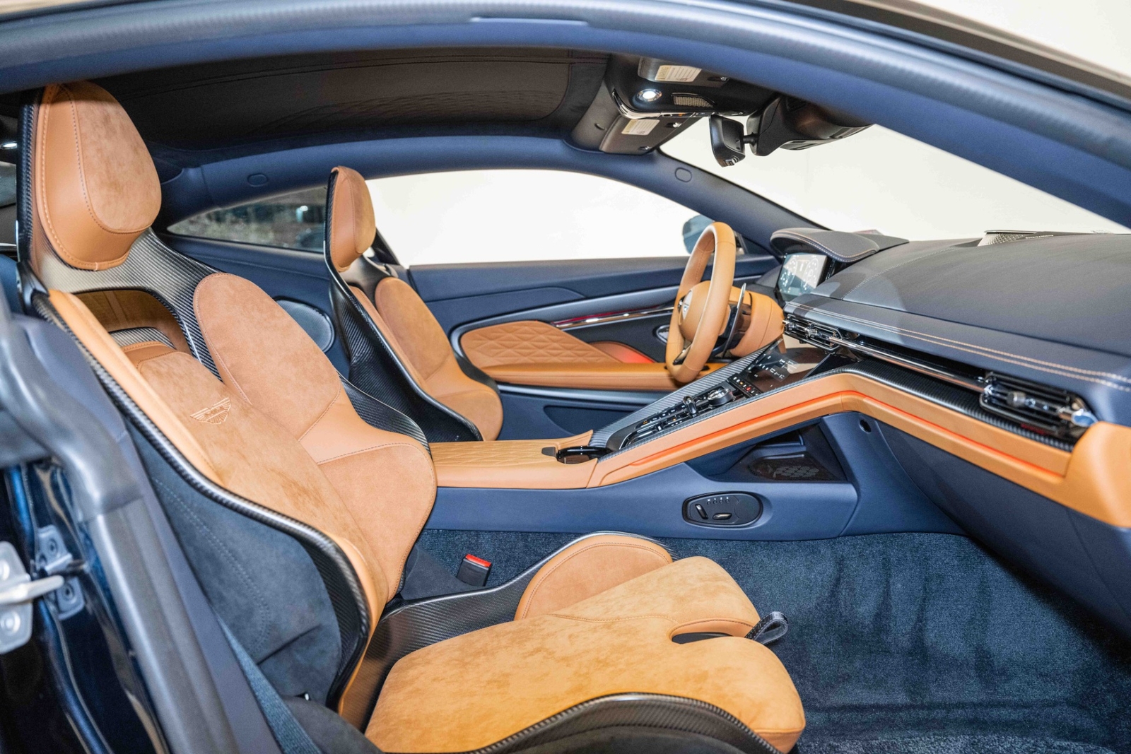 This 2024 Aston Martin DB12 V8 has 35 miles and comes in an Ultramarine Black on Dark Knight - Semi Aniline/Oxford Tan - Semi Aniline color combination.
