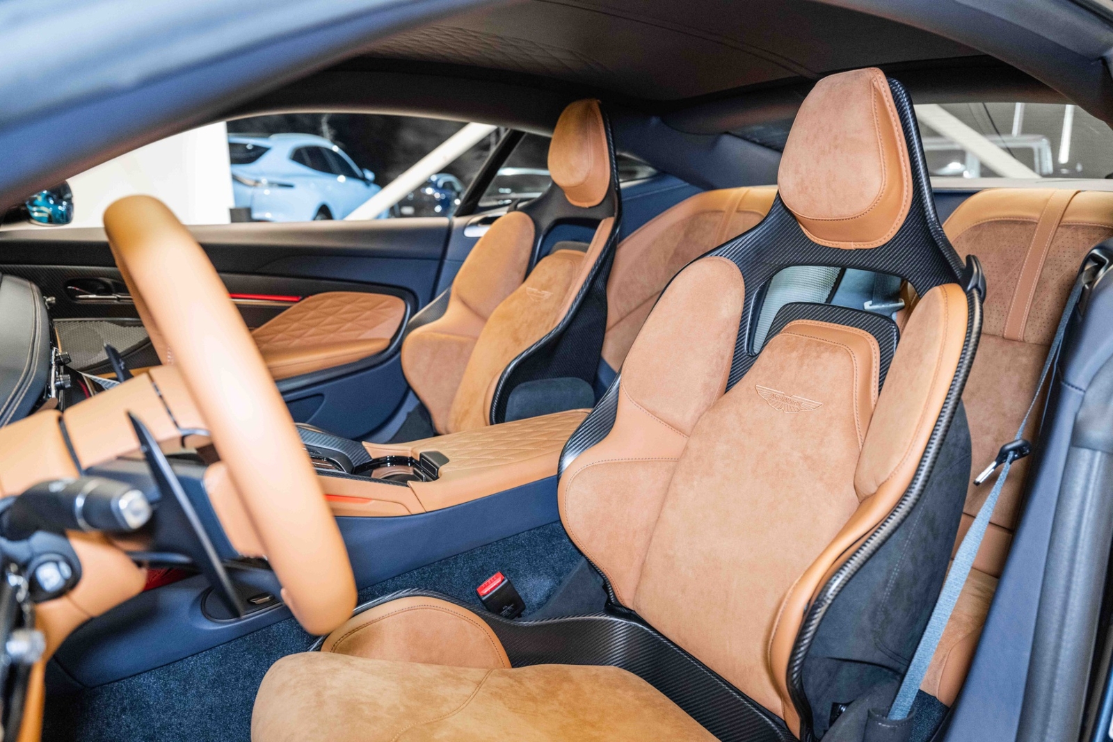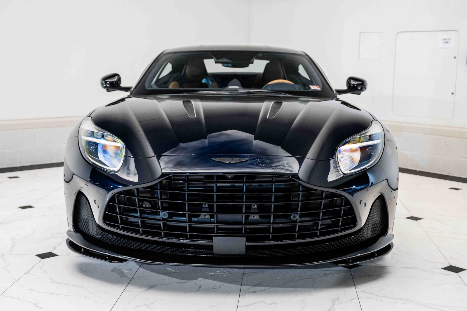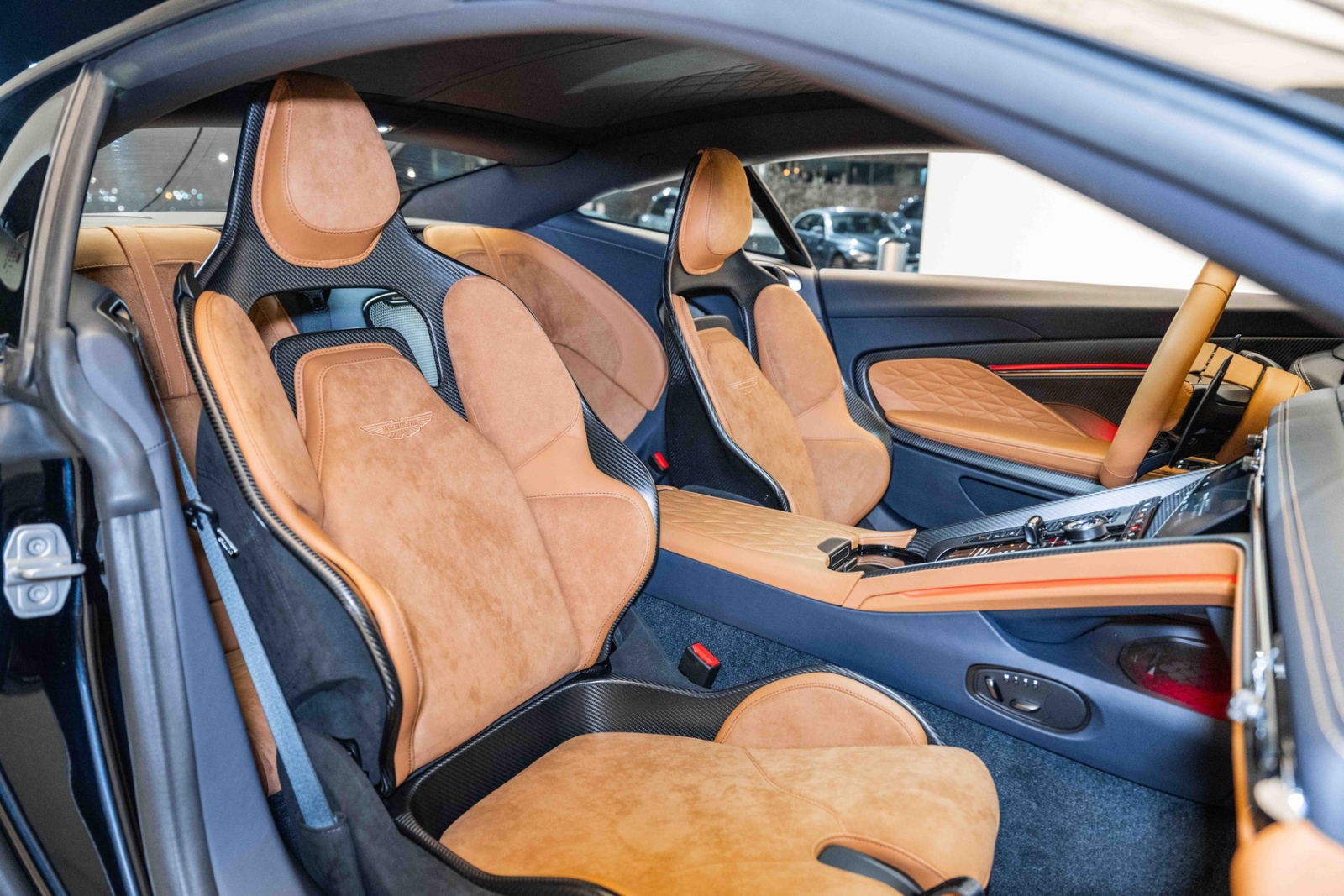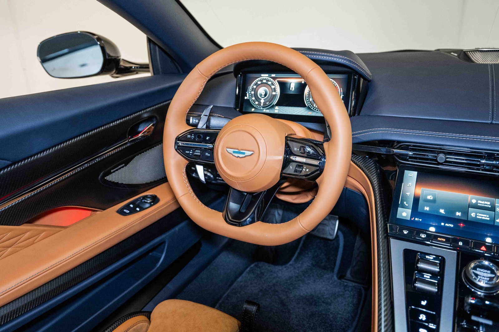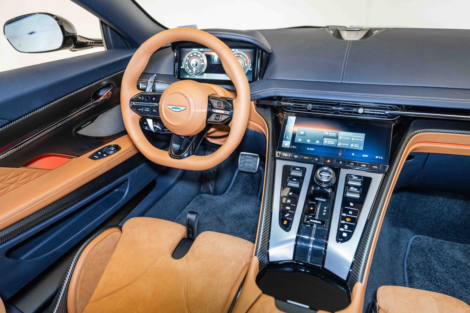 This 2024 Aston Martin DB12 V8 has 35 miles and comes in an Ultramarine Black on Dark Knight - Semi Aniline/Oxford Tan - Semi Aniline color combination.