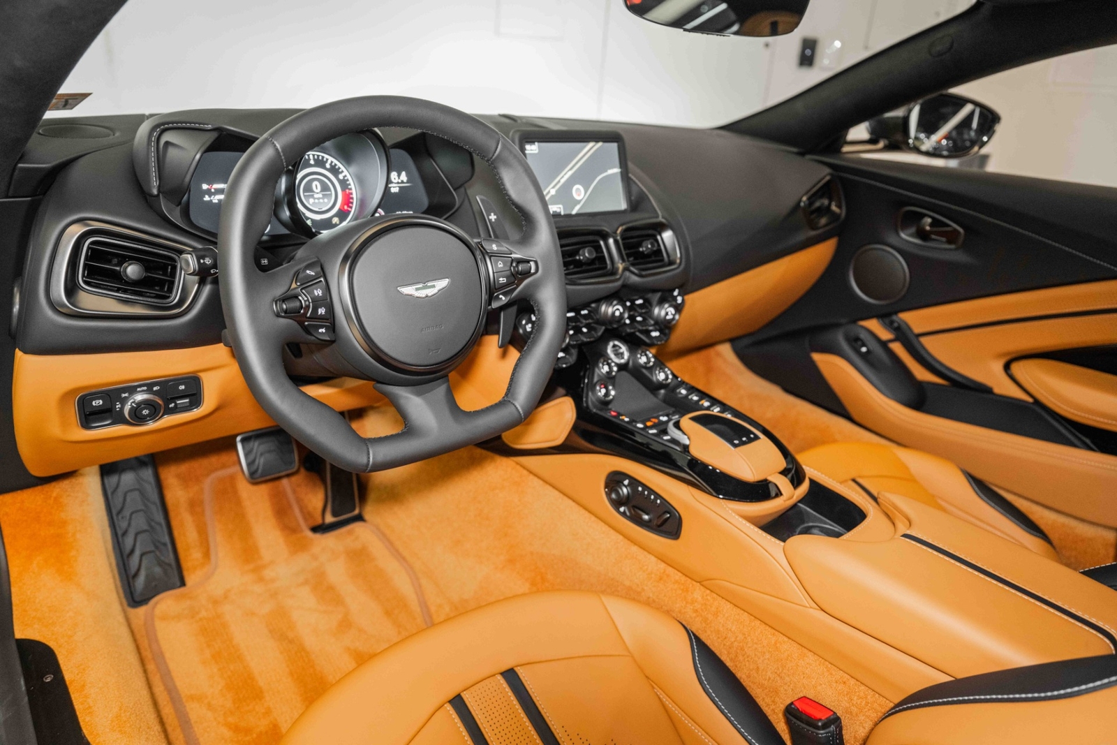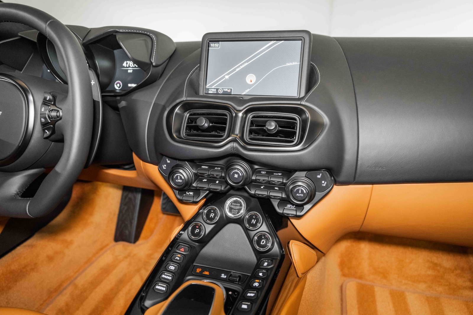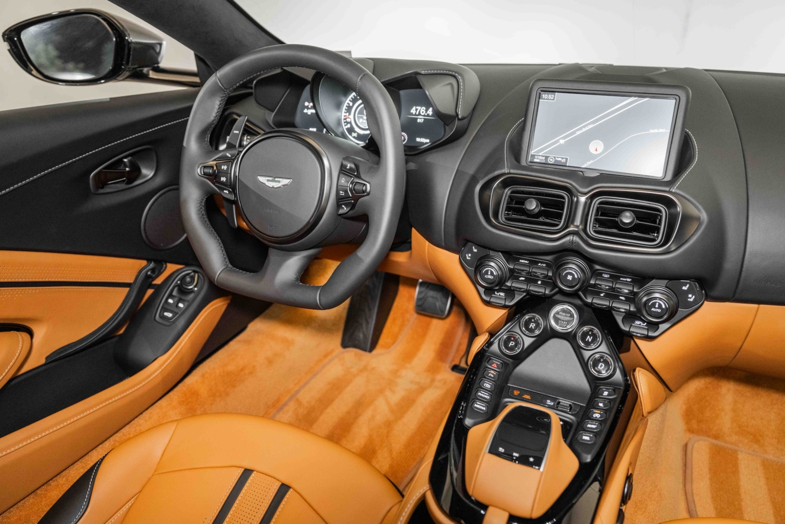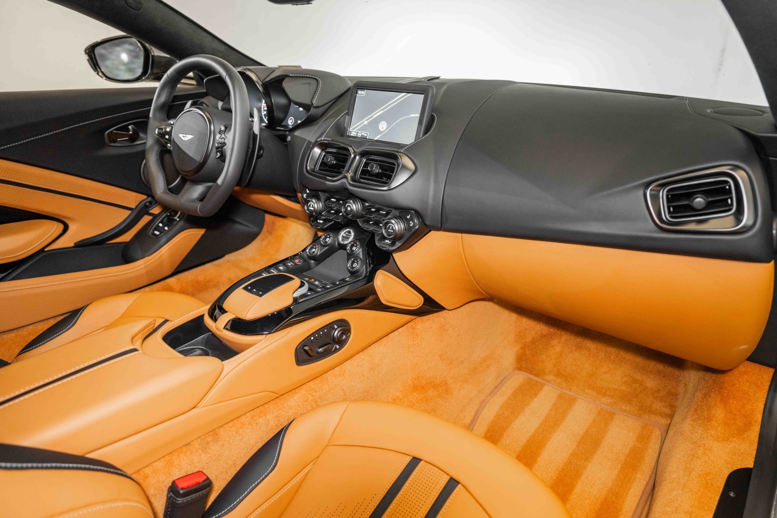 This Aston Martin has 519 miles and comes in a Titanium Grey on Onyx Black/Oxford Tan color combination.