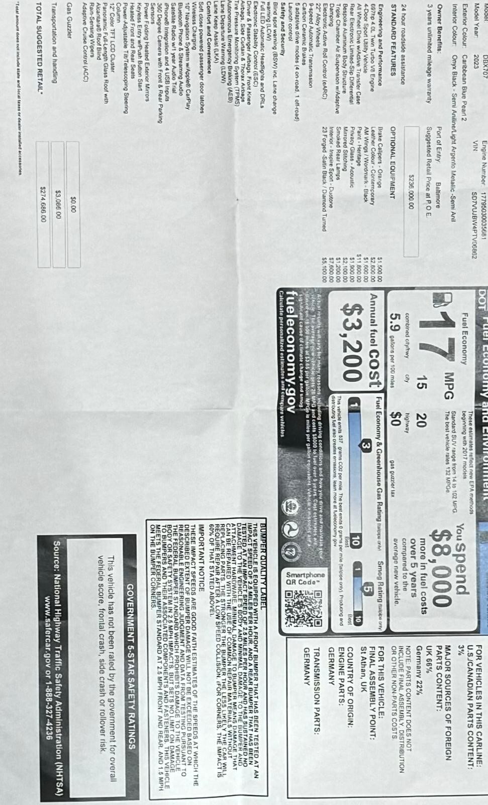 Immaculate, head turning DBX 707, Beautiful color match up and calipers, Note: tiny ding on door shown in the picture passenger backside door barely noticeable. Buy with confidence-- Under Aston Martin original warrantee. Amazing drive. Please contact us for any concerns, questions or additional information or pictures.