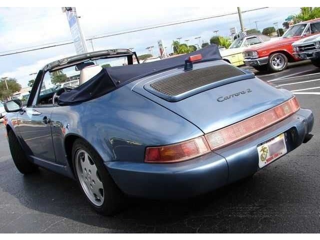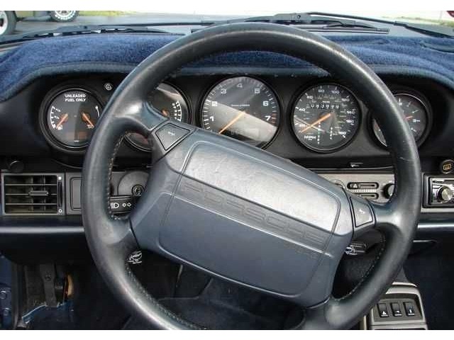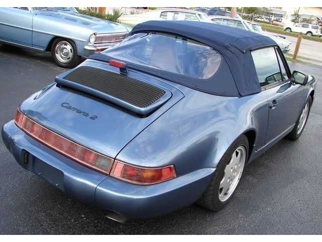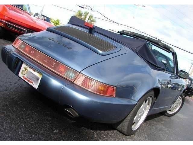 The 964 C2 is very heavily optioned. Finished in Baltic Blue metalic with gray dual full power seats and gorgeous navy power top. The 964 cabriolet runs and drives beautifully, no abs light issues, no delaminated gauges, no check engine lights on, no air bag lights on, NOTHING. Unlike most 964 she has nice red color tail lights with no spider cracks and no delamination in the tail light lenses. The center reflector is in pretty nice original condition with no chips in it. We found during our inspection of the 964 no prior accidents. The doors fit perfectly, they open and close properly, the hood gaps are perfect. She has her original hood build option decal intact, and a nice straight body. We found one very good repaint done to a nice standard. We found zero evidence of any panel replacemet, the rear lid panel has its decals and we see no evidence of any accidents there either. NONE. The 964 has original wheels with good thread with matching tires, properly functioning Air Conditioner and properly operating climate controls. The 964 comes with its Original dated and VIN stamped books, we received from the owner a huge stack of service records since new, It also has a matching navy blue boot cover. The new convertible top is properly functioning. Typical small crack on rear lift up wind deflector on engine lid like all 964 usually have. The 964 lived last in Florida (where the photos were taken). It has no under engine heat shield air tray, typically these create more heat under the engine and many 964 owners like them off. You can argue the keeping the tray on or off point/benefit with anyone and no one will agree yes keep it or no take it off.